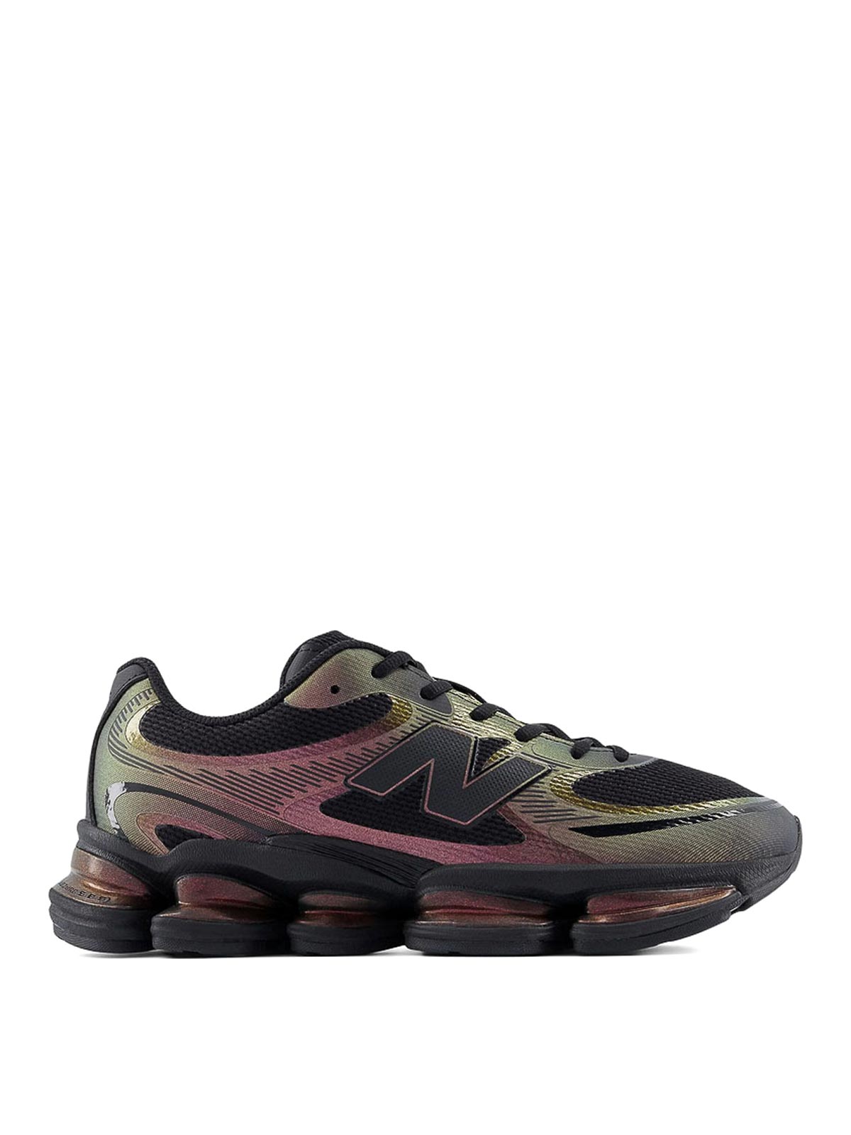 ブラック/マルチカラーのロゴディテールレースアップファスナー、かかと部分にプルタブ、クッション付きデザイン