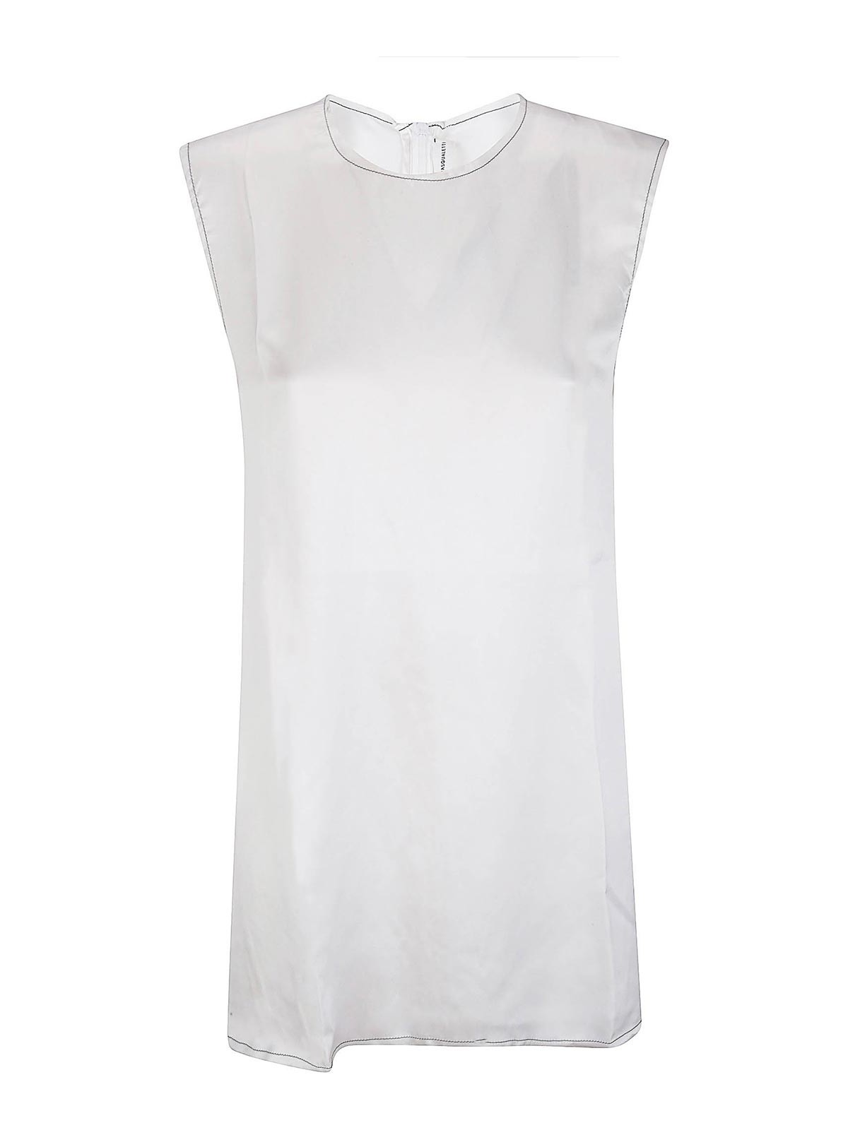 コントラストの効いたステッチをあしらった軽くて半透明のシルクのノースリーブシャツ。背面にファスナー付き、オーバーサイズフィット。