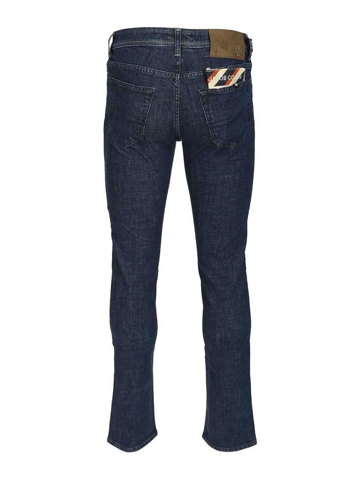 ジェイコブ・コーエンの5ポケットジーンズスリムフィット。ローウエストのミリタリーグリーンのラベルと、トーンのエナメル加工を施したモノグラムロゴのタックボタンが付いており、端を小さく切った円錐形のベースに光沢のある仕上げのロゴが刻印されています。ズボンの名前と創設者の言葉が刺繍されたバンダナとフラップが付いています