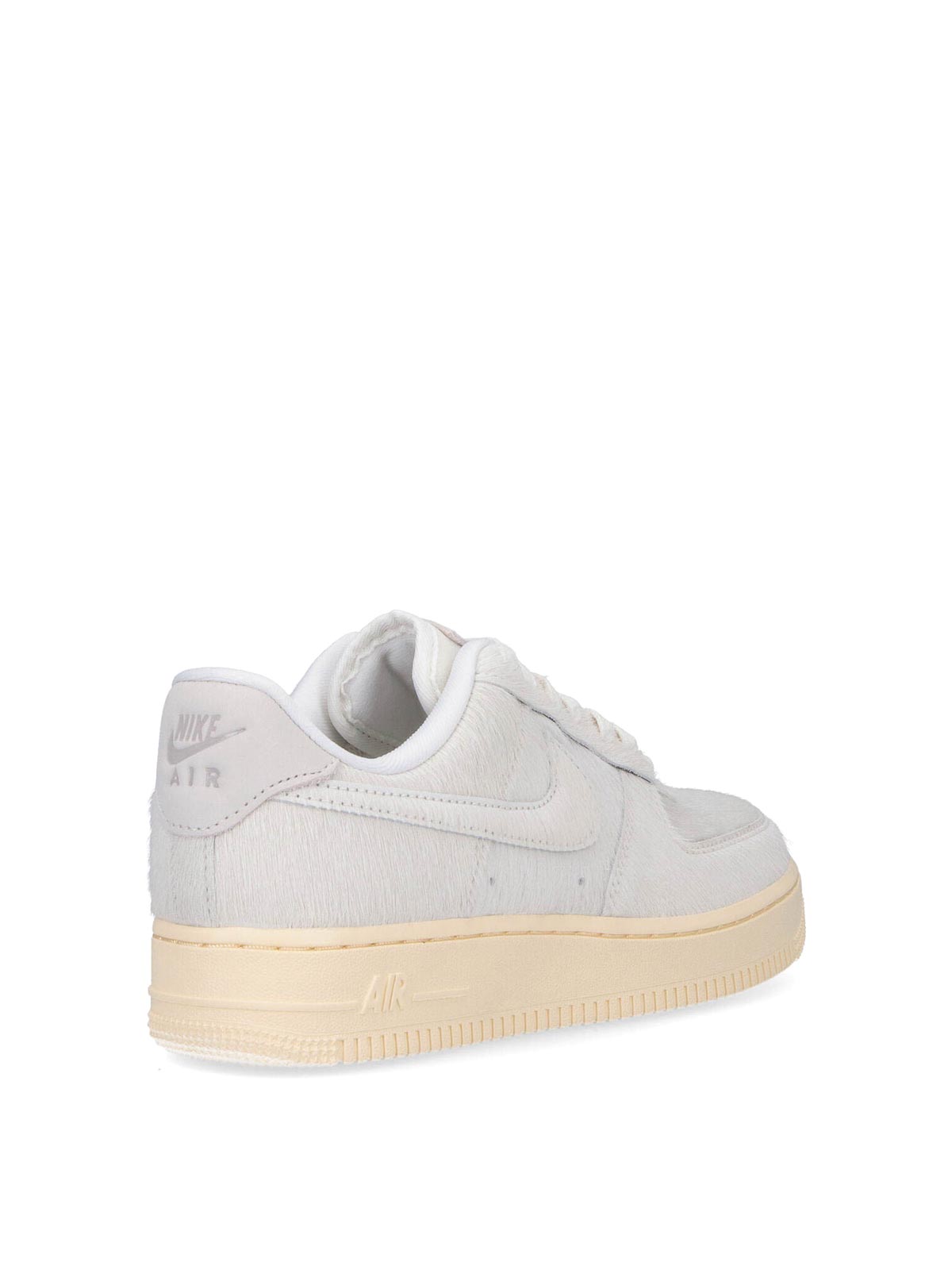 ナイキエアフォース1'07スニーカー、ホワイトレザー、ポニースキンモチーフ、ラウンドトウ、タングロゴラベル、サイドレザースウッシュロゴアプリケーション、リアタブロゴ刺繍、ラバーソール。