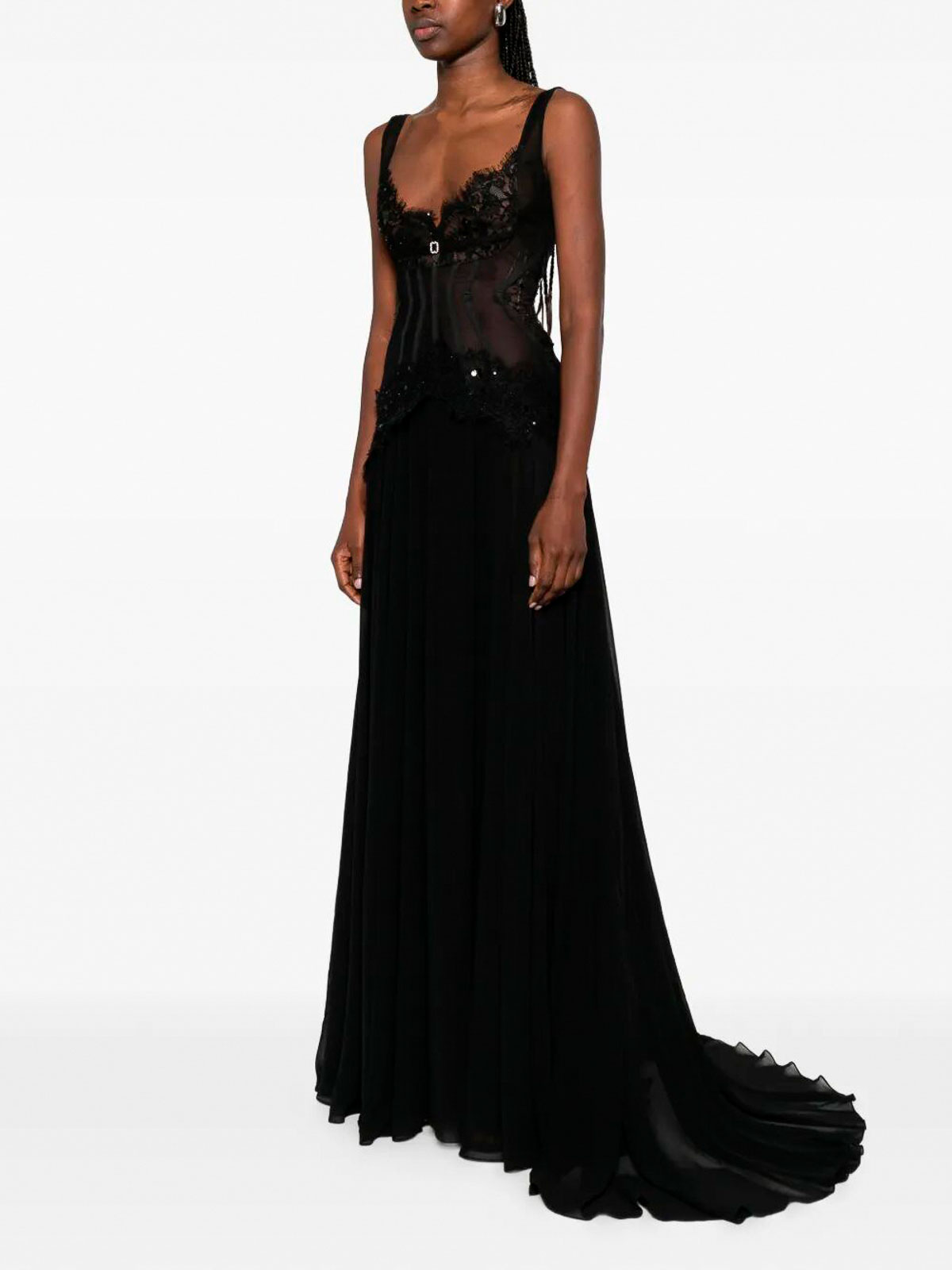 ミニマルなデザインと細身のロングイブニングドレス。