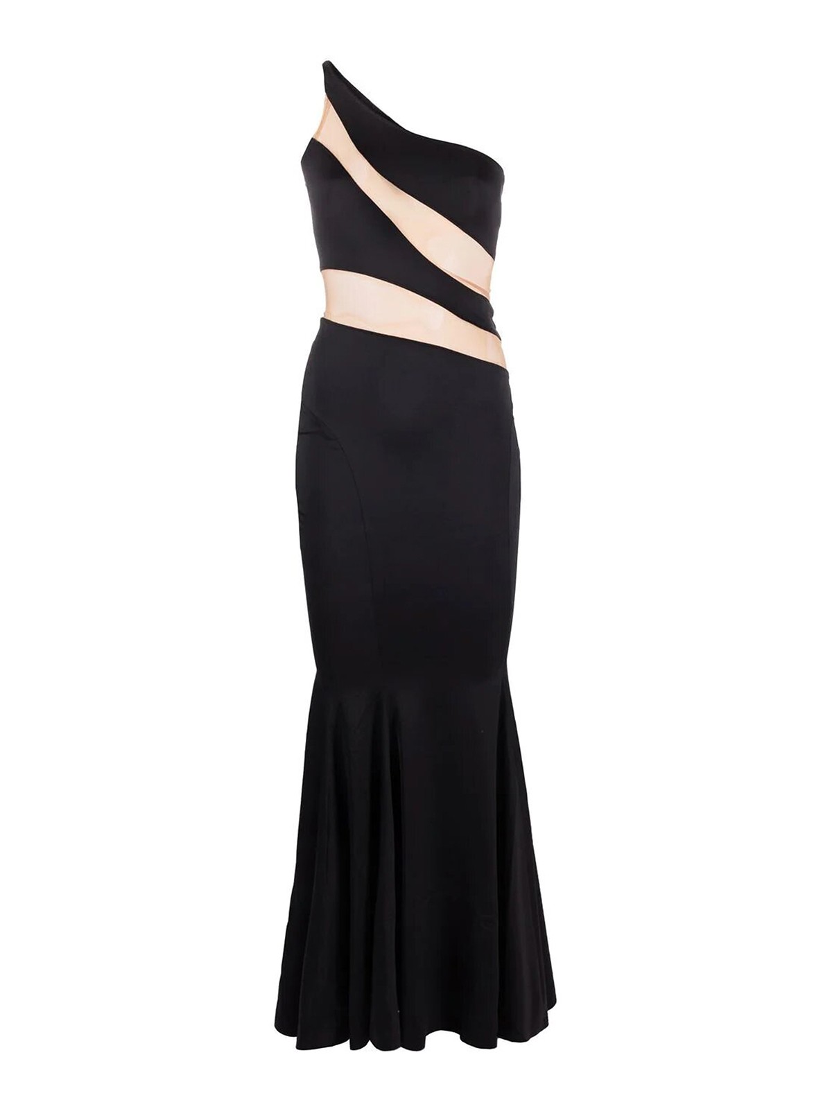 ワンショルダーノースリーブヌードメッシュパネルフィッシュテールヘム