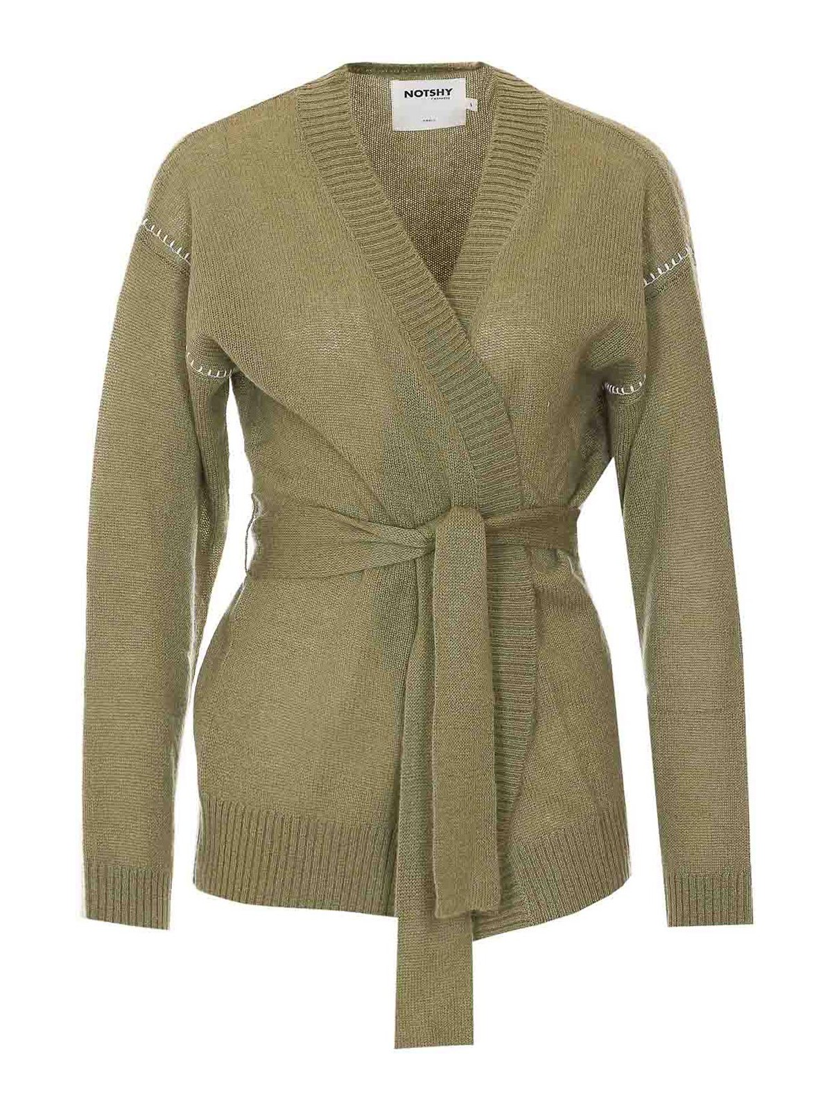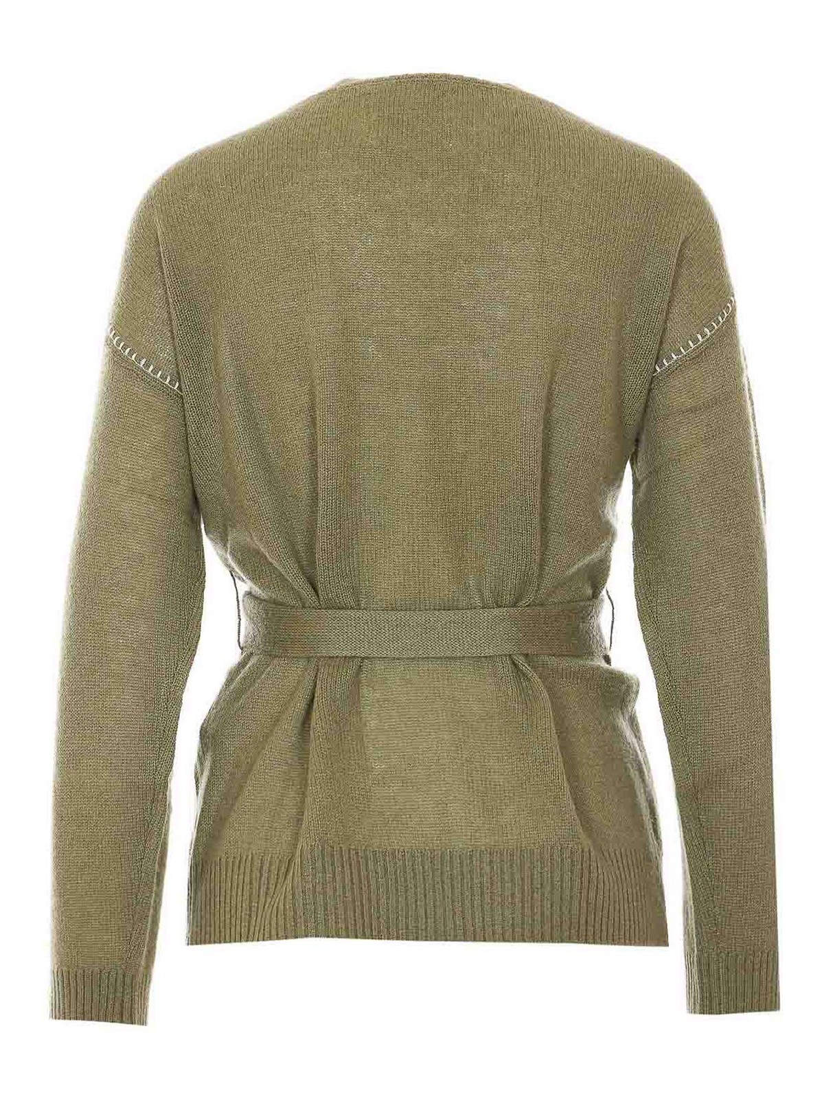 恥ずかしがらないオリーブロリカーディガン、ウエストにベルト、長袖、Vネック