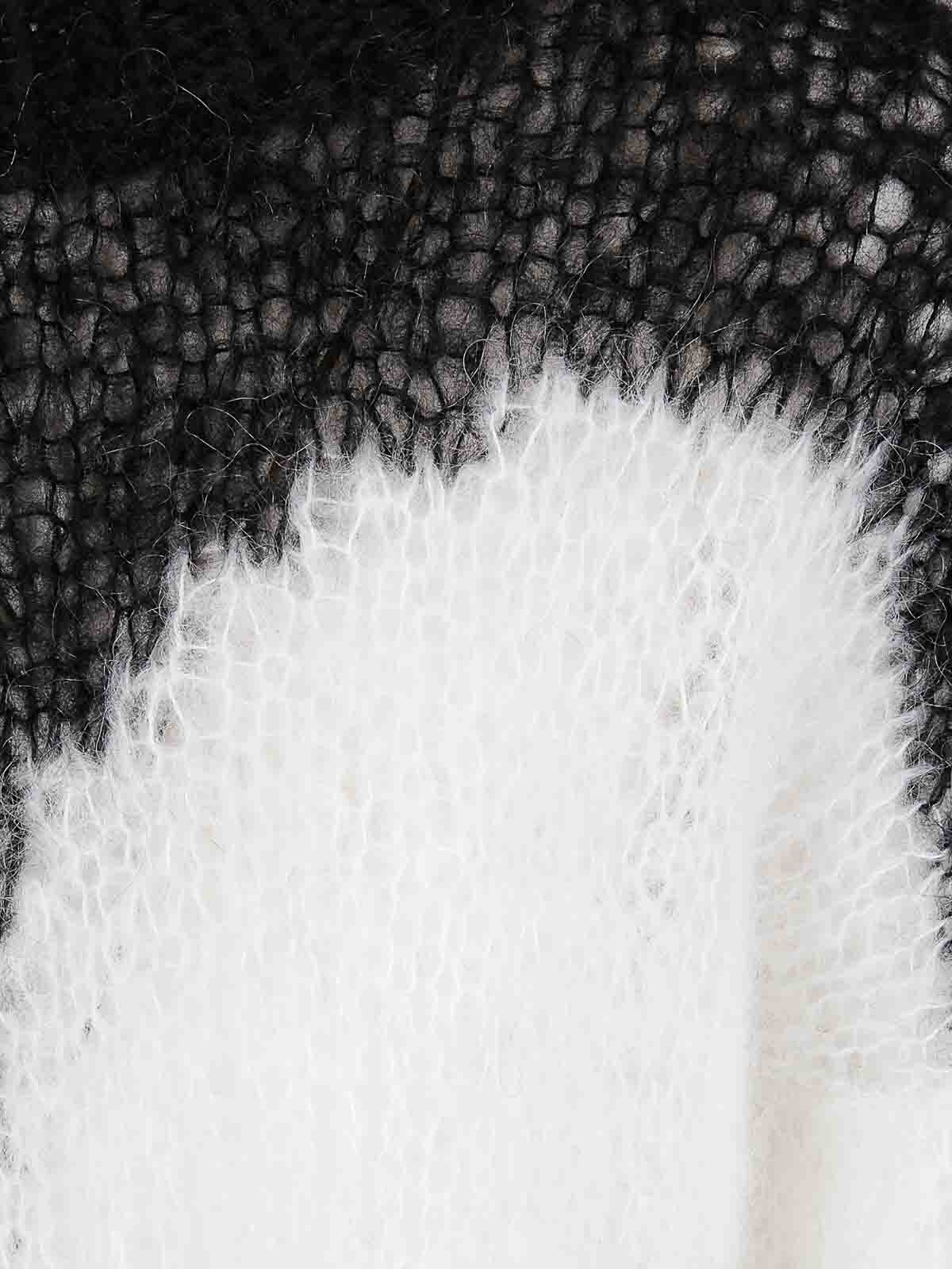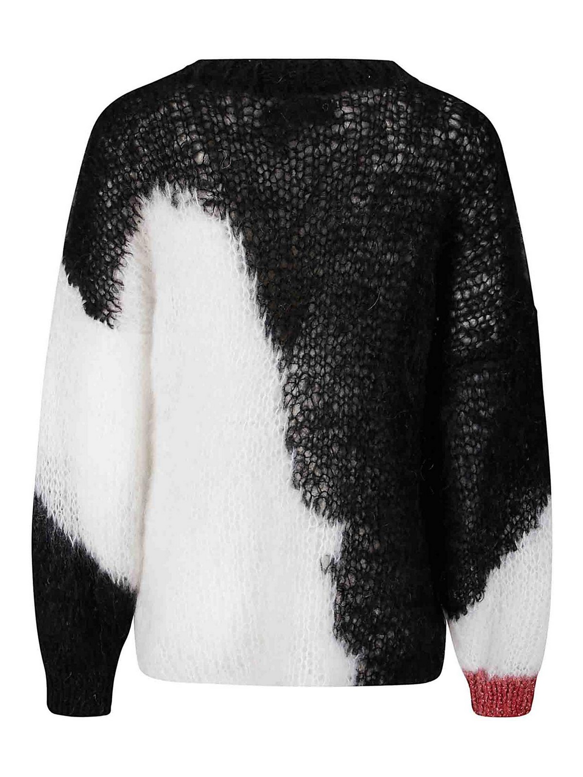 穴あき模様、クルーネック、ロングスリーブ、コントラストカラーの袖口ディテールをあしらったマルチカラーのウールセーター。