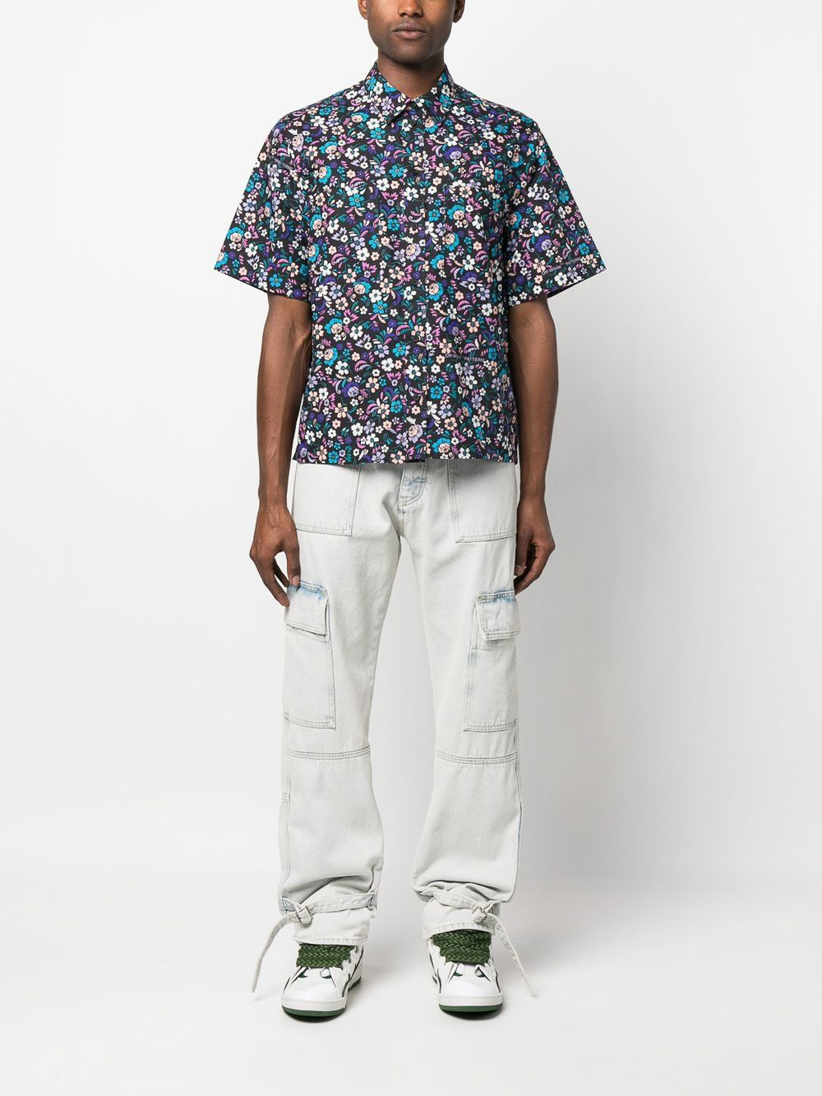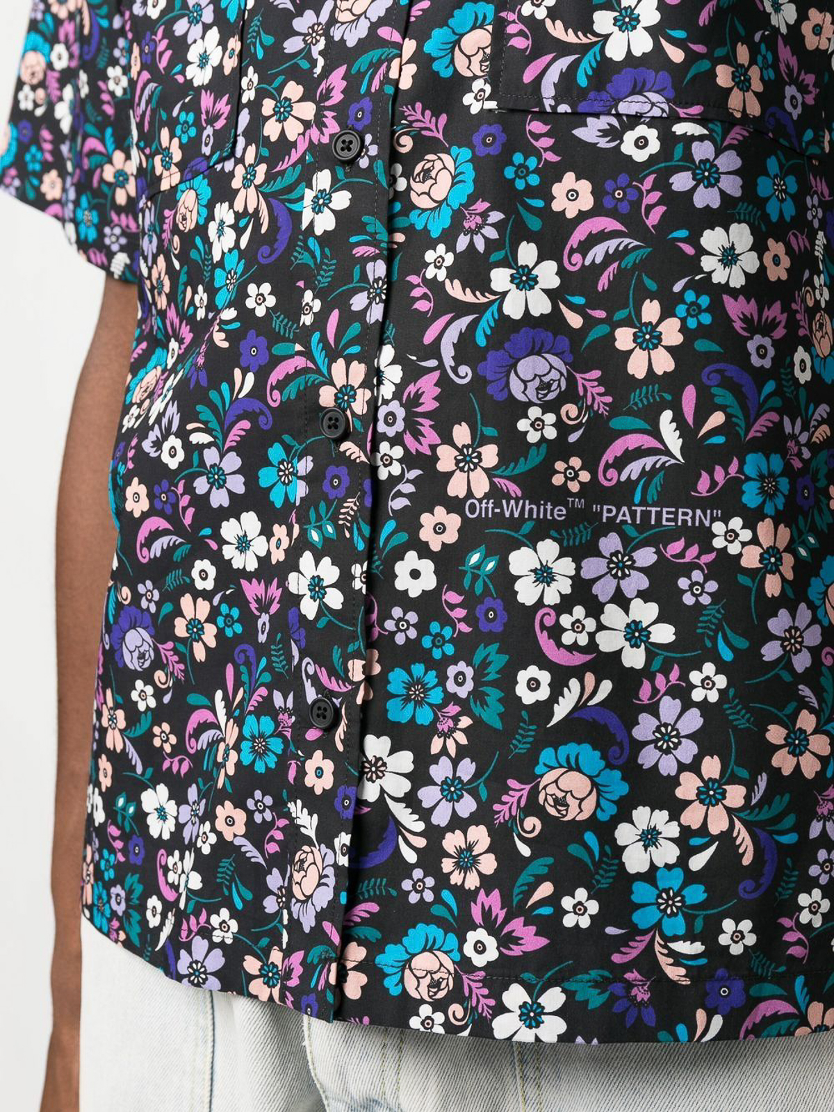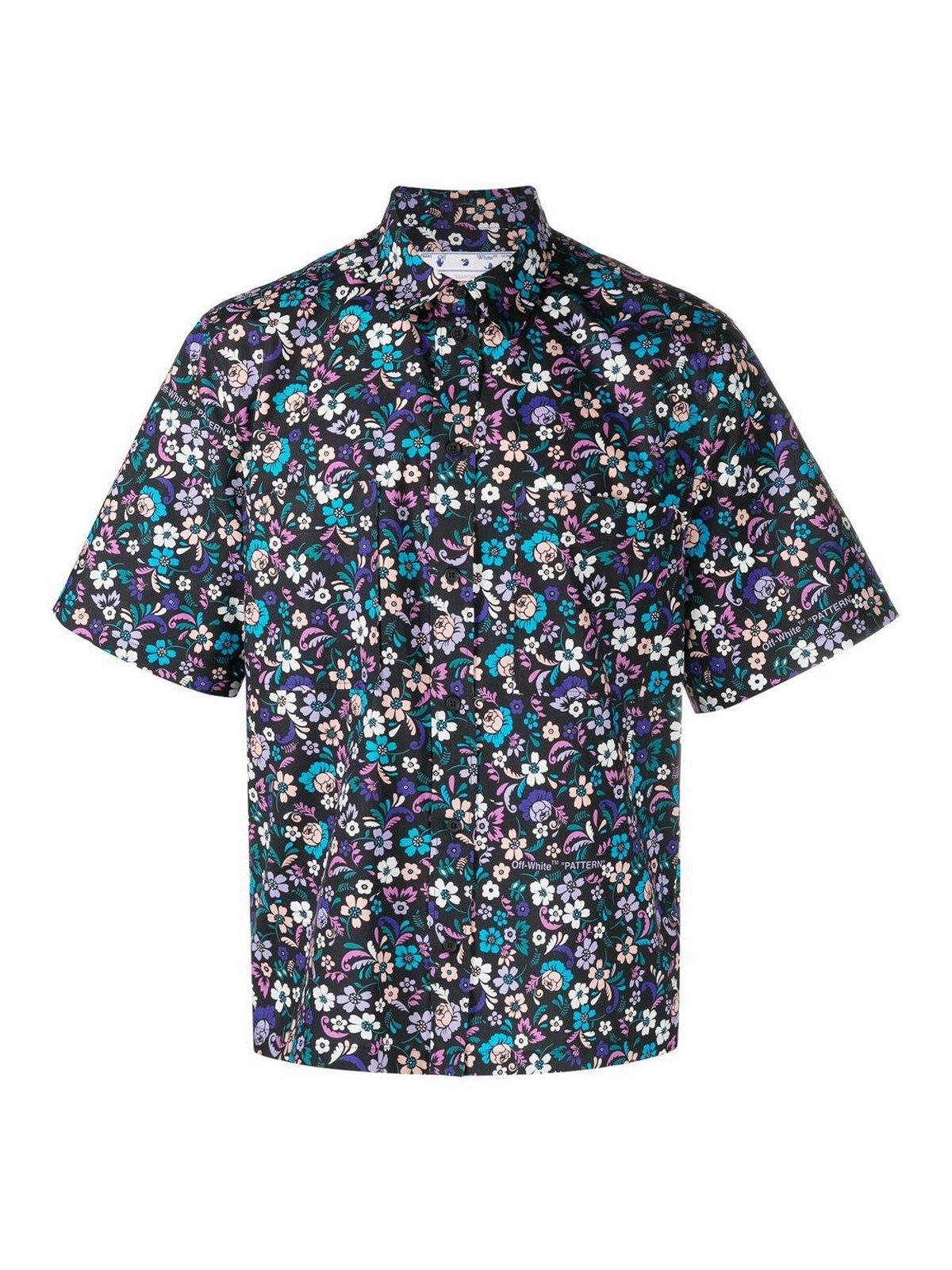 オフホワイトのフラワーサマーコットンシャツ。ブラック/マルチカラー、コットン、全体に花柄プリント、フロントにロゴプリント、クラシックな襟、フロントボタン留め、半袖、胸にパッチポケット2つ、ストレートヘム。