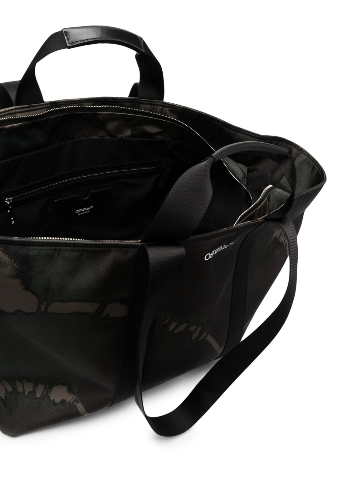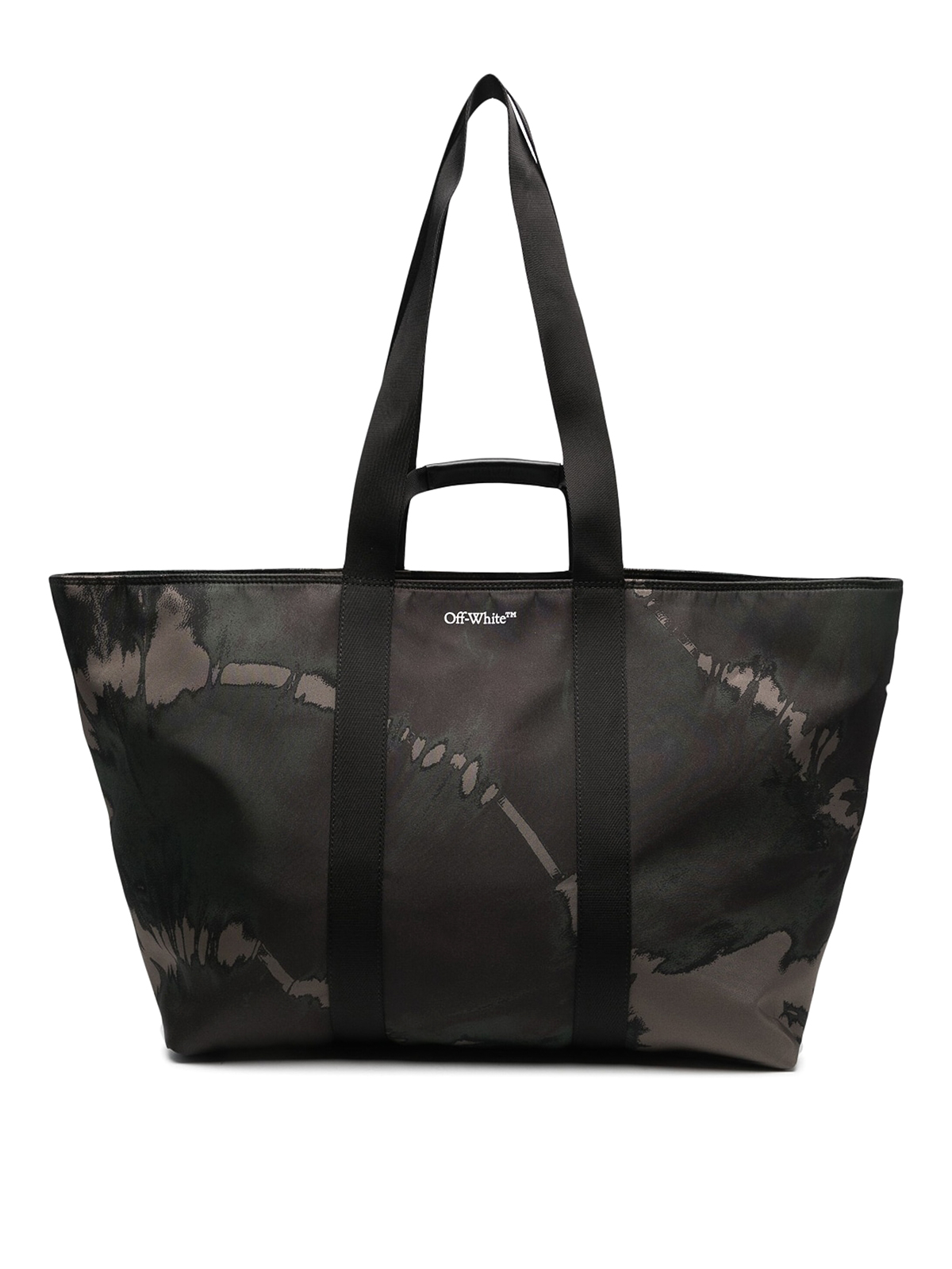 オフホワイトのロゴプリントトートバッグ。前面全体にグラフィックプリントが施されたメインコンパートメントと2つのトップハンドルにグリーンのロゴプリント