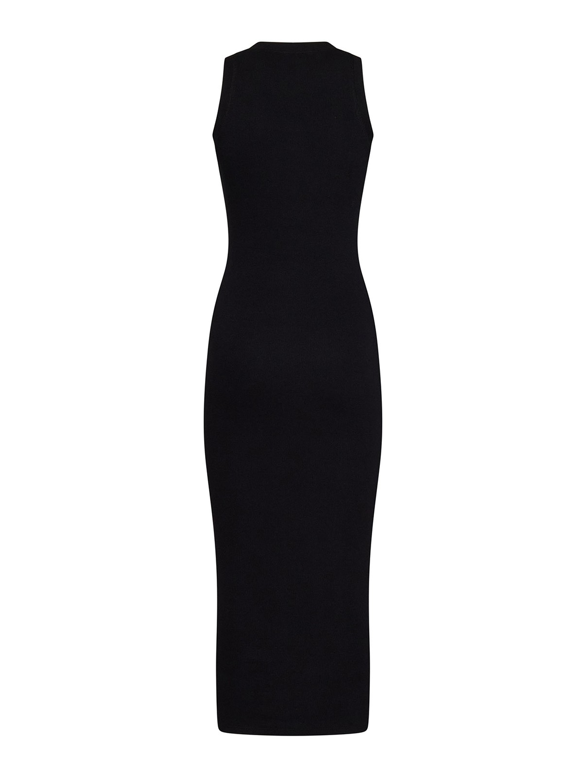 リブ編みのクルーネックとアームホール、胸に白いオフのロゴプリント、前面にリブ編み、中央にスリット、ぴったりフィットするミディカット、ブラック 95% コットン 5% エラスティン。写真の商品はフィットサイズに相当