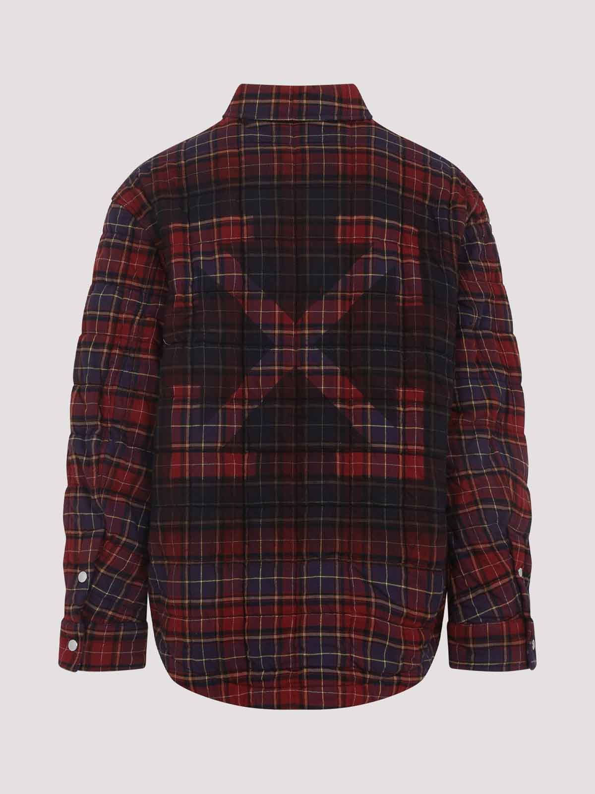 オフホワイトのスプレーアートチェックフランバーガンディジャケット。市松模様のバーガンディフランネル製で、シャツの襟にスナップボタン、胸にロゴが刺繍されています。長袖、後ろの丸い裾にボタン付きの袖口、矢印が付いています。