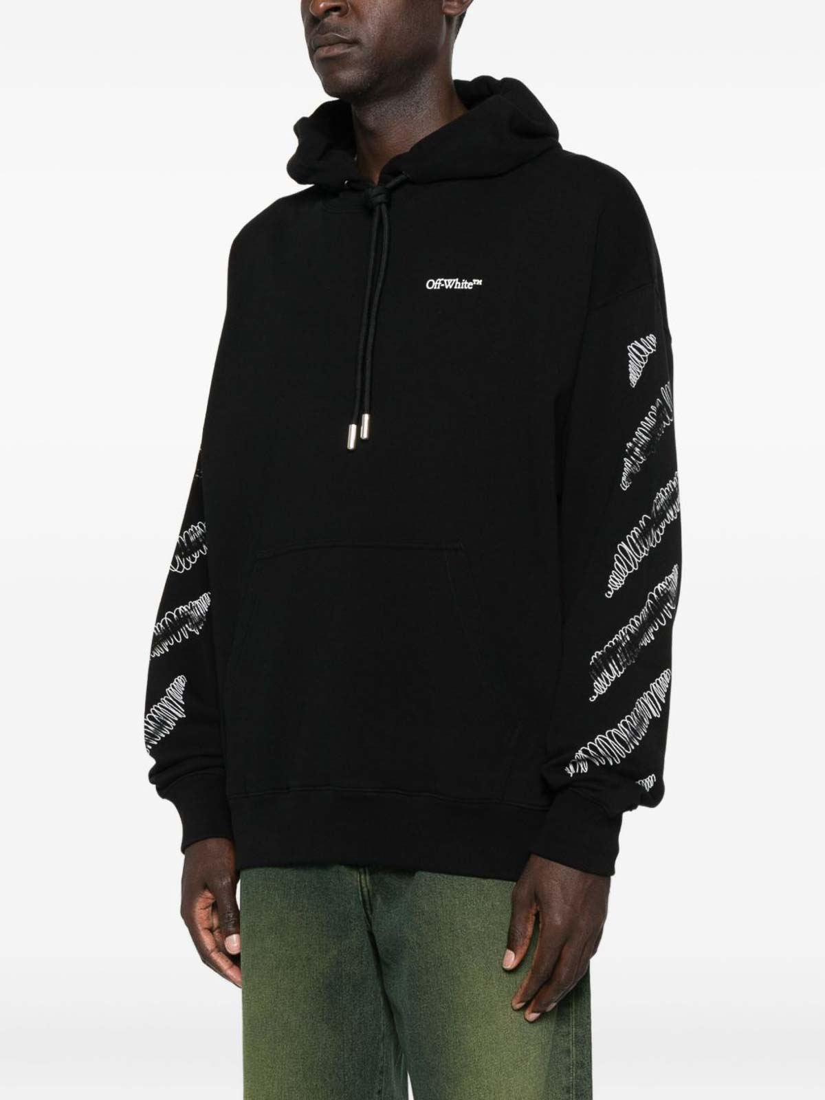 パーカーの色:袖にドローストリングのカンガルーポケットの矢印モチーフの装飾が施されたブラックフード