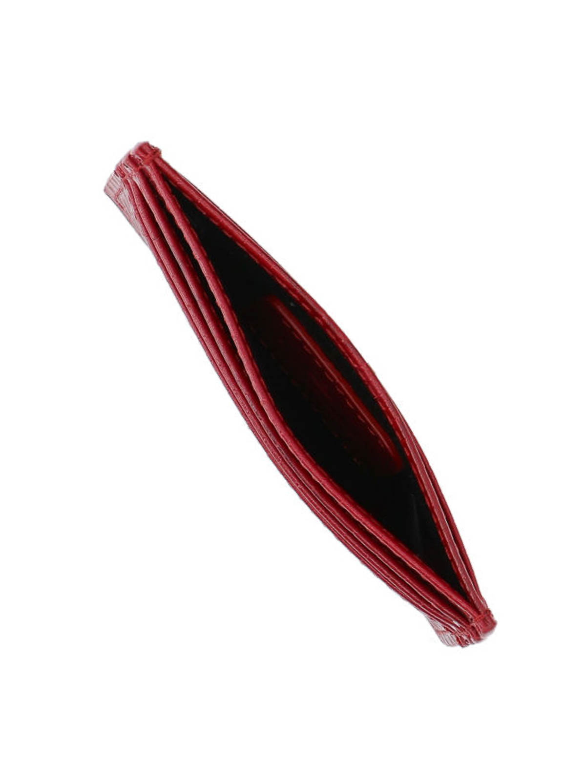 ヴィヴィアン・ウエストウッドの赤いカーフスキンのオーブカードホルダー、クロコダイルプリント、前面に金色のメタルロゴ、フラットトップポケット1つ、カードスロット6つ。