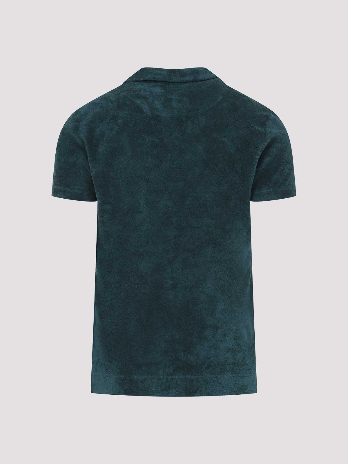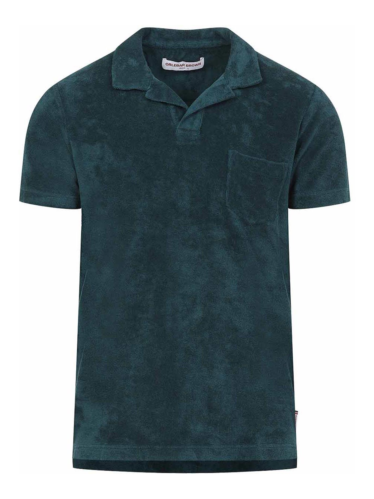 Orlebar ブラウンテリーグリーンコットンポロシャツ。グリーンコットンタオル、ポインテッドカラー、オープンプラケット、胸にパッチポケット、半袖、ストレートヘム。