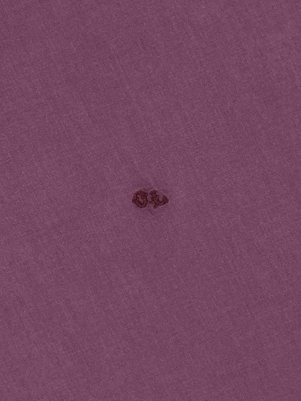 従来のシャツとは一線を画すパープルコットン、クラシックな襟、マザーオブパールのボタン留め、サイドにトーン・オン・トーンのロゴ刺繍、ボタン付きカフス、カーブしたヘム。