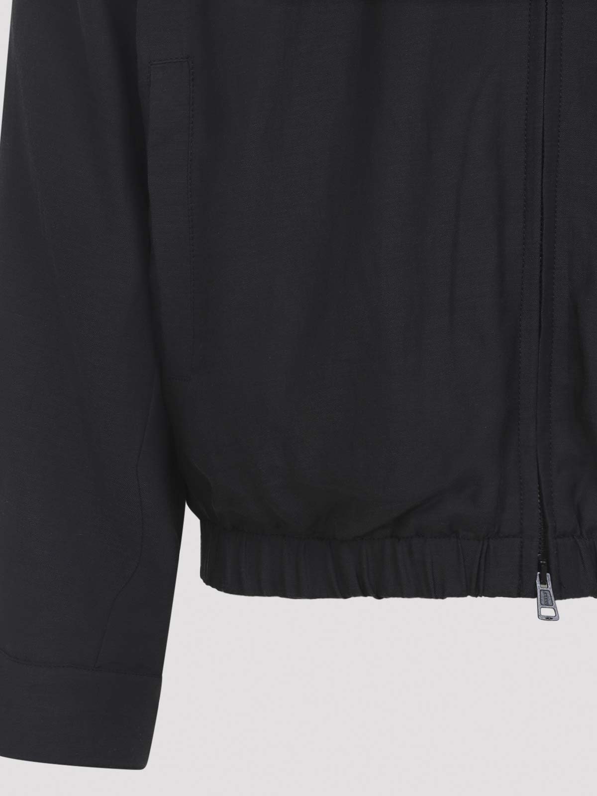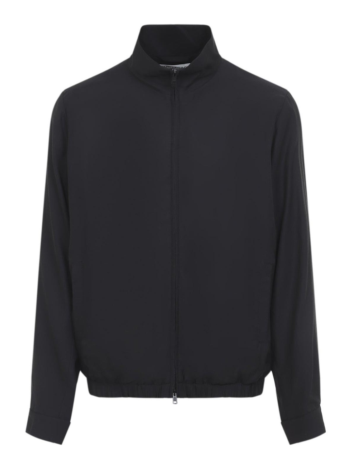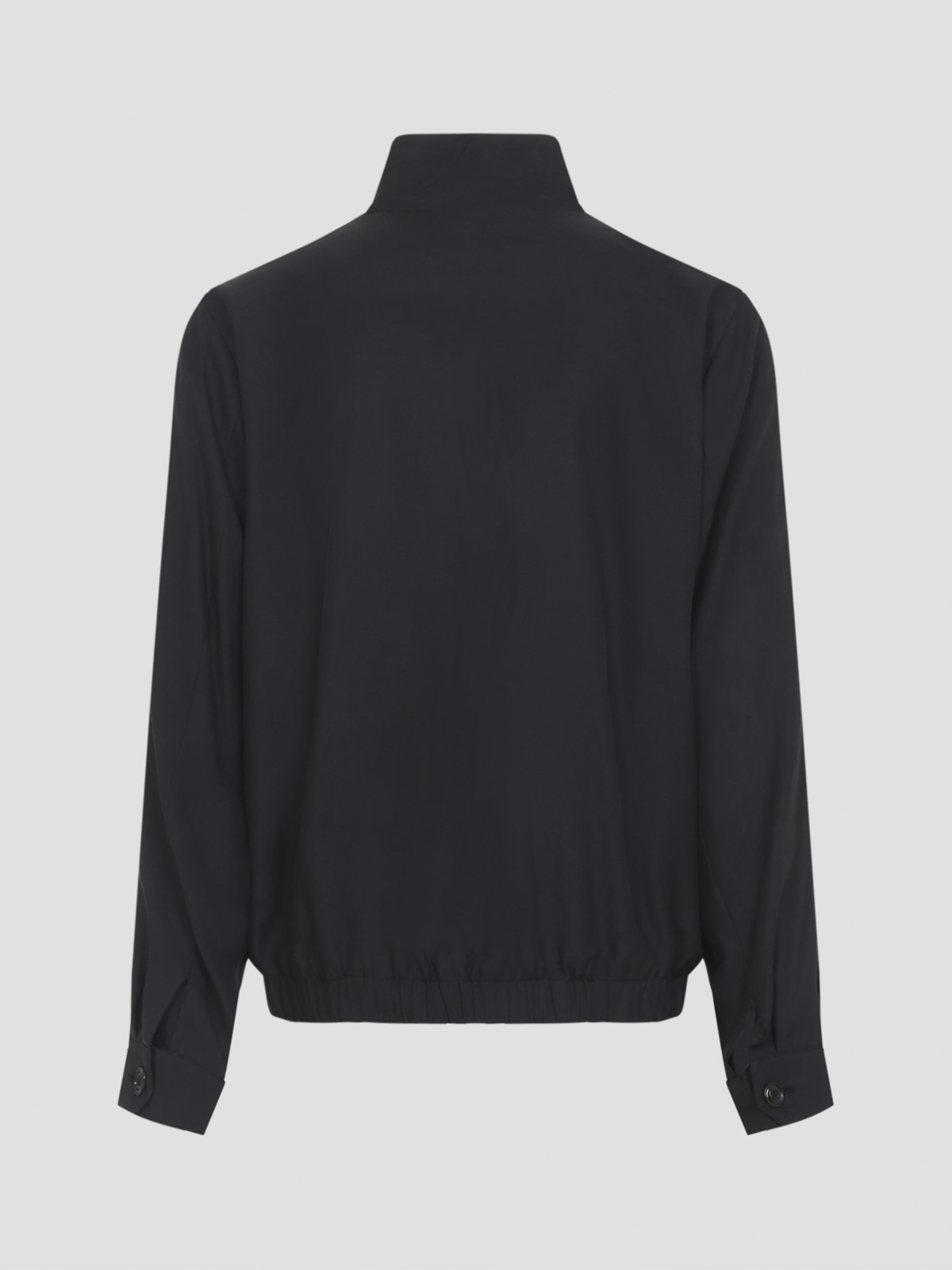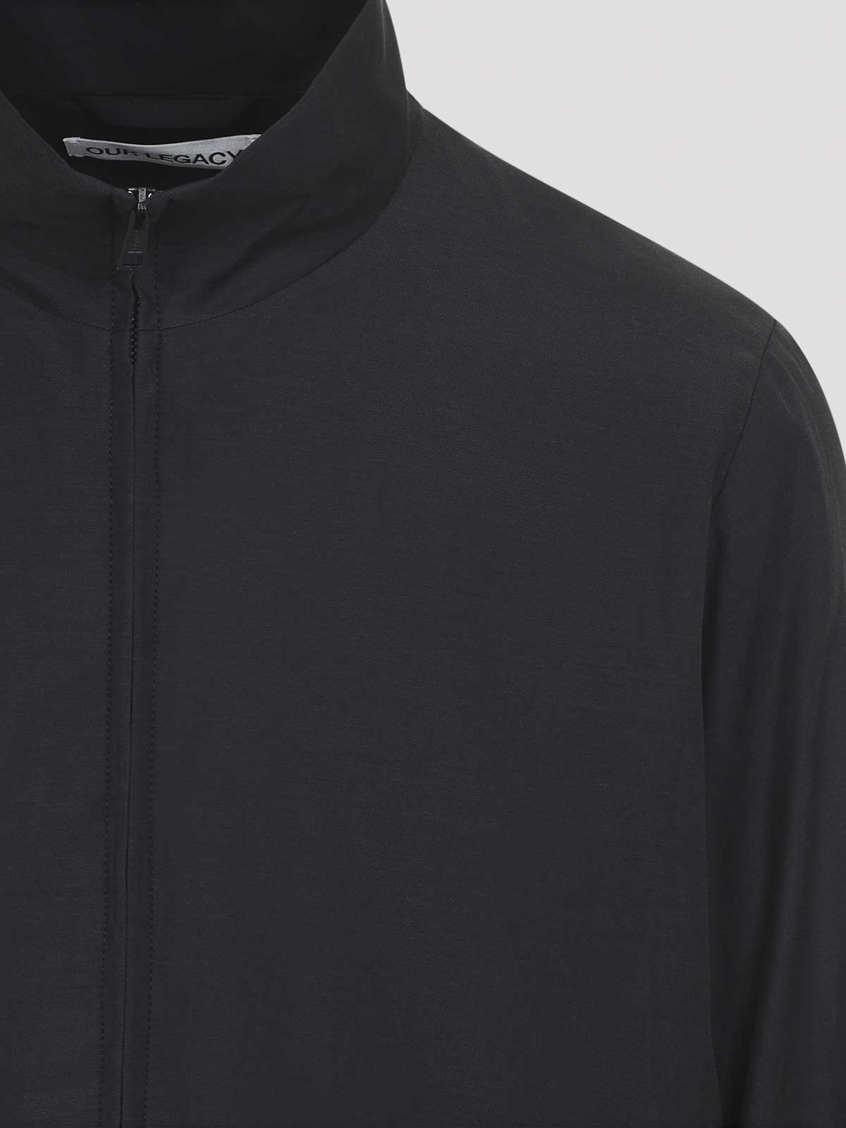 当社のレガシーブラックキュプラカジノジャケット。キュプラとコットンの混紡製、スタンドカラー、フロントファスナー、サイドポケット、長袖、ボタン付きカフス、伸縮性のあるストレートヘム。