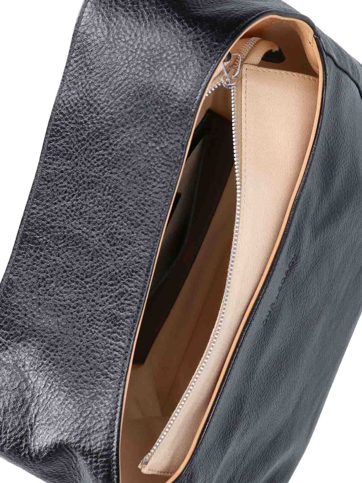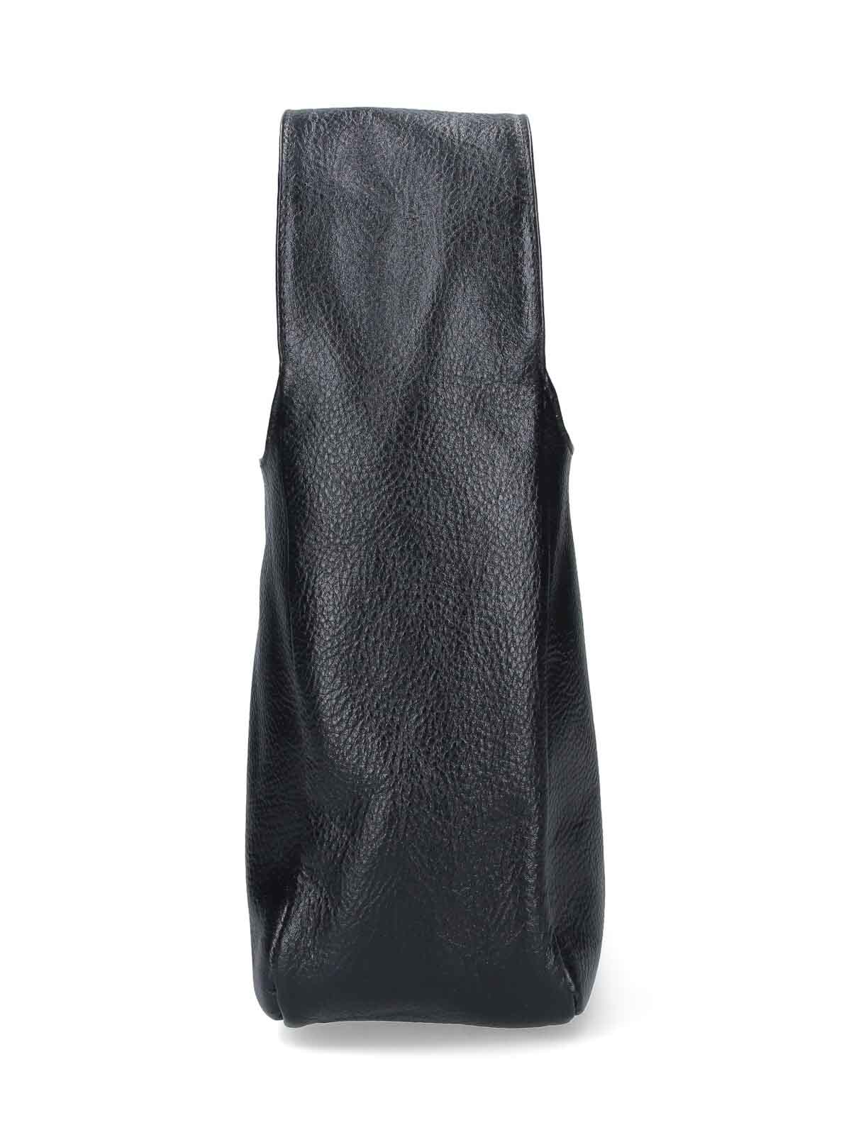 ブラックカーフスキンのブリックハンドバッグ、トップハンドル1つ、ジップクロージャー、ジッパープラーレース、フロントにトーン・オン・トーンのエンボス加工ロゴ、内側にフラットポケット1つ、メインの内部コンパートメント1つ。