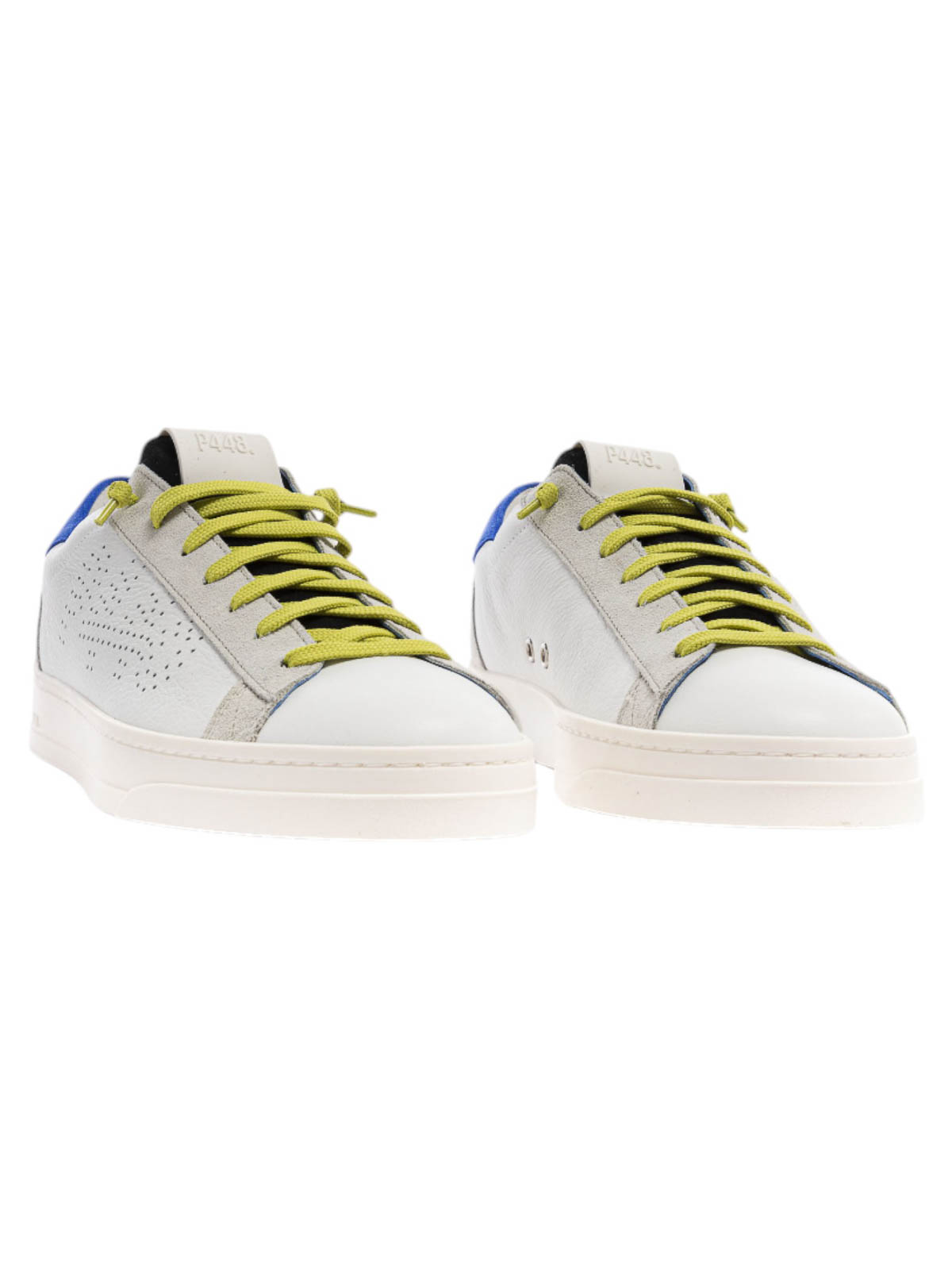 マルチカラーのディテールが施されたP448ホワイトレザースニーカー。高品質のレザーとスエードで作られた、イタリア製のアーティザンスニーカー。穴のあいたp448ロゴと現代的なデザインを引き立てる黒とオフホワイトのスエードのディテールが特徴のホワイトレザーのアッパーは、現代的なデザインを引き立てます。ロイヤルブルーのレザーのヒールタブが個性的な色を添え、テリーの裏地と低反発素材のインソールが毎日の快適さを最大限に引き立てます。