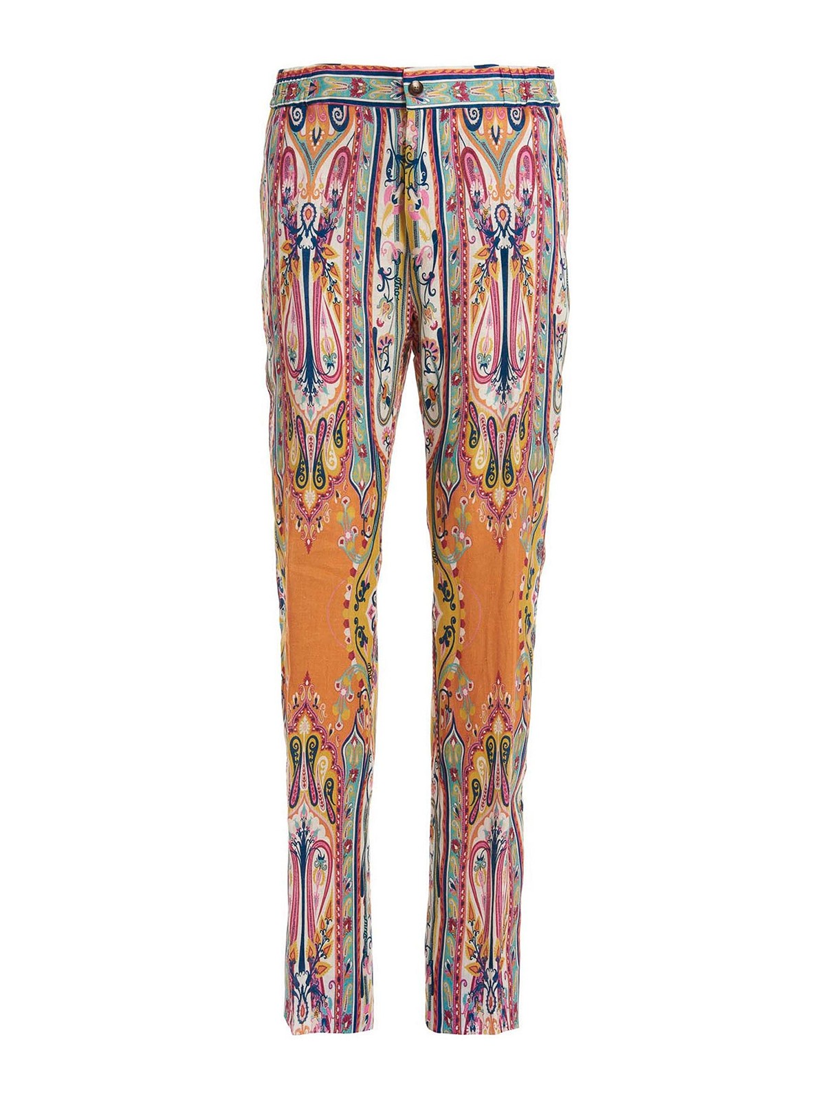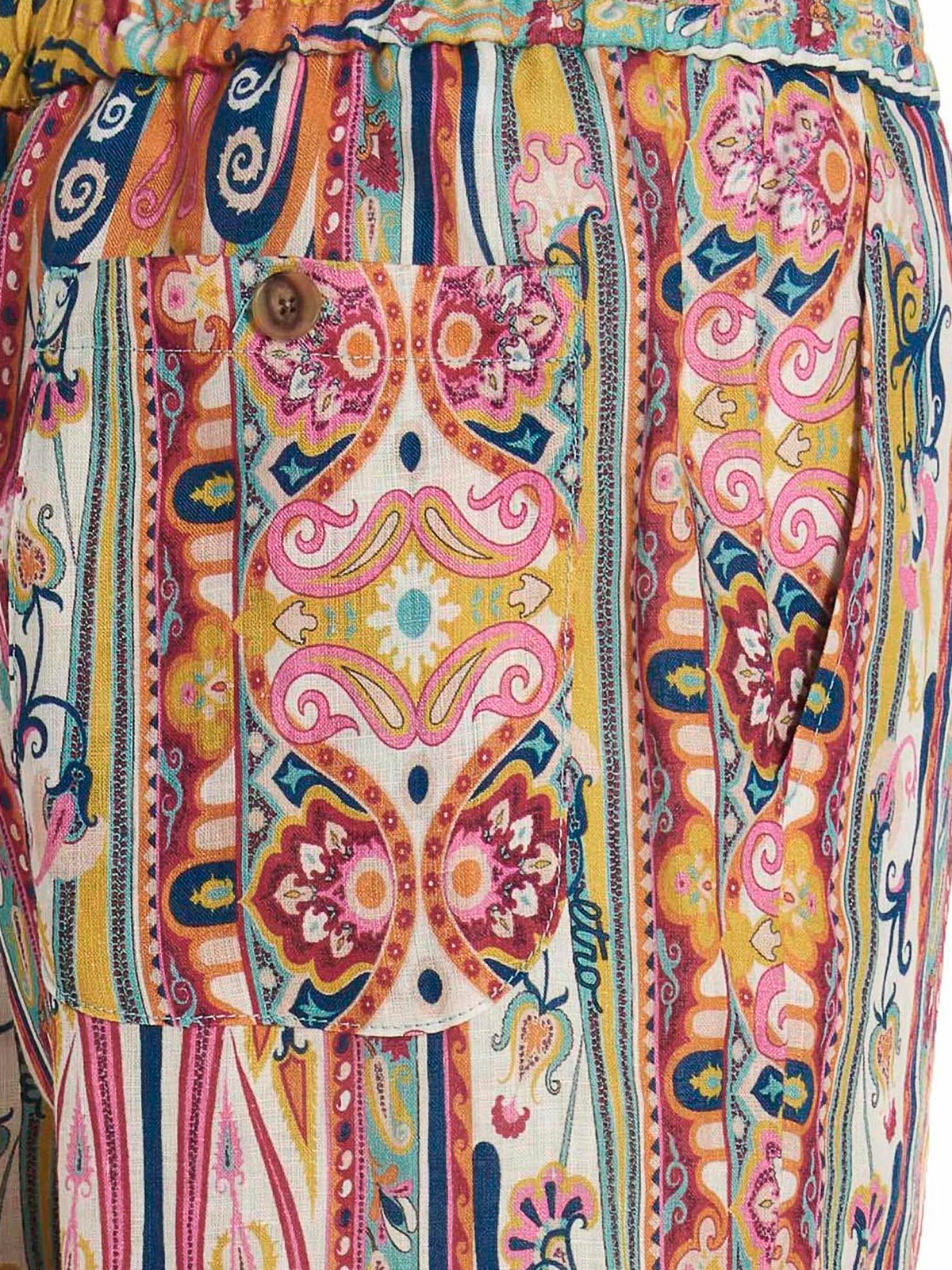 全体にペイズリー柄のリネンパンツ、伸縮性のあるウエストバンド、ジッパーとボタン留め、ポケットが特徴です。