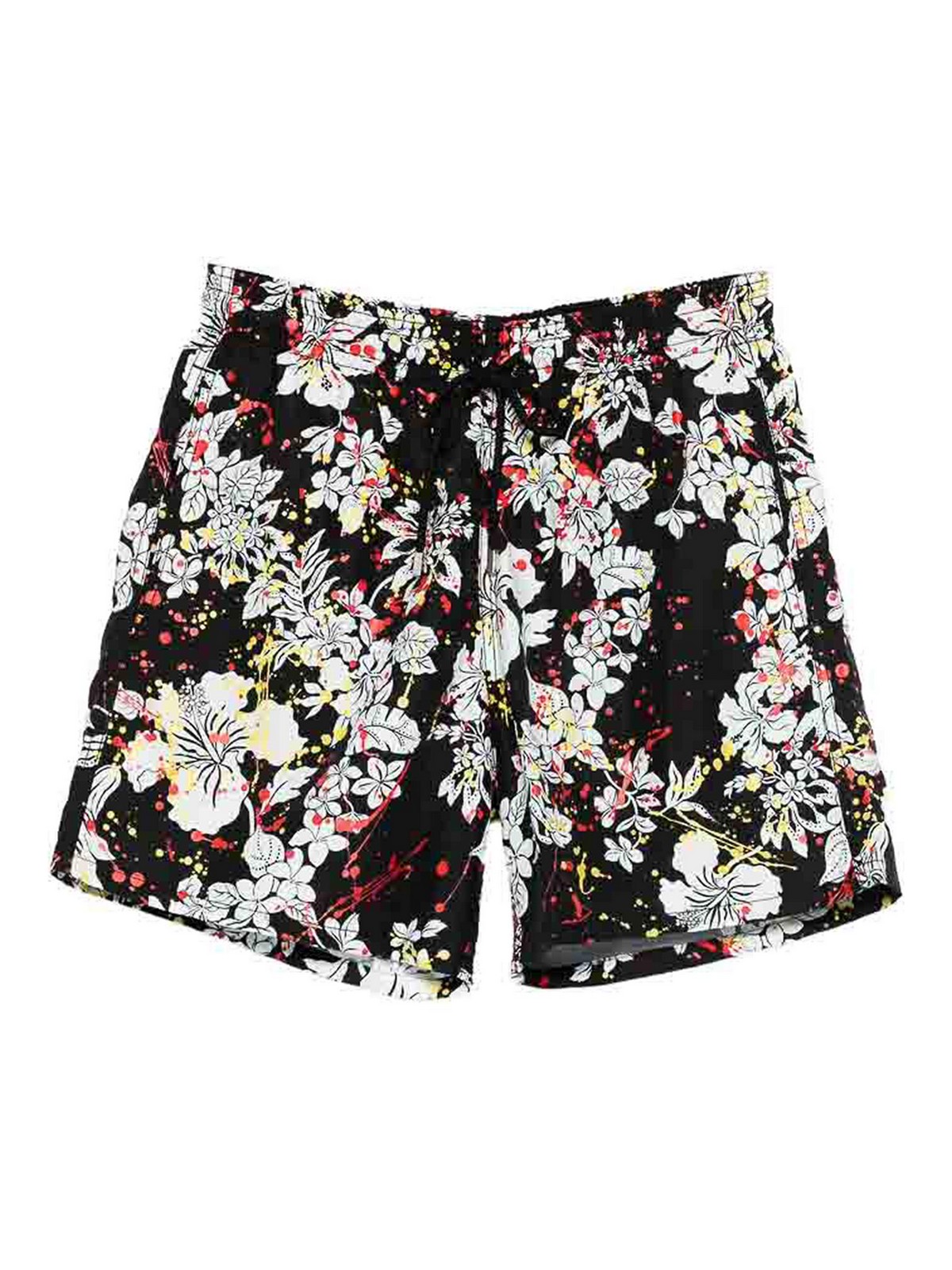 ブラックフローラルプリントドローストリングファスナーペイントスプラッターディテール