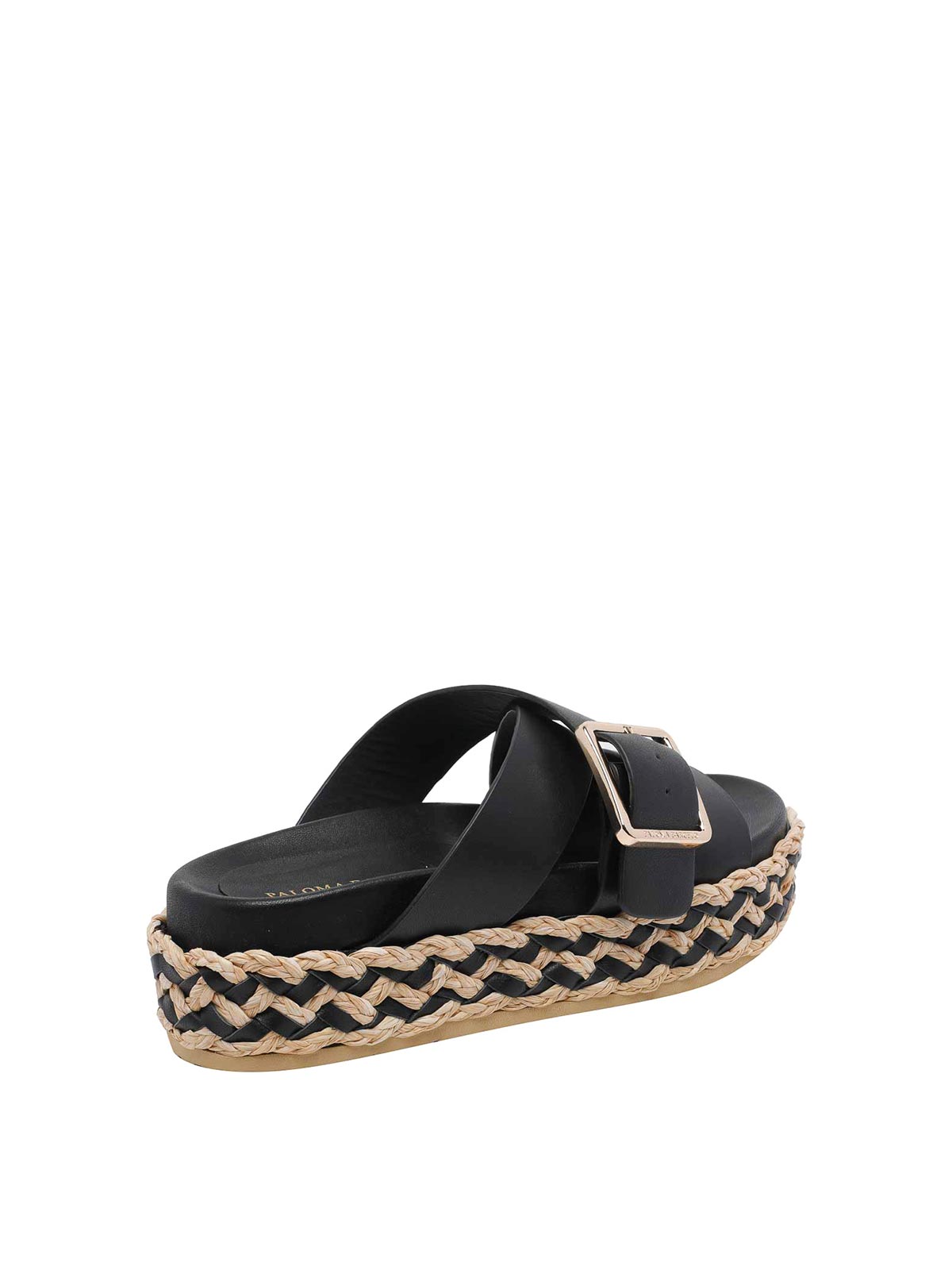 Paloma Barcelo' ブラックウィーンカリディスサンダル、レザーアッパー、オープンラウンドトウ、バックルクロージャー、プラットフォーム