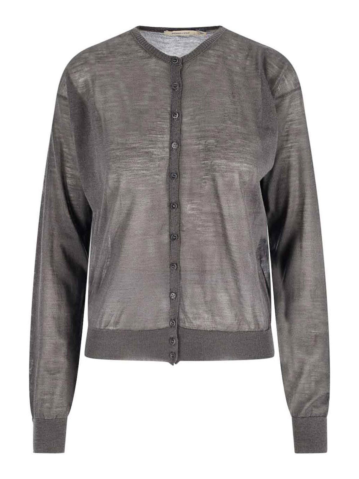 パロマウールメリノウールカーディガン、ブラウン、ラウンドネック、ドロップショルダー、ボタンクロージャー、リブ仕上げ、ストレートヘム。