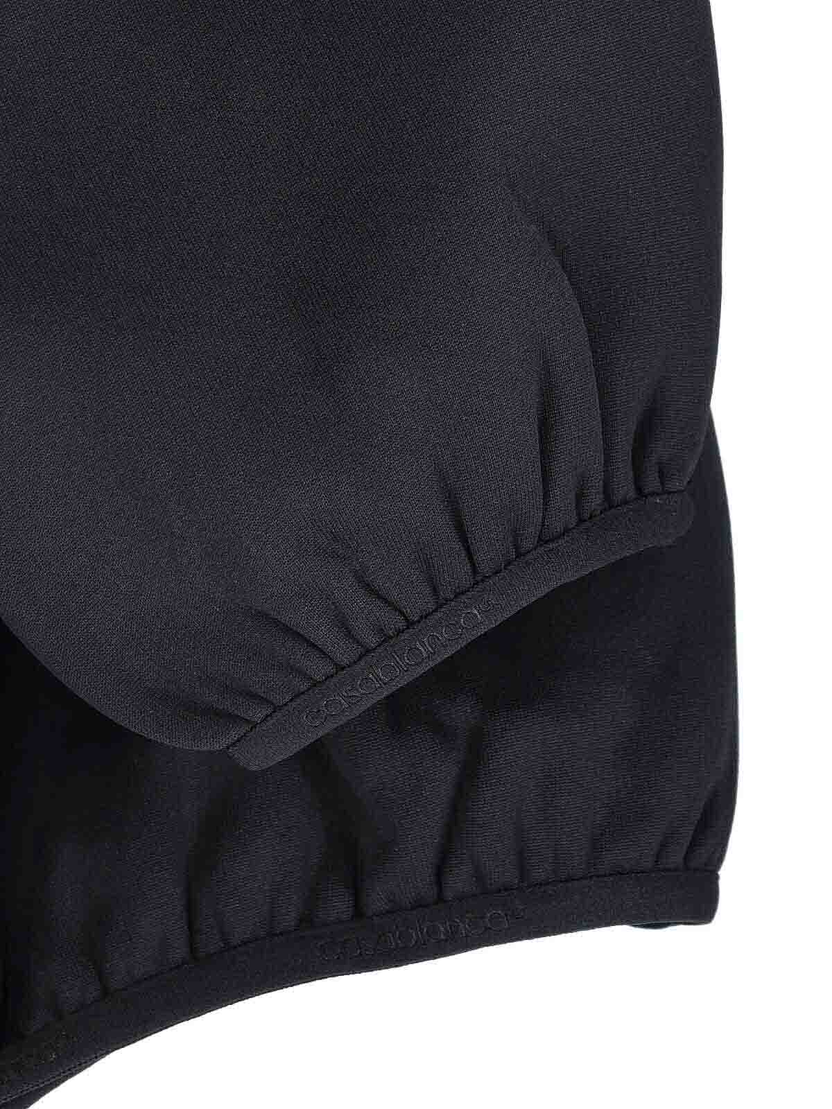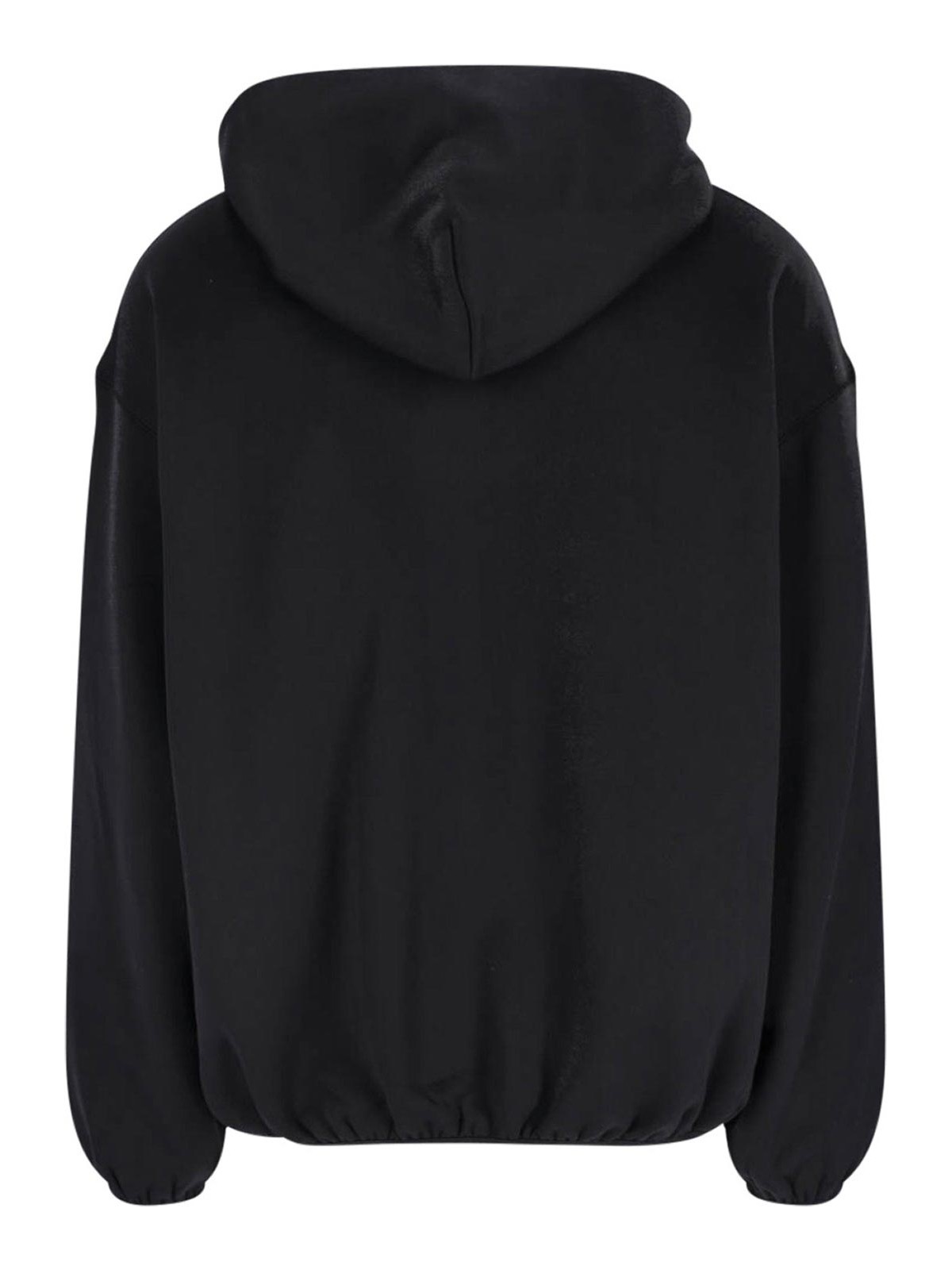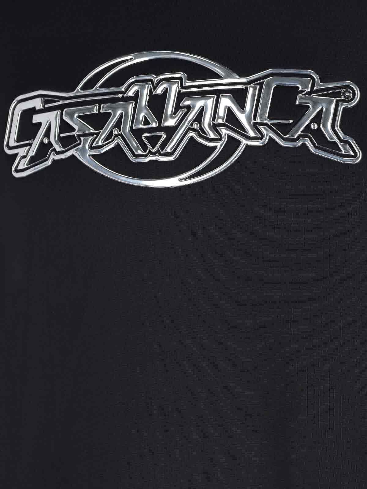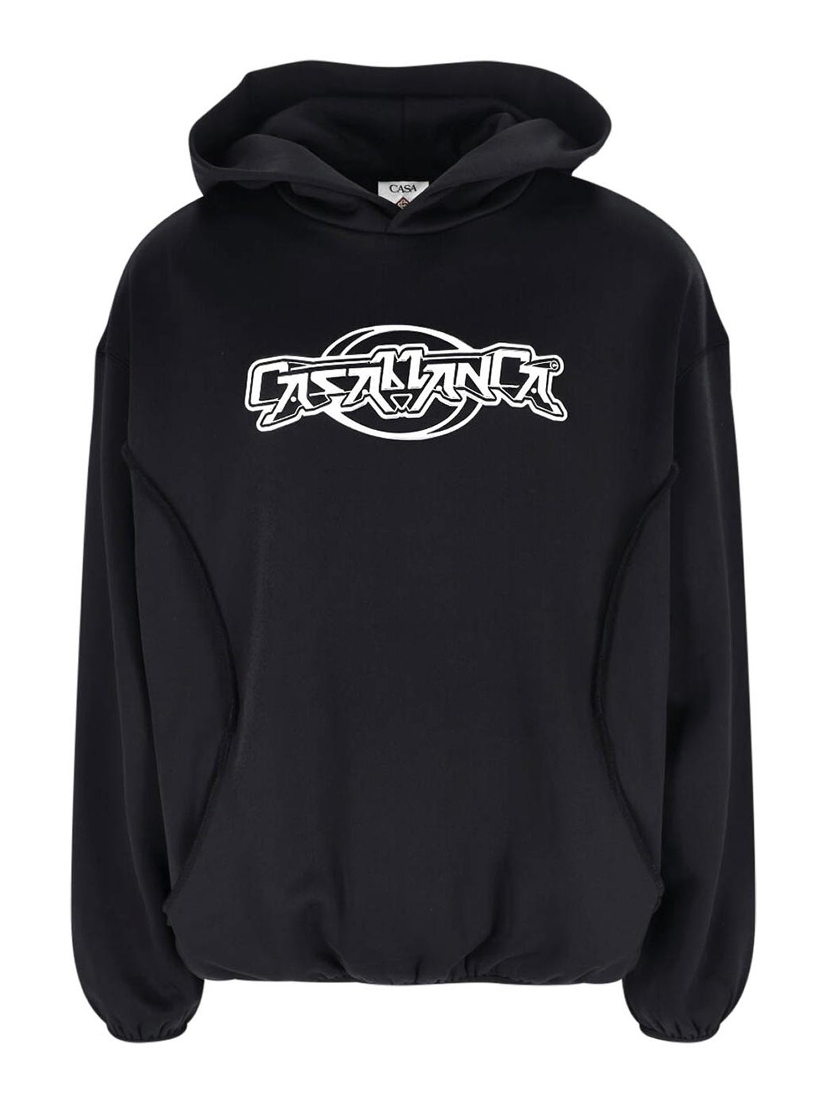 カサブランカパネル仕立てパーカー、ブラックファブリック、フード、ドロップショルダー、フロントにエンボス加工のシルバーロゴ、サイド刺繍のディテール、マキシフロントポケット1つ、伸縮性のある仕上げ、トーン・オン・トーンのエンボス加工ロゴディテール、ストレートヘム。