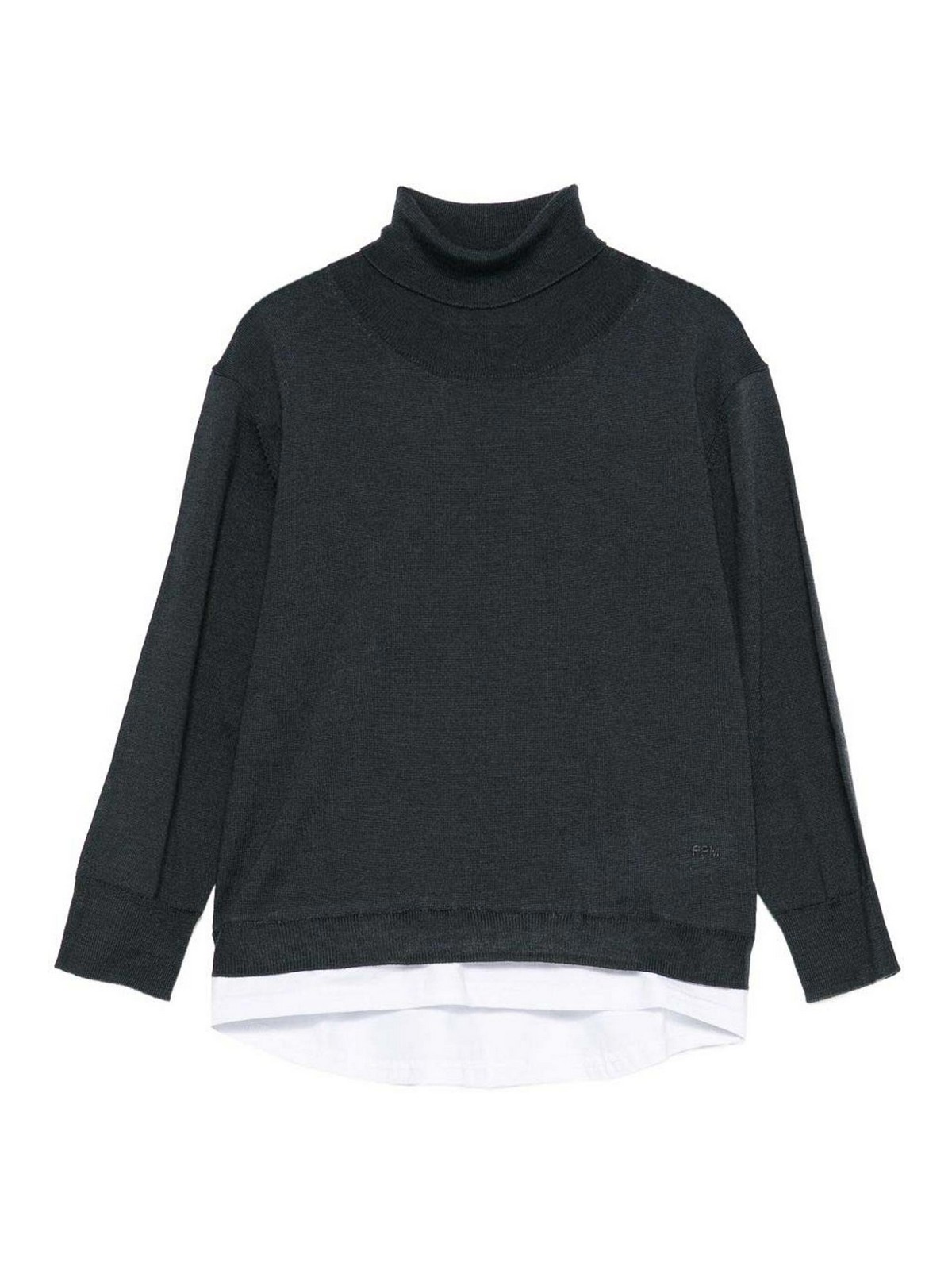 タートルネックセーターは、グレーのタートルネックレイヤードデザイン、ロングスリーブ、ストレートヘムが特徴です