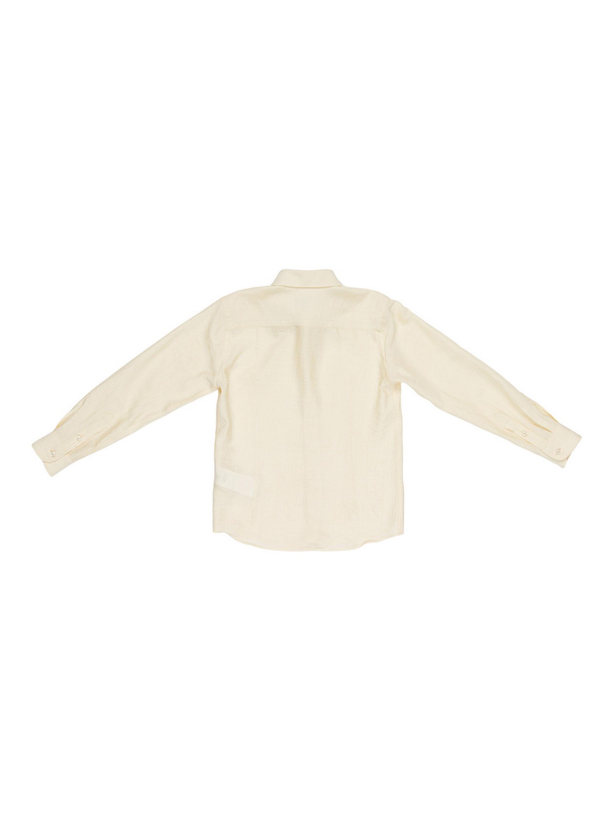 長袖シャツはベージュの長袖ボタンプラケットの裾が特徴です