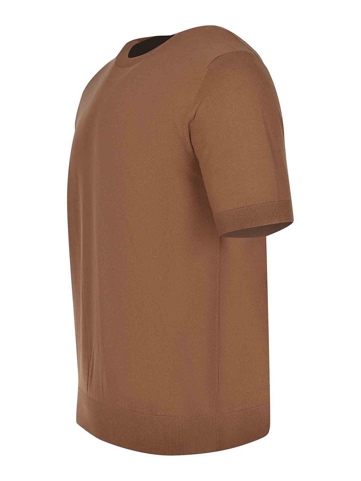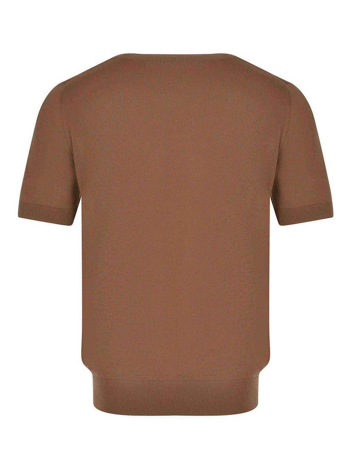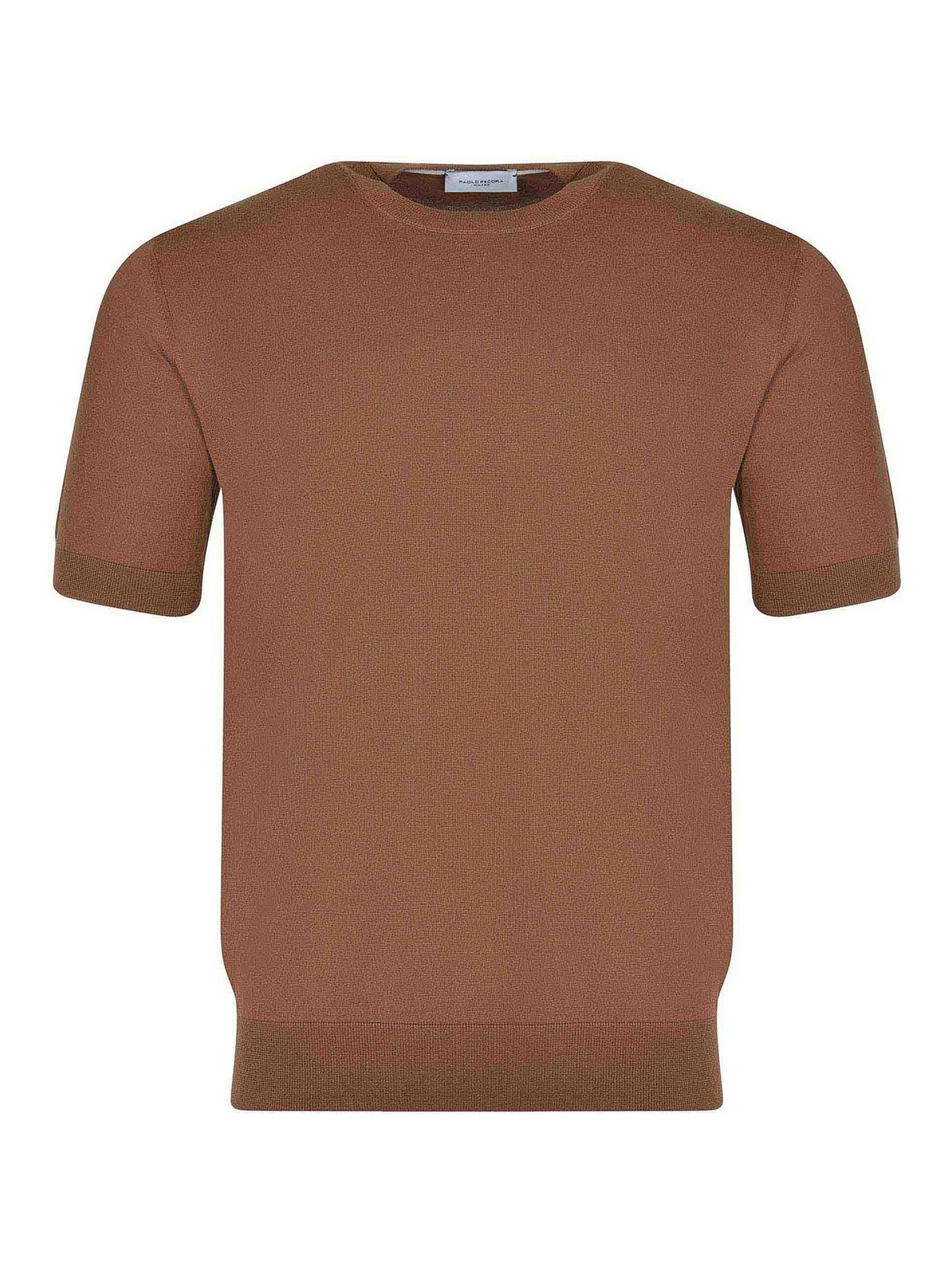 ヘーゼルナッツ色のコットン製パオロ・ペコラセーター、リブ編みのクルーネック、半袖、リブ仕上げ、100% コットン
