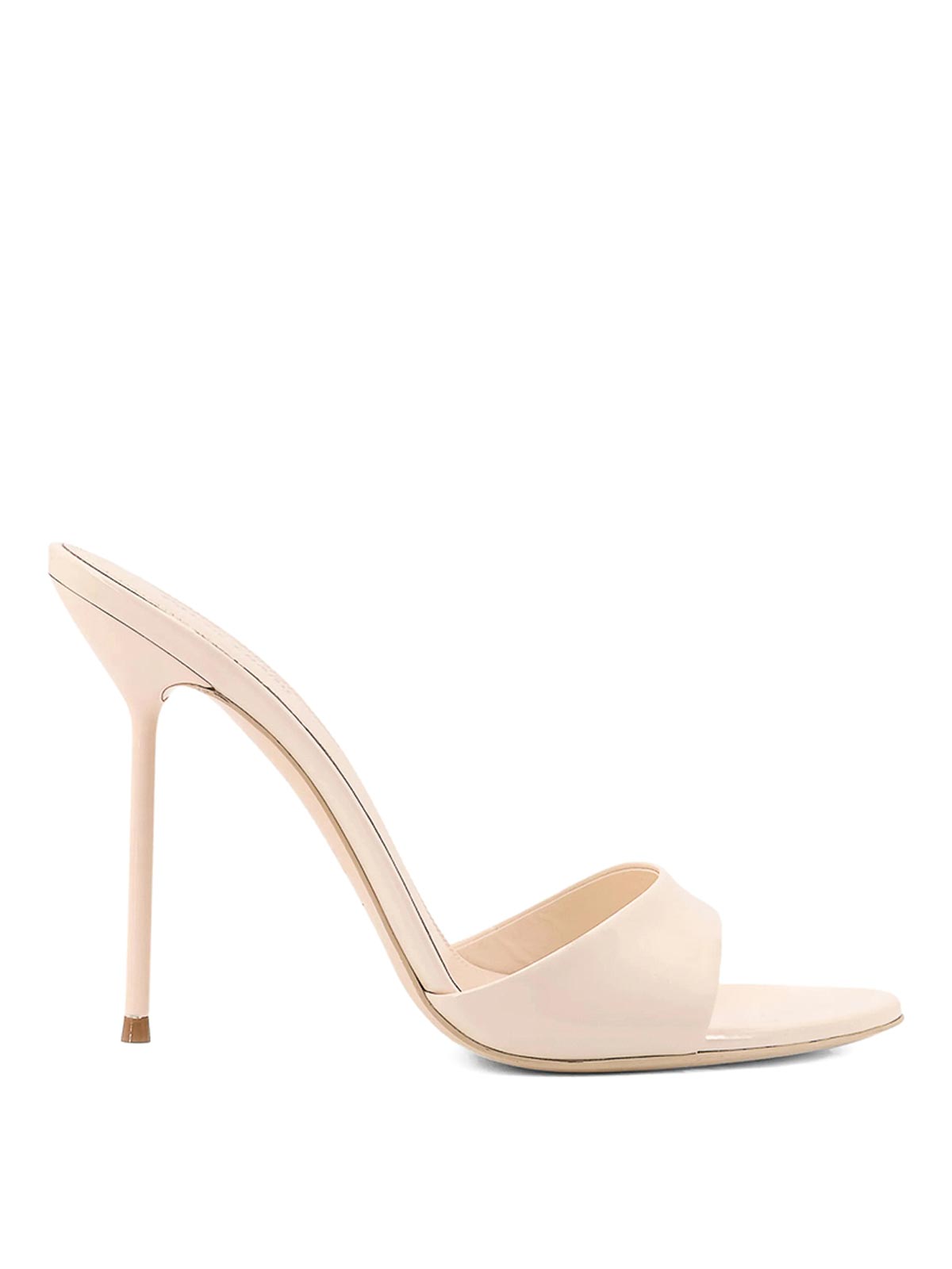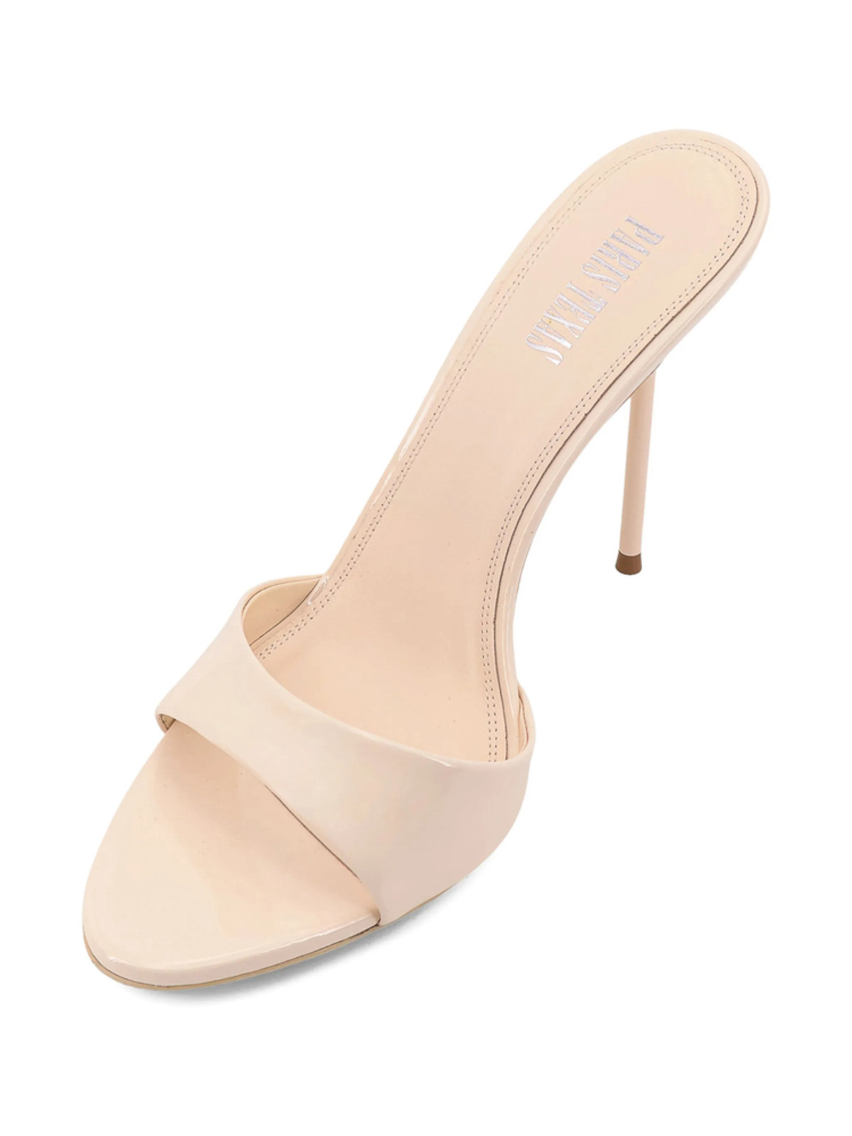 アーモンドベージュパテントレザースティレットヒールオープントゥシングルストラップ