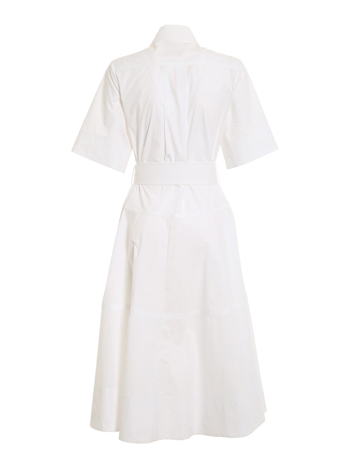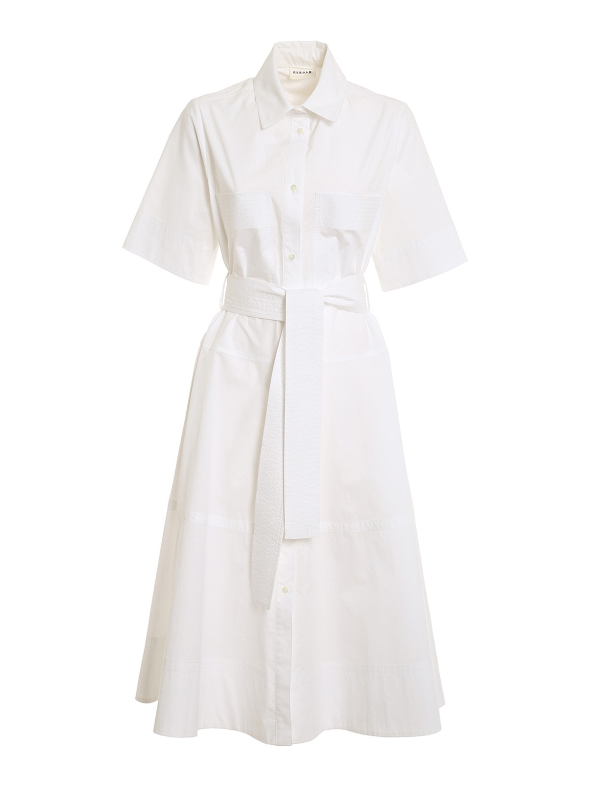 コットンポプリンシャツワンピース、パッチポケット2つ、ベルト付き。