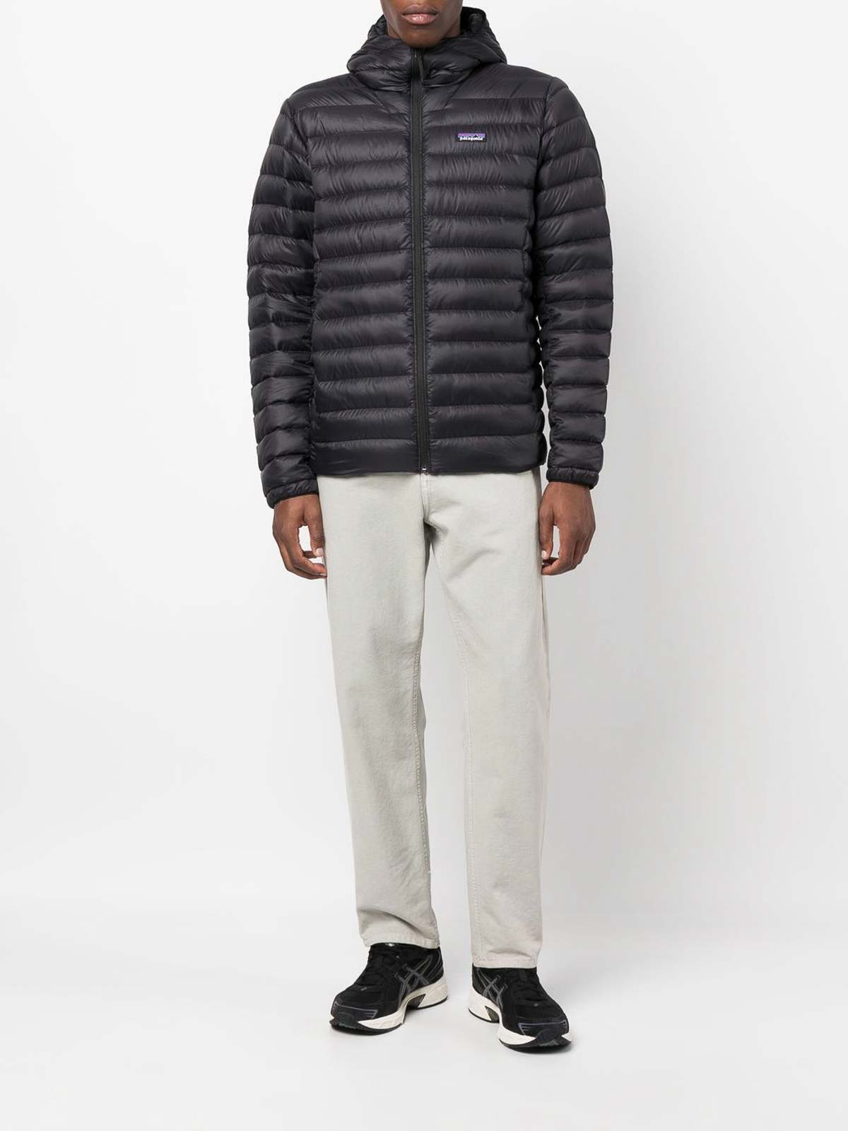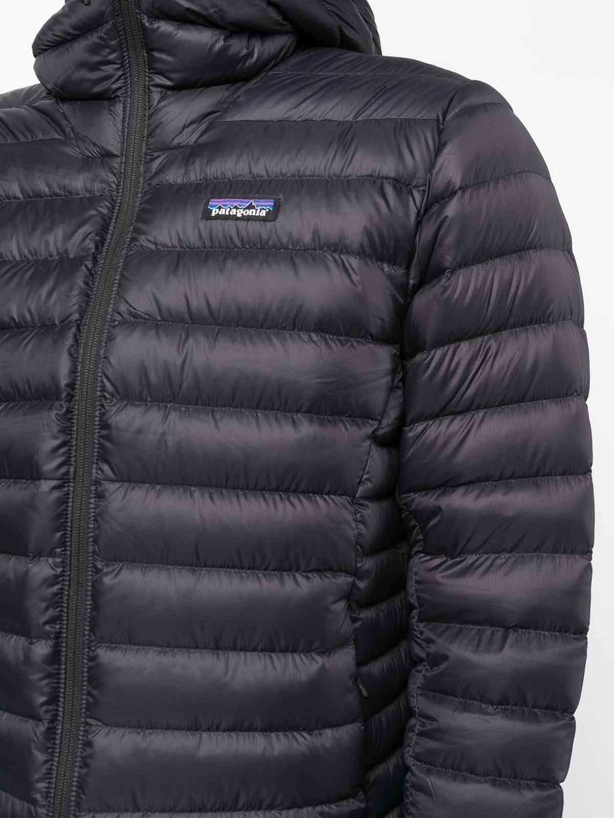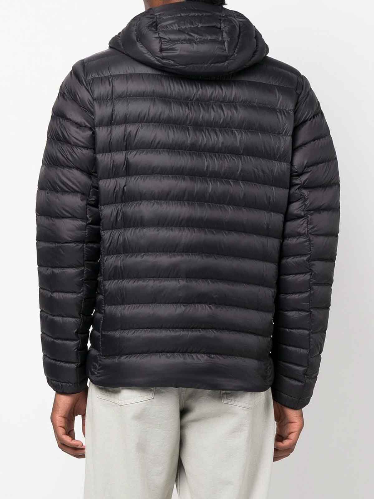 ジェットブラック、パッド入りデザイン、胸にキルトロゴパッチ、クラシックフード、ジッパー、長袖、サイドスリットポケット、ストレートヘム