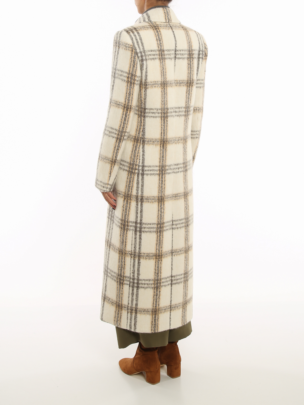 チェック柄のウール混紡コート。ドロップショルダーとボタン留め。