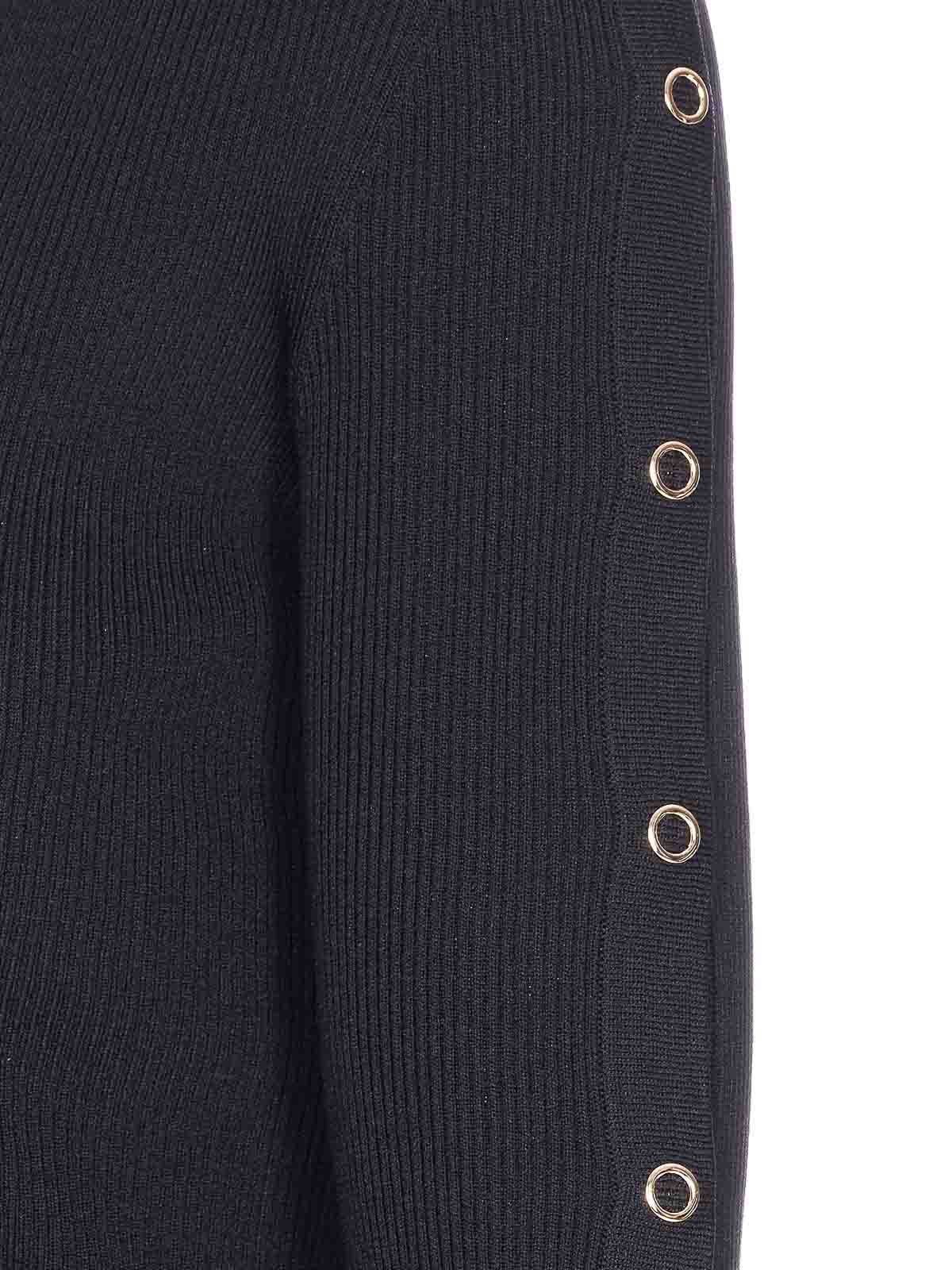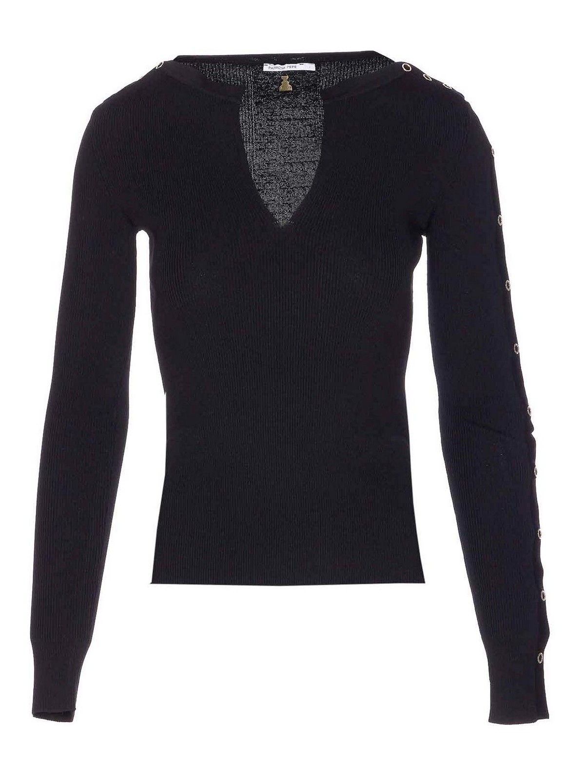 Patrizia pepe ブラックロングスリーブトップ、クルーネック、ロングスリーブ、Vネック、肩にボタン、伸縮性のあるフィット