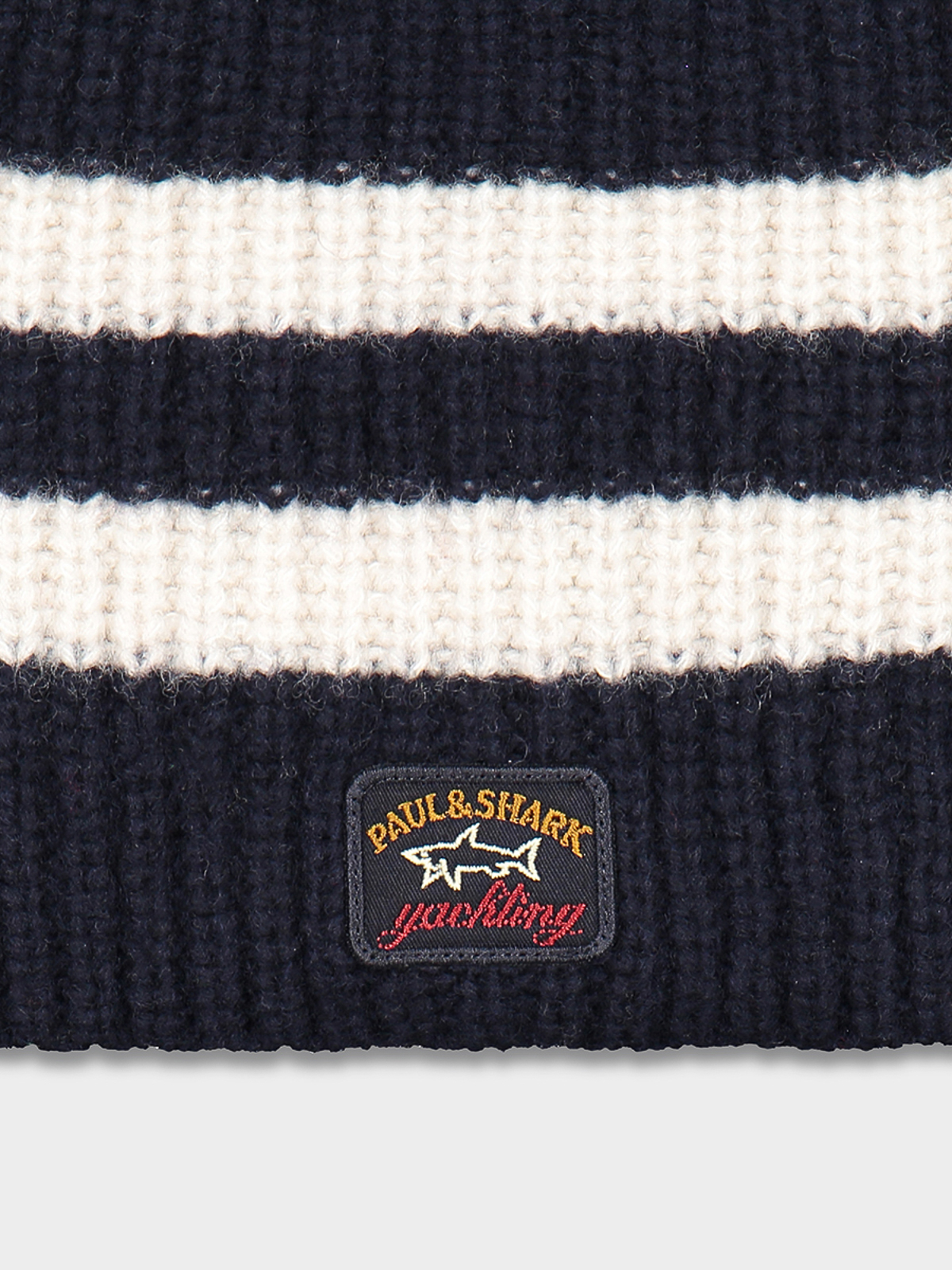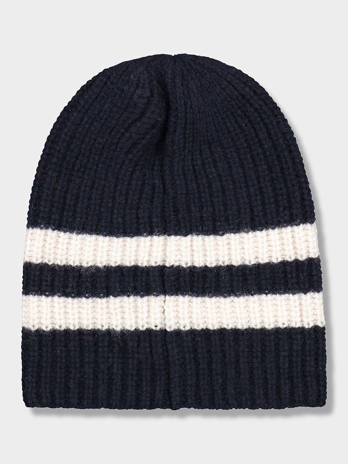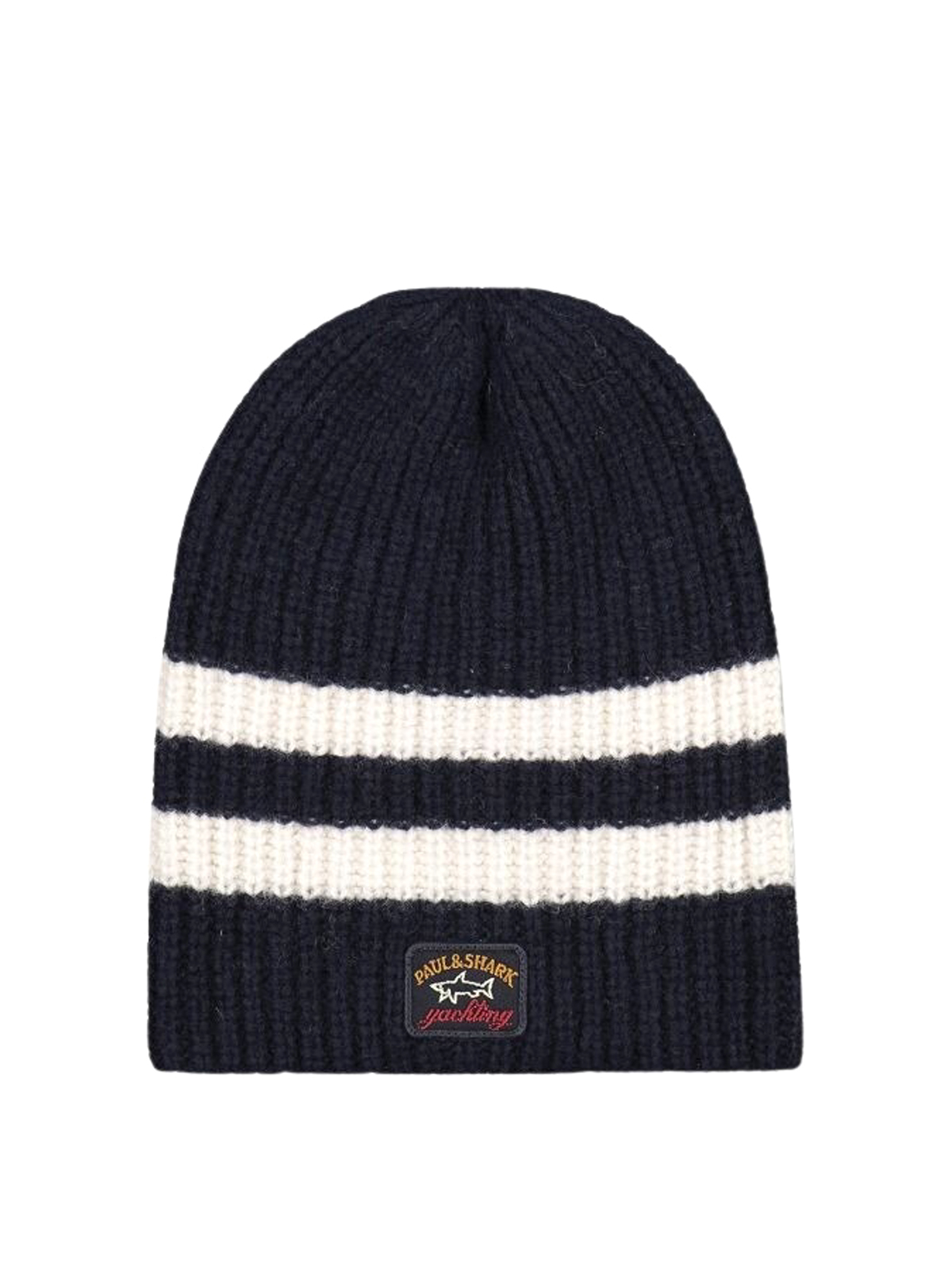 ブルーの背景にアイコニックな柄のバッジが付いたリブ編みのウールキャップ、イタリア製、白のストライプ