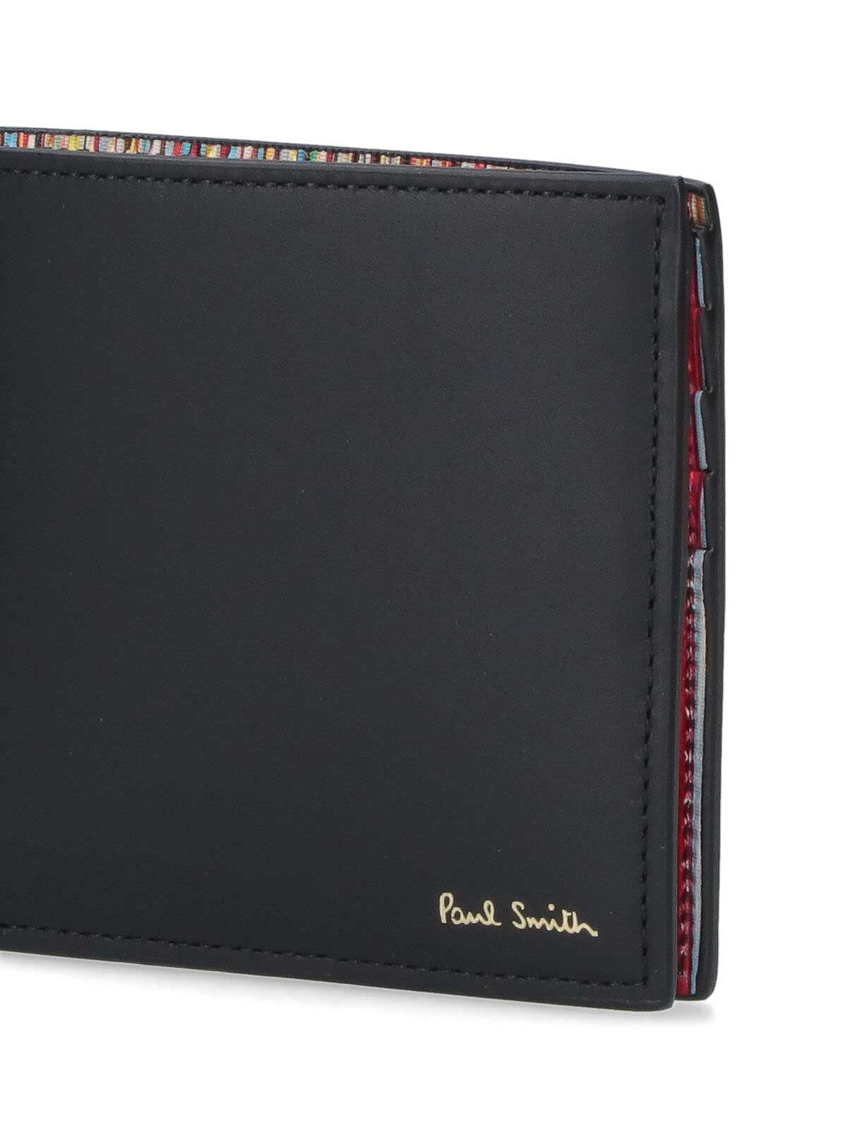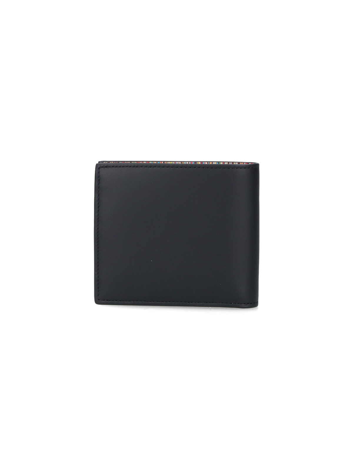 Paul Smith 二つ折りカードホルダー、ブラックカーフスキン、フロントロゴプリント、内側マルチカラーディテール、内部カードスロット8、内部フラットポケット2、内部紙幣用コンパートメント1