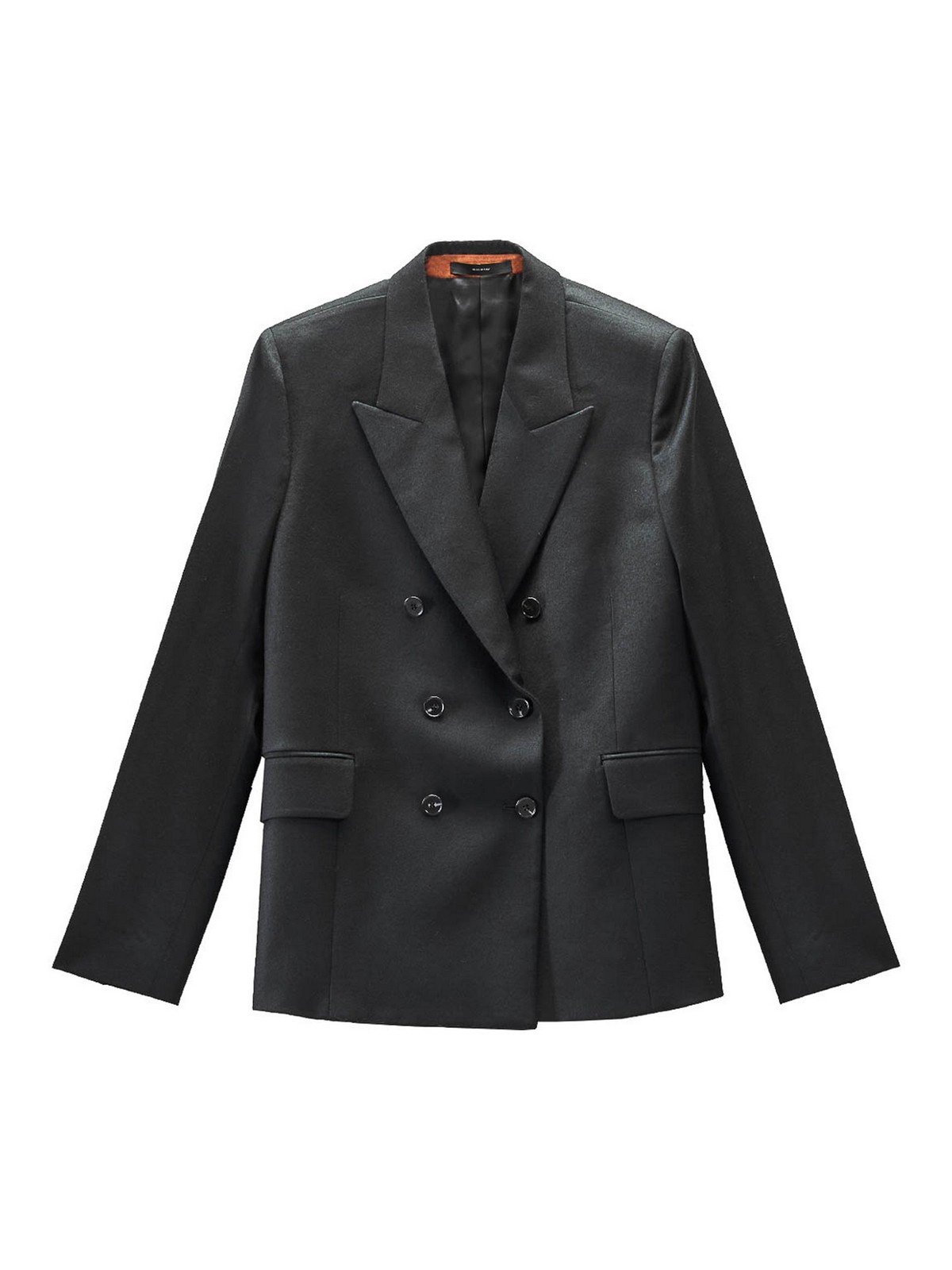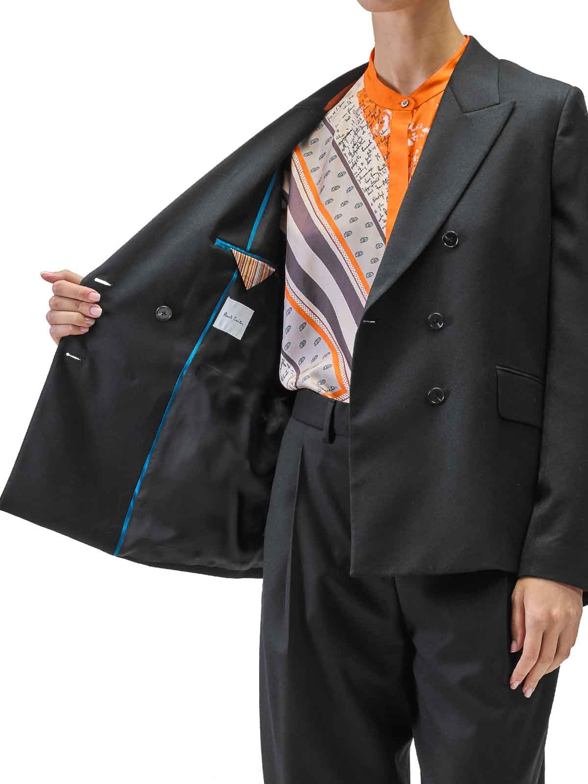 カシミア混のダブルブレストジャケット。カラーはブラック。Paul Smith ウールとカシミア混紡のスーツジャケット。ストレートフィットのダブルブレストシルエット。ラペルカラーとフラップポケットが2つ付いています。ダブルブレスト、ストレートフィット、ラペルカラー、フラップポケット2つ。カラー:ブラック。90% ウール、10% カシミアルーズフィット。イタリア製。