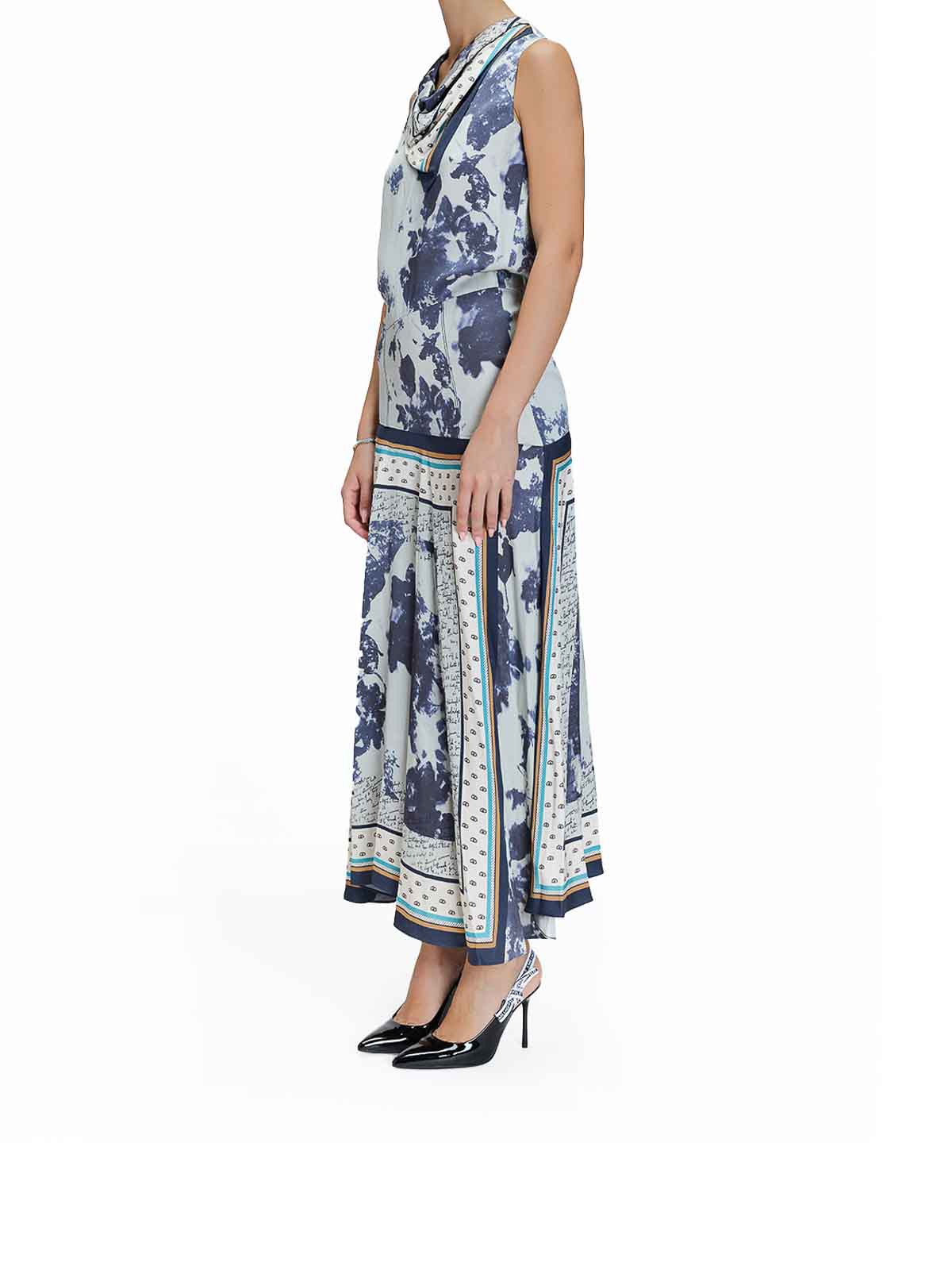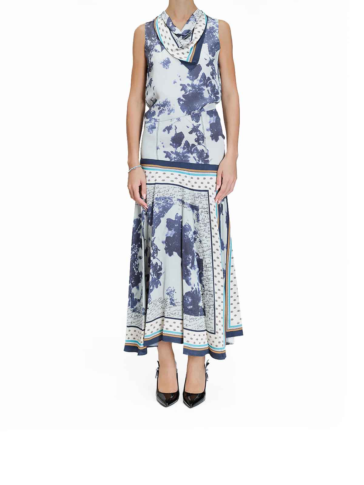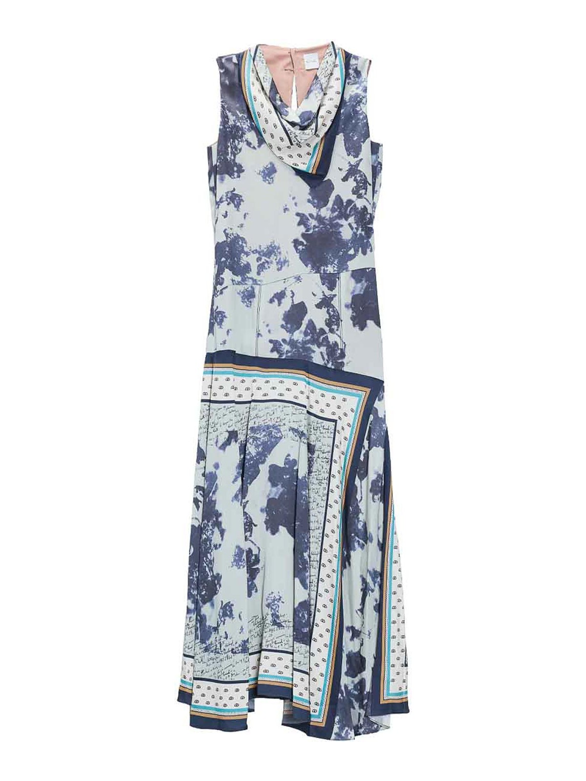 スカーフプリントのドレス。カラーはブルー。ポール・スミスによるスカーフプリントのノースリーブドレス。ドレープドカラー、ハンカチヘム、ややアシンメトリー、後ろがすくいデザインが特徴。スカーフプリント、ノースリーブ、ドロップウエスト、ドレープカラー、ハンカチヘム、アシンメトリースカート、バックスクープネック、隠しバックジッパー。カラー:ブルーマルチ。100% ビスコース。