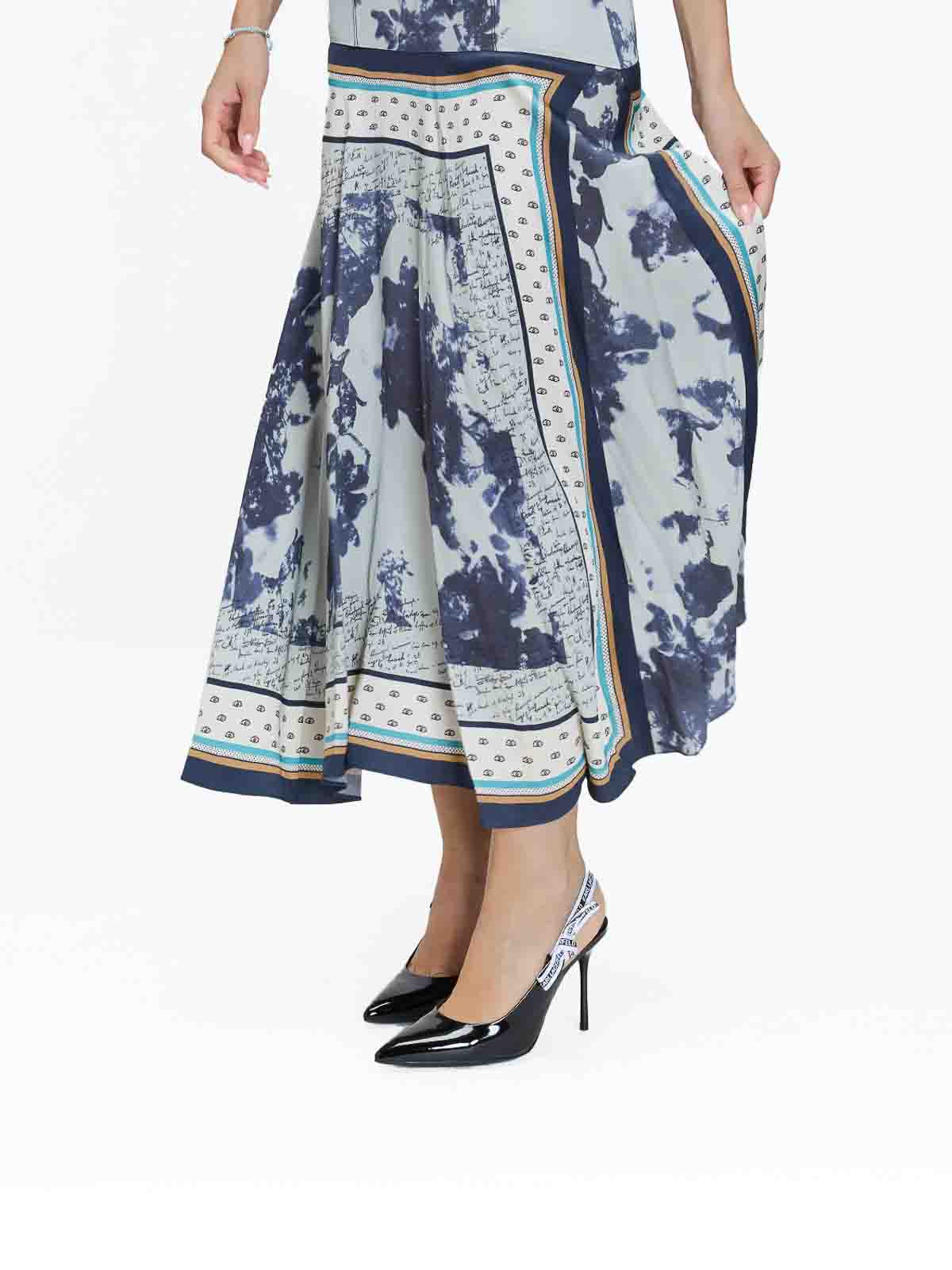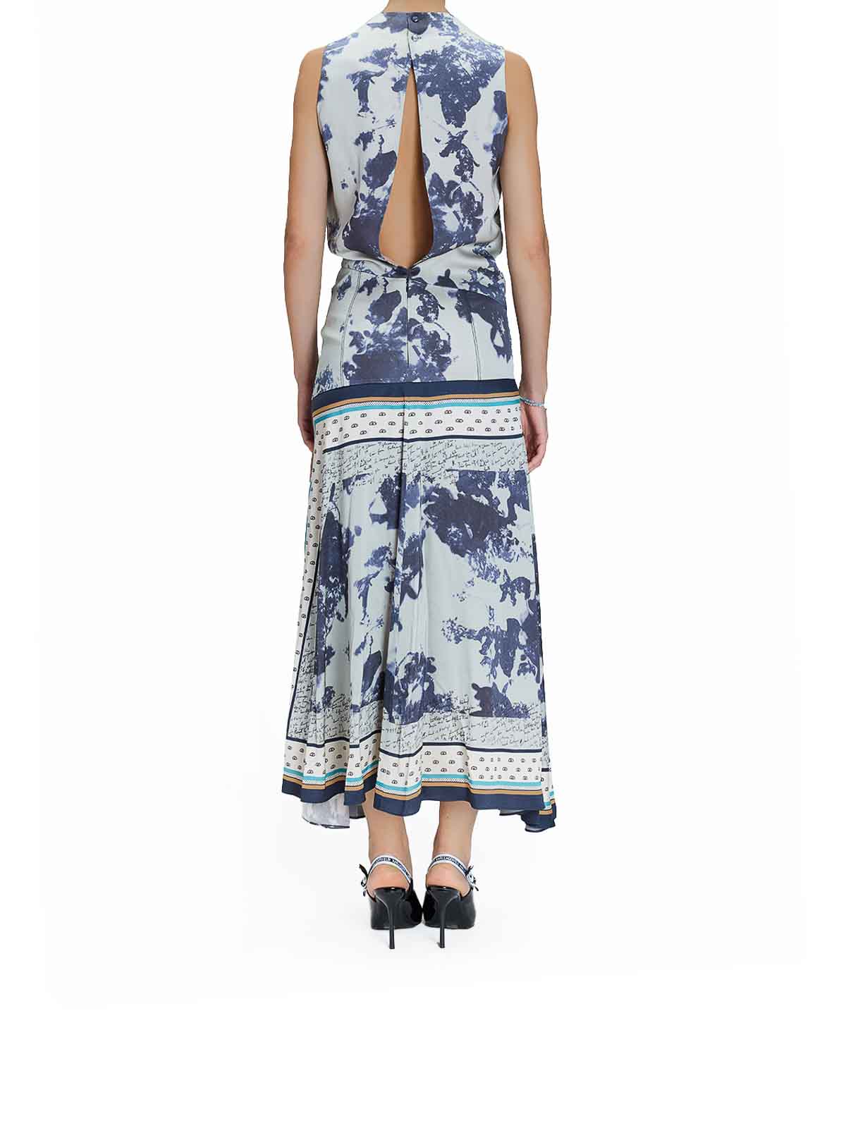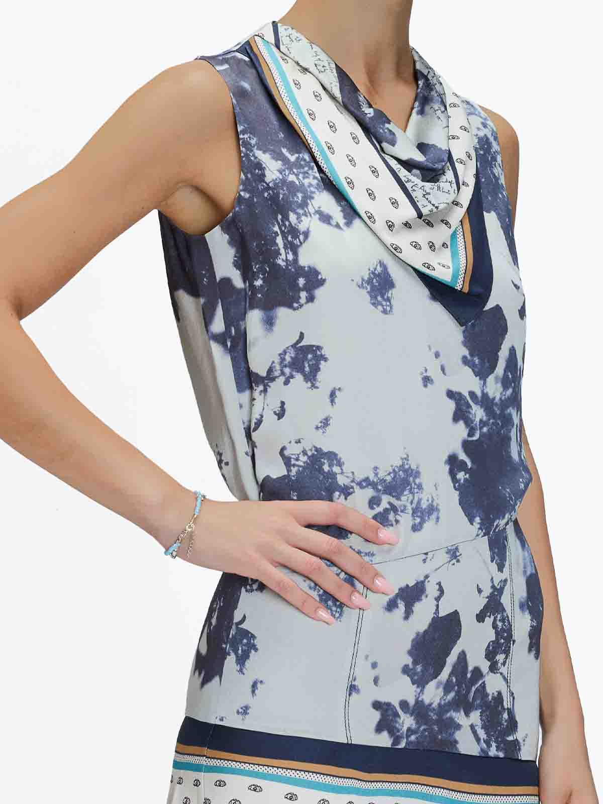 スカーフプリントのドレス。カラーはブルー。ポール・スミスによるスカーフプリントのノースリーブドレス。ドレープドカラー、ハンカチヘム、ややアシンメトリー、後ろがすくいデザインが特徴。スカーフプリント、ノースリーブ、ドロップウエスト、ドレープカラー、ハンカチヘム、アシンメトリースカート、バックスクープネック、隠しバックジッパー。カラー:ブルーマルチ。100% ビスコース。