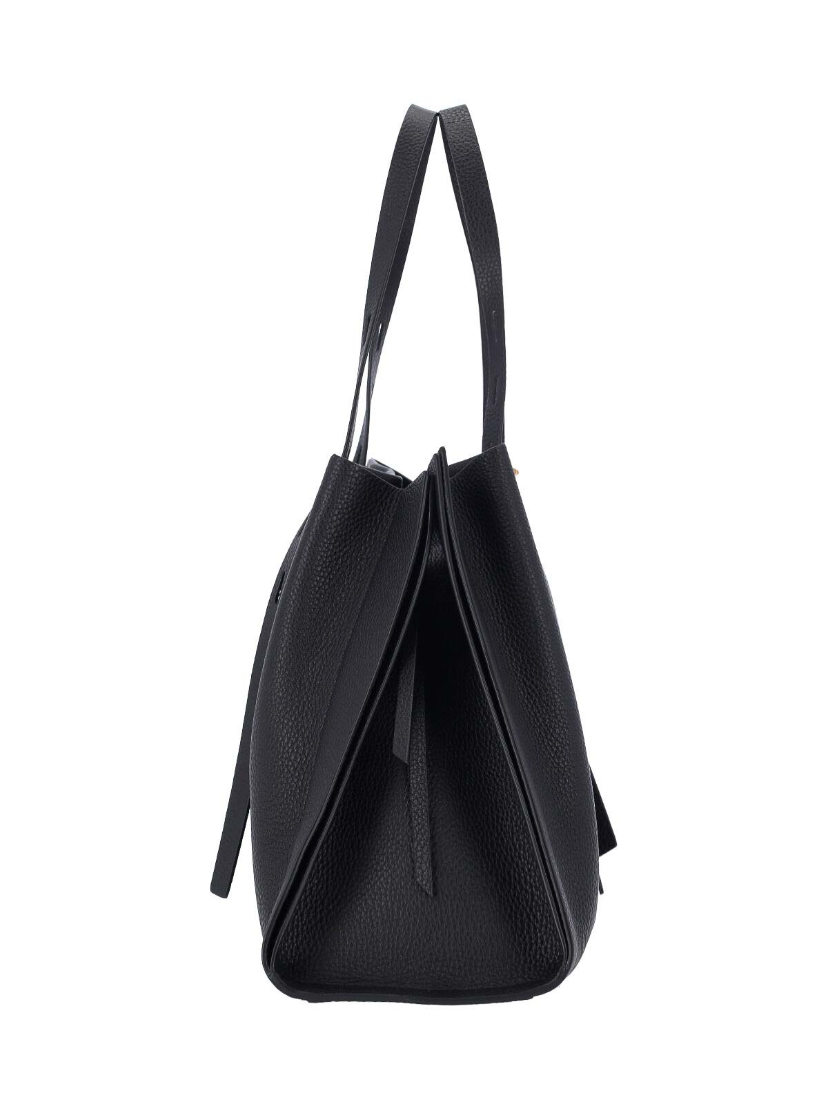 ブラックカーフスキンのポーラミノボッシショルダーバッグ、調節可能なトップハンドル2つ、ロブスタークラスプとメタルボタンクロージャー、内部フラップポケット1つ、内部ファスナーポケット1つ、メイン内部コンパートメント1つ。