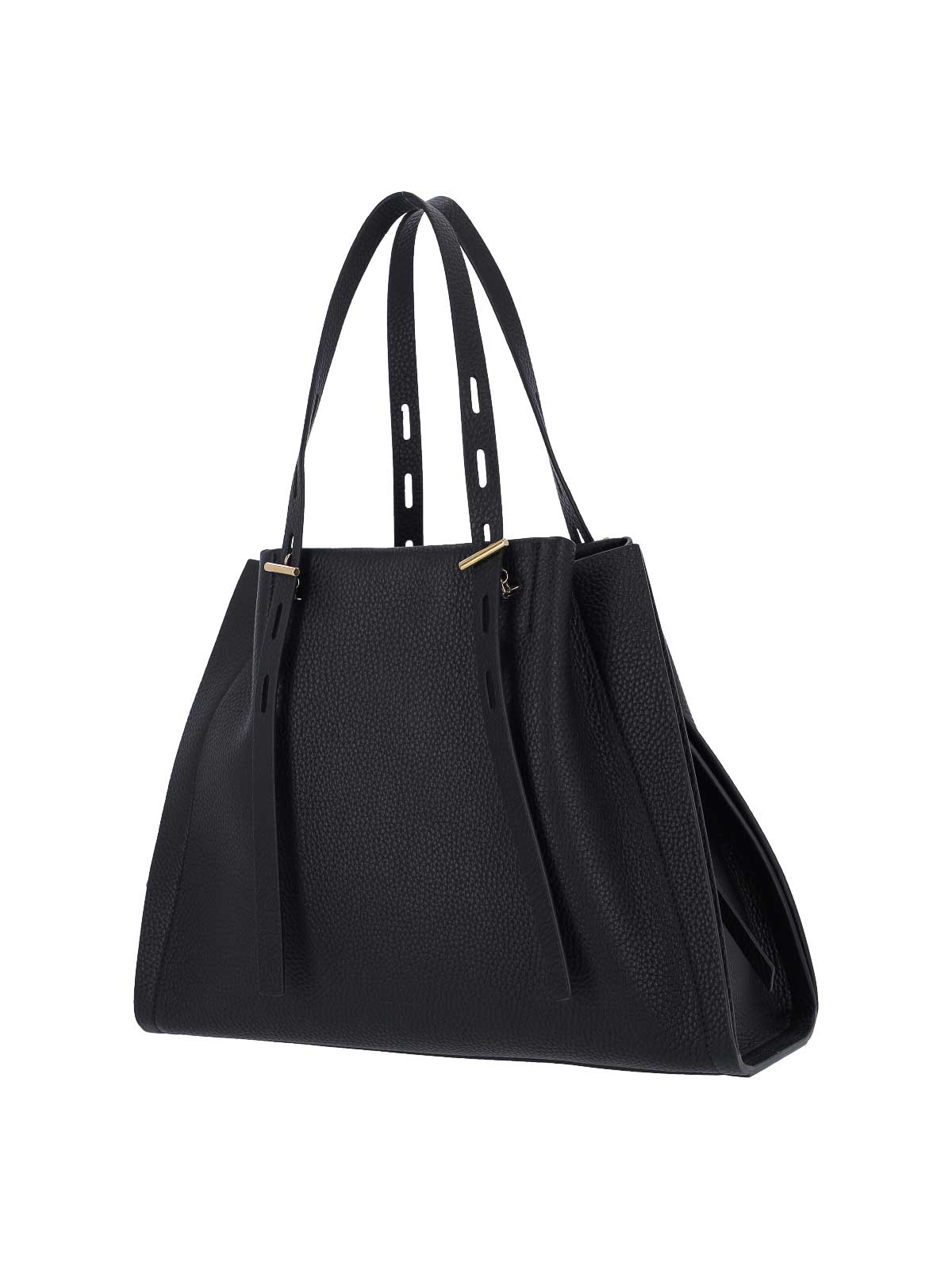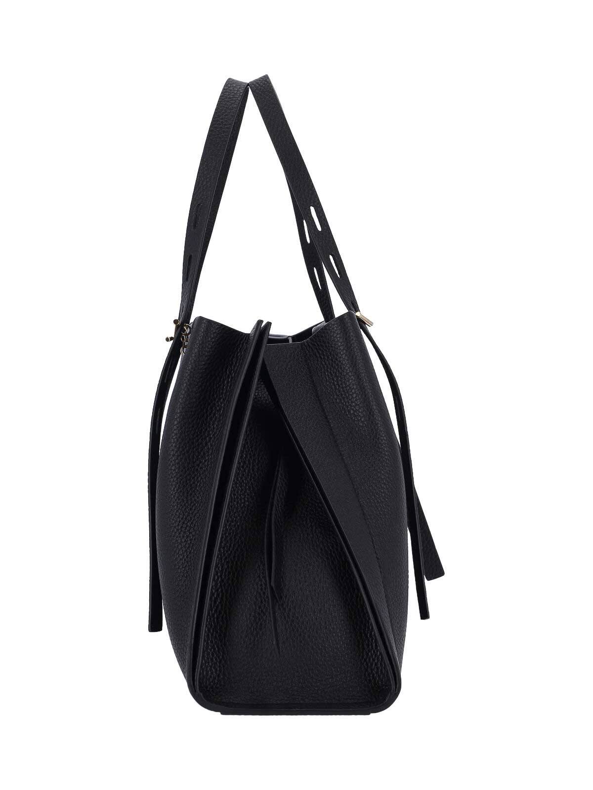 ブラックカーフスキンのミノボッシポーレットショルダーバッグ、調節可能なトップハンドル2つ、メタルボタンとスナップフッククロージャー、内部フラットポケット1つ、内部ファスナーポケット1つ、内部メインコンパートメント1つ。