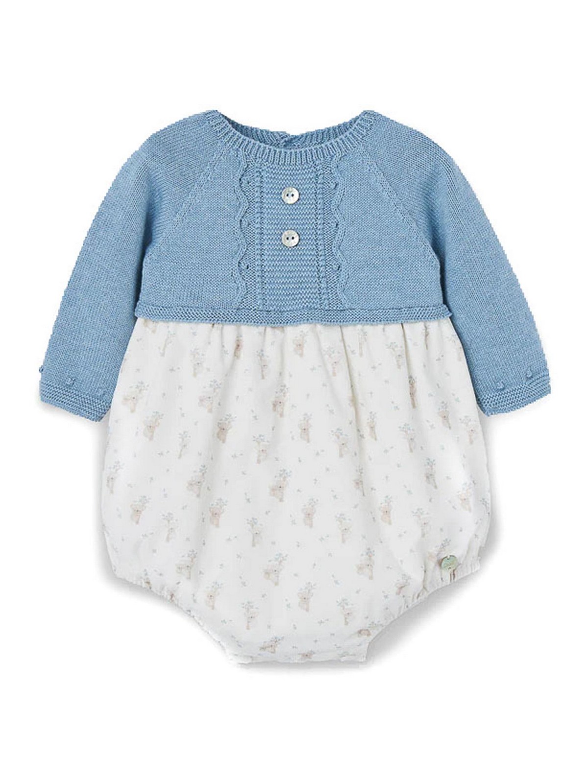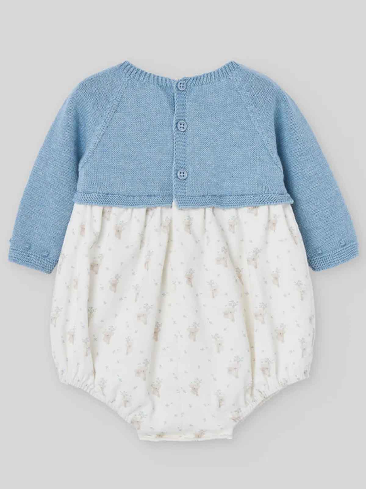 裾にボタン付き、シャツに刺繍が入ったプリント柄のロンパース