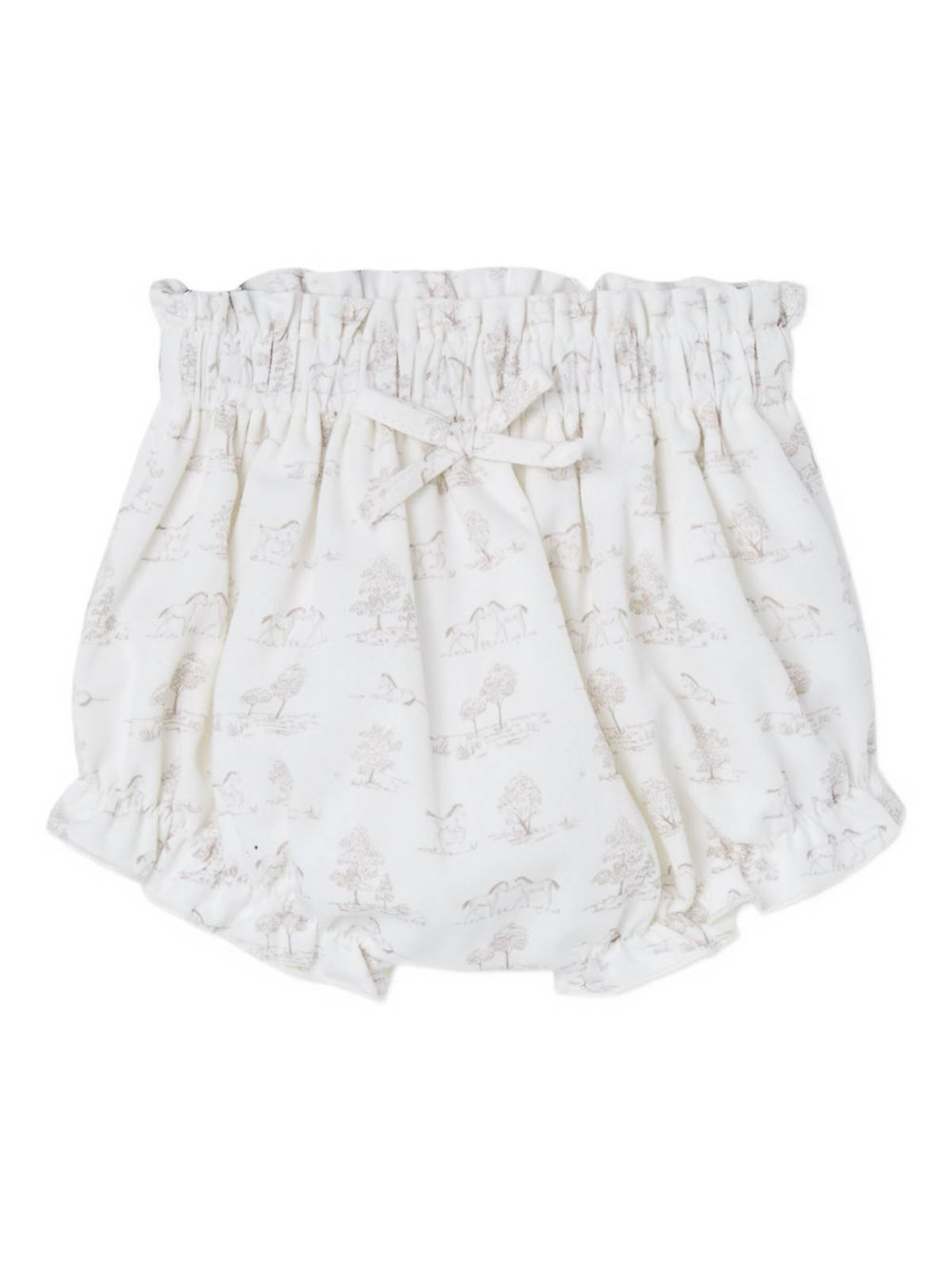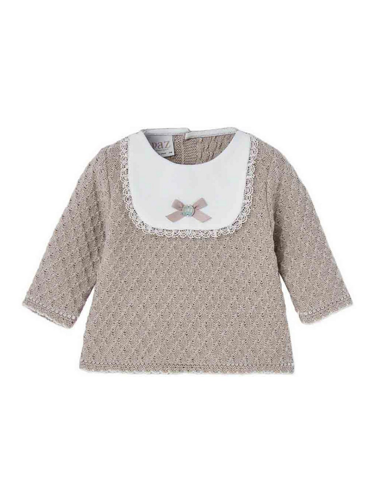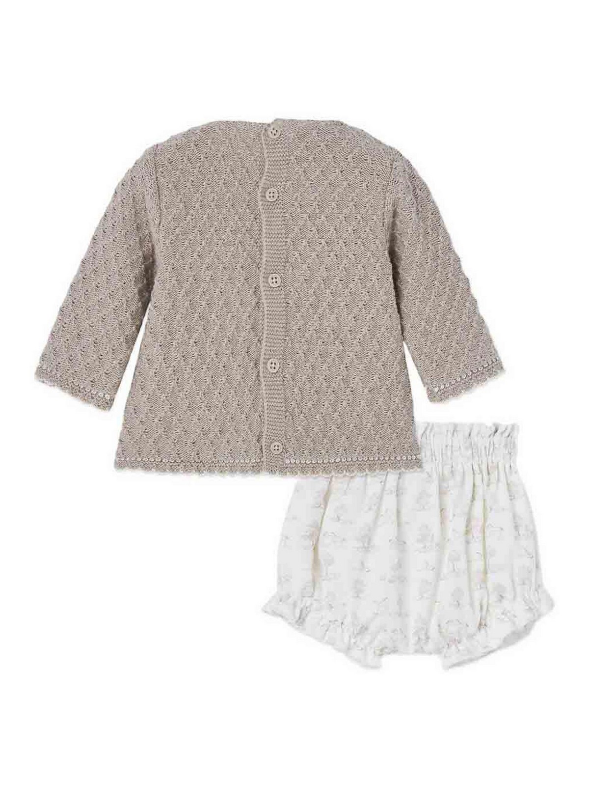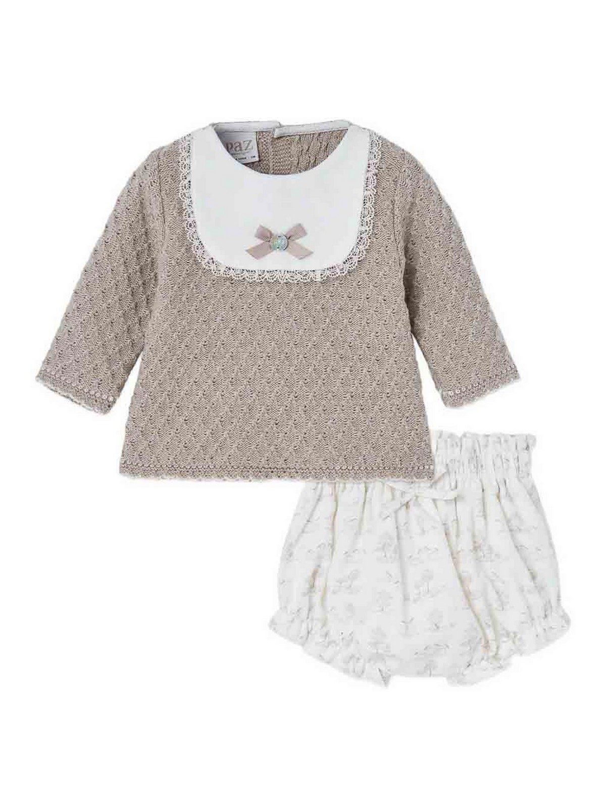ベージュのニット、リボンのディテール、ボタン留め、全面プリントのショートパンツ、伸縮性のあるウエストが特徴のプルオーバーとキュロットのセット