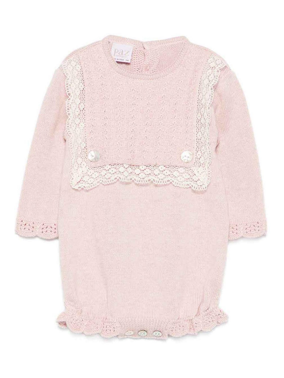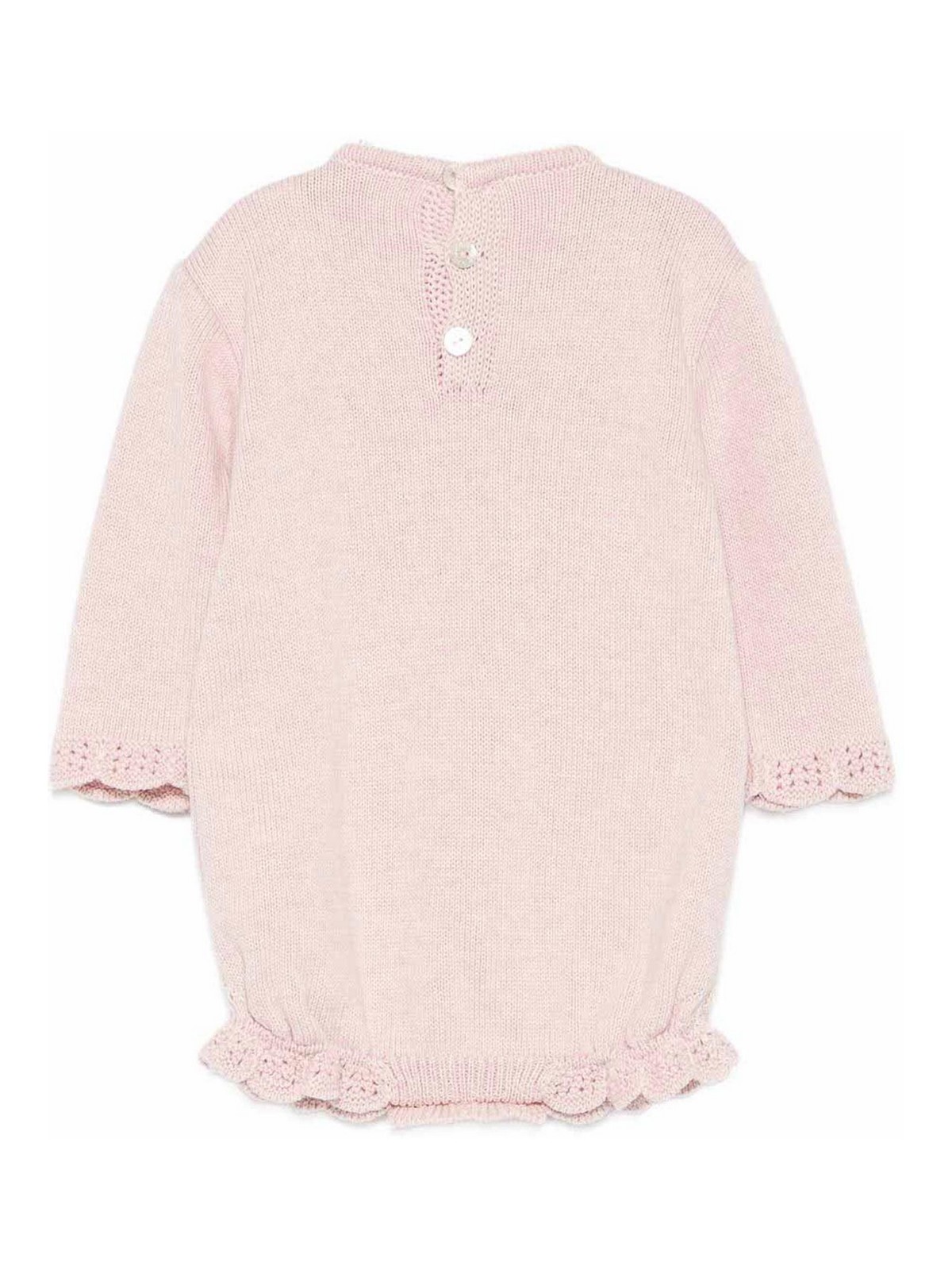 レーストリムプレイスーツは、ほこりっぽいピンクのレーストリムボタンニットのスカラップヘムが特徴です