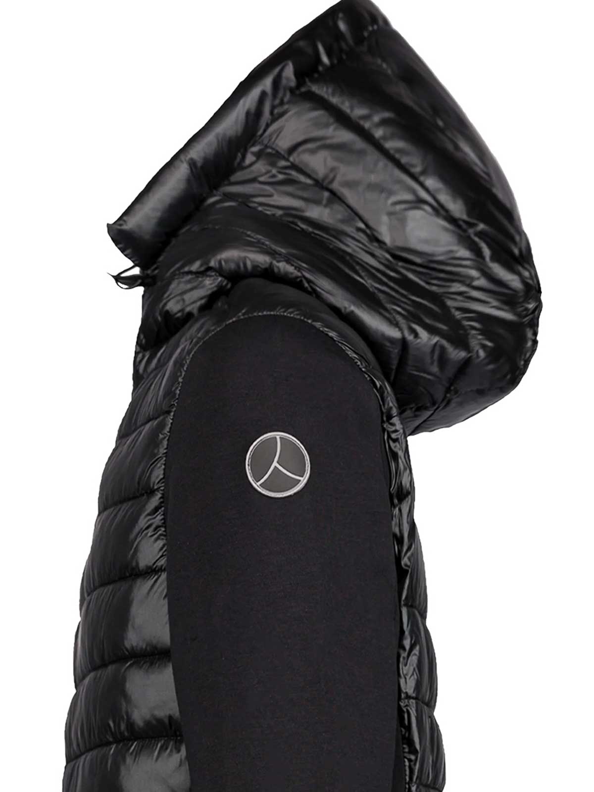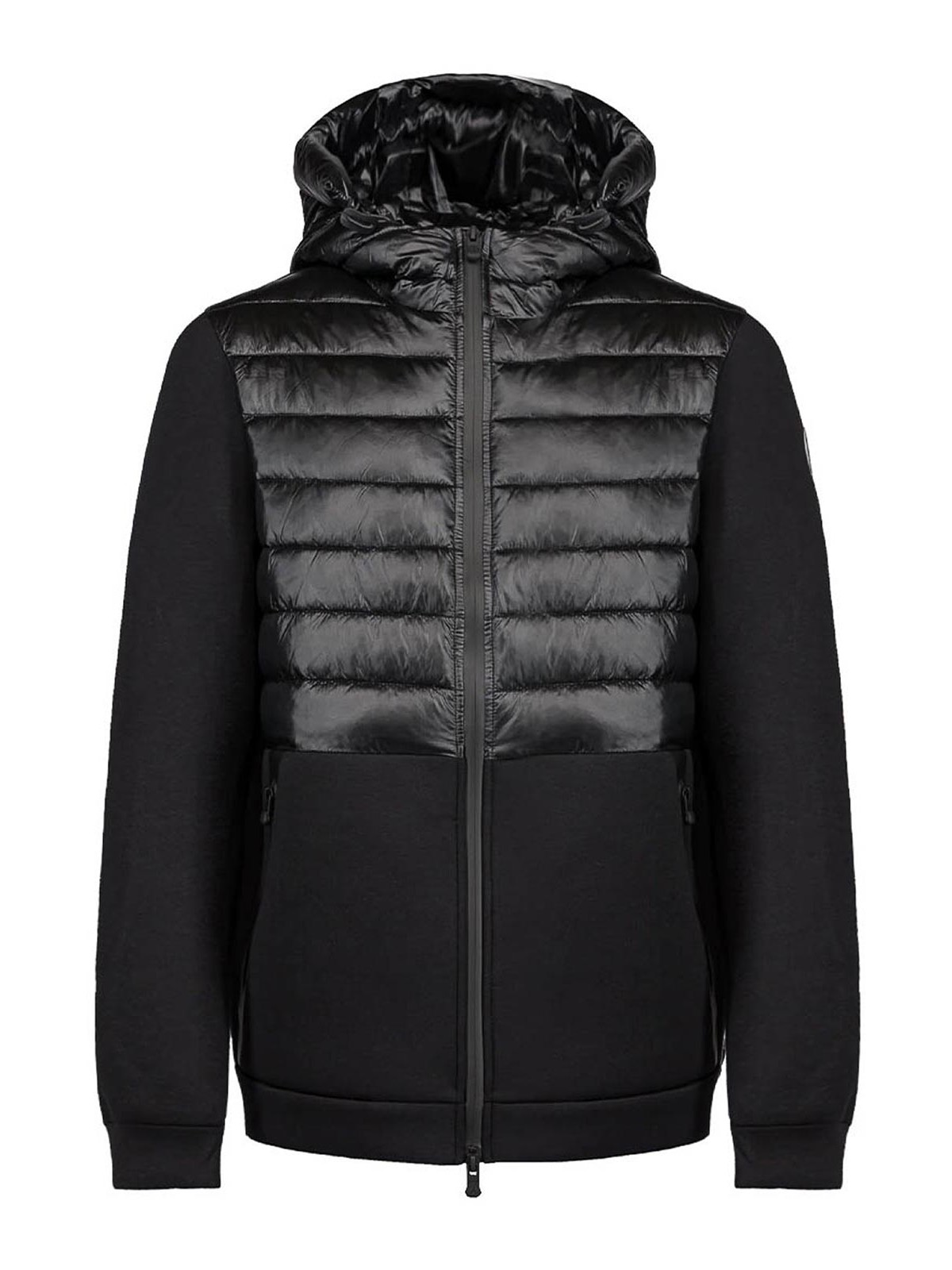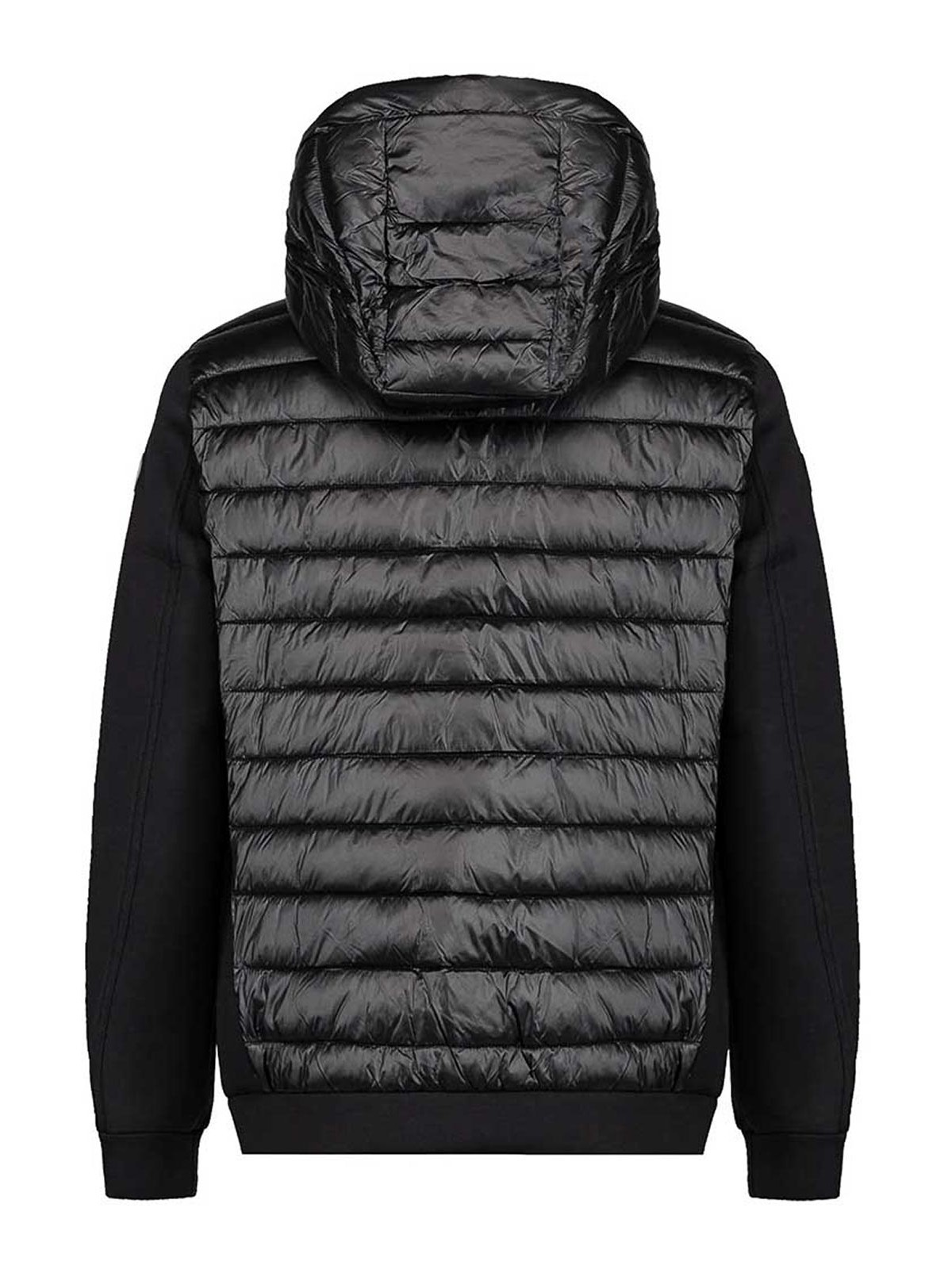 渋谷の人々による黒のフルジップテクニカルパーカー。胸部、フード、背中を保温性のある柔らかいキルティングナイロン製で、ジッパー付きポケット付きのポーチが特徴です。