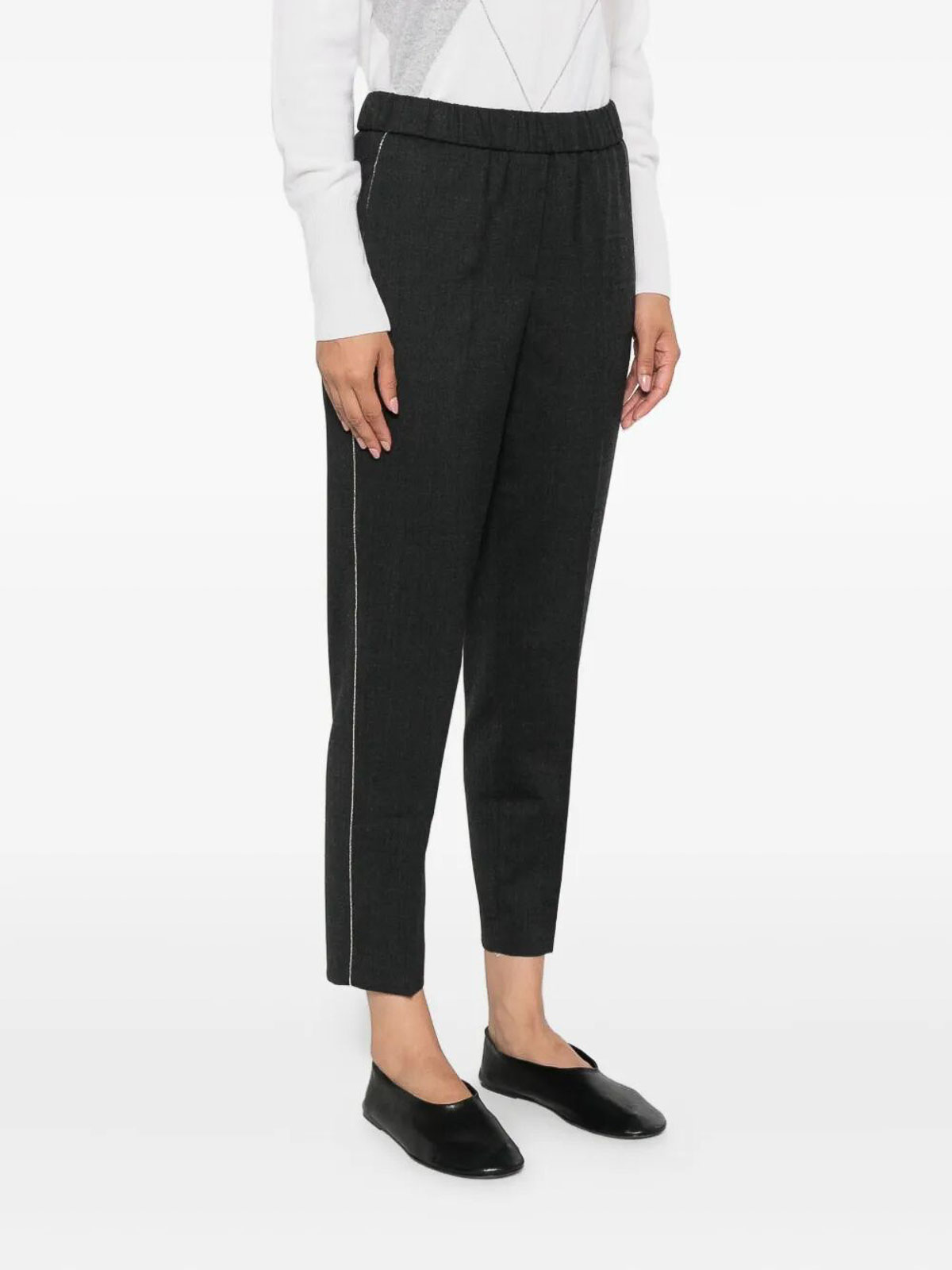 ダークグレー、伸縮性のあるウエストバンド、サイドストライプのアクセント、ストレートレッグフィット