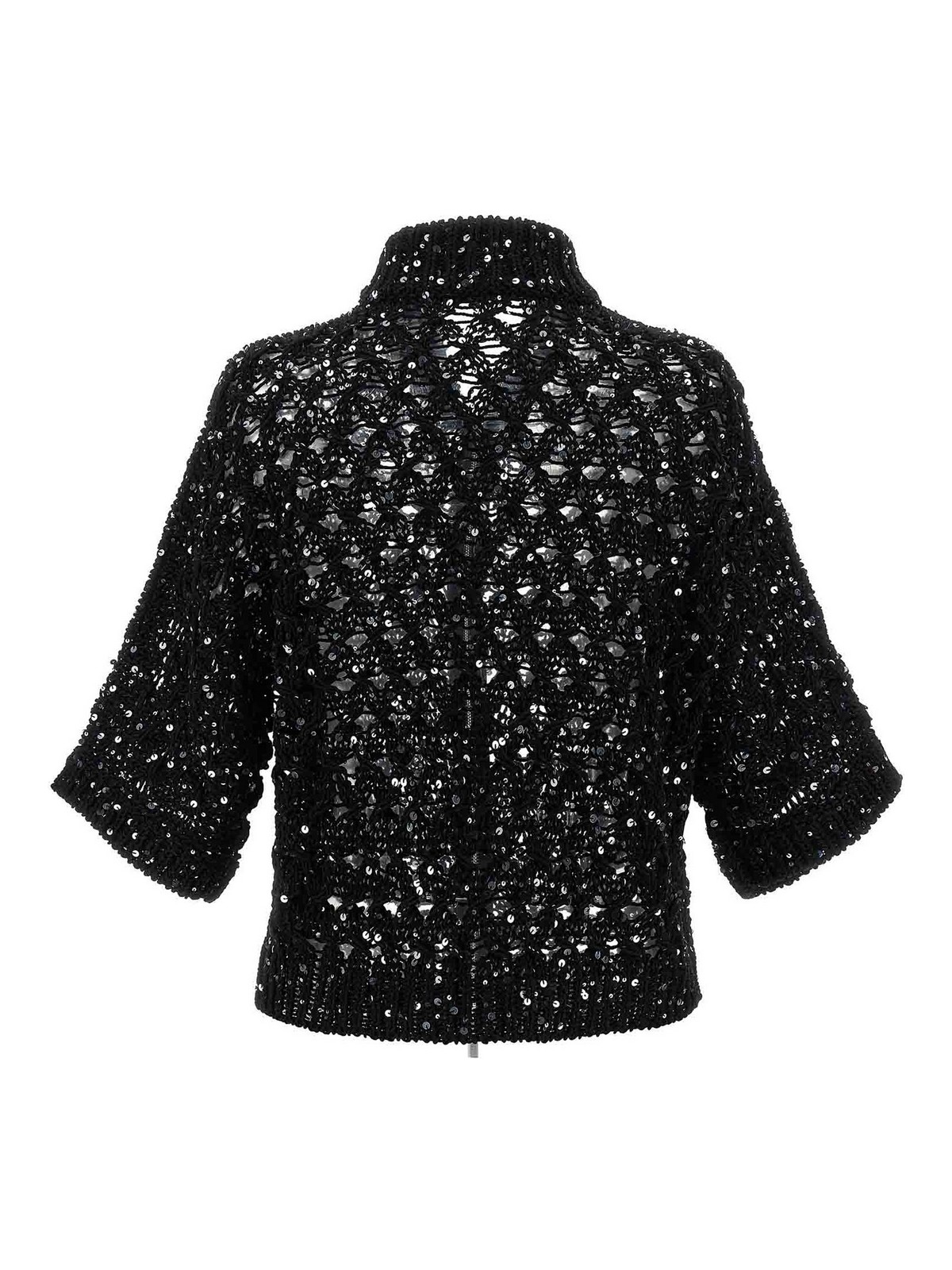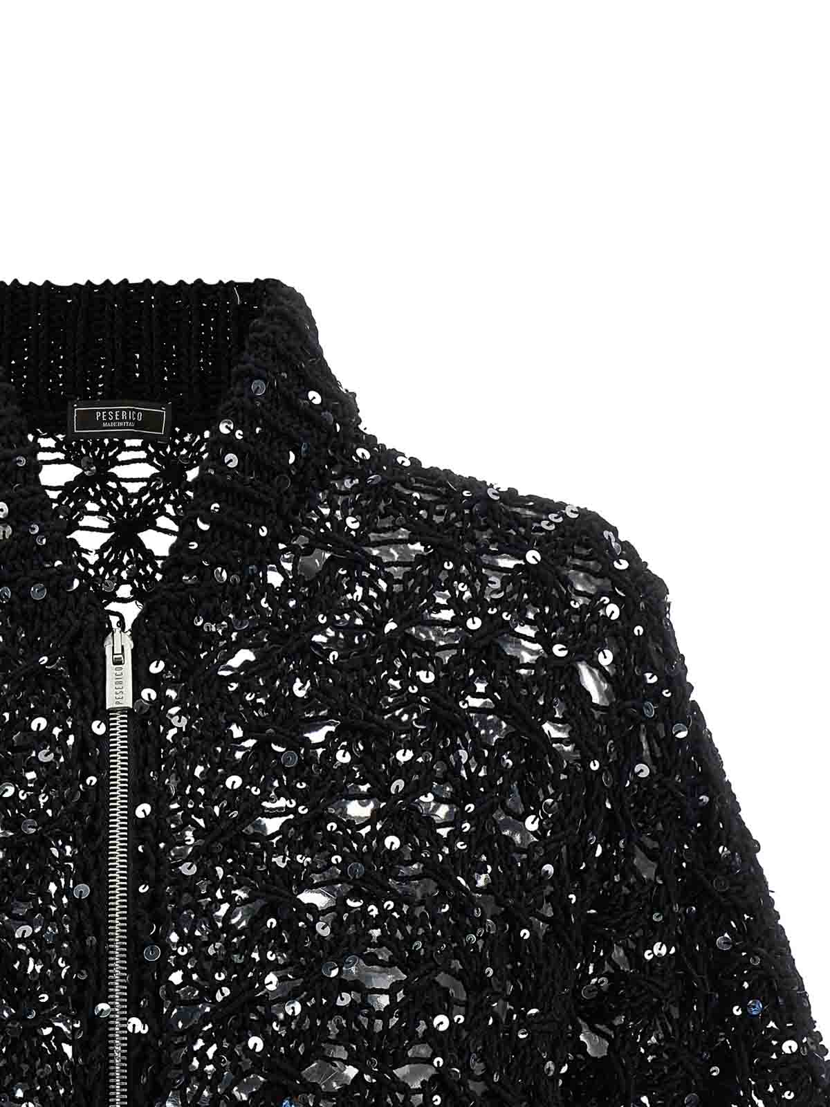 全体にスパンコールのアップリケ、クルーネック、フロントファスナー、カフス付き半袖、ドロップショルダーをあしらったコットンメッシュのニットカーディガン。