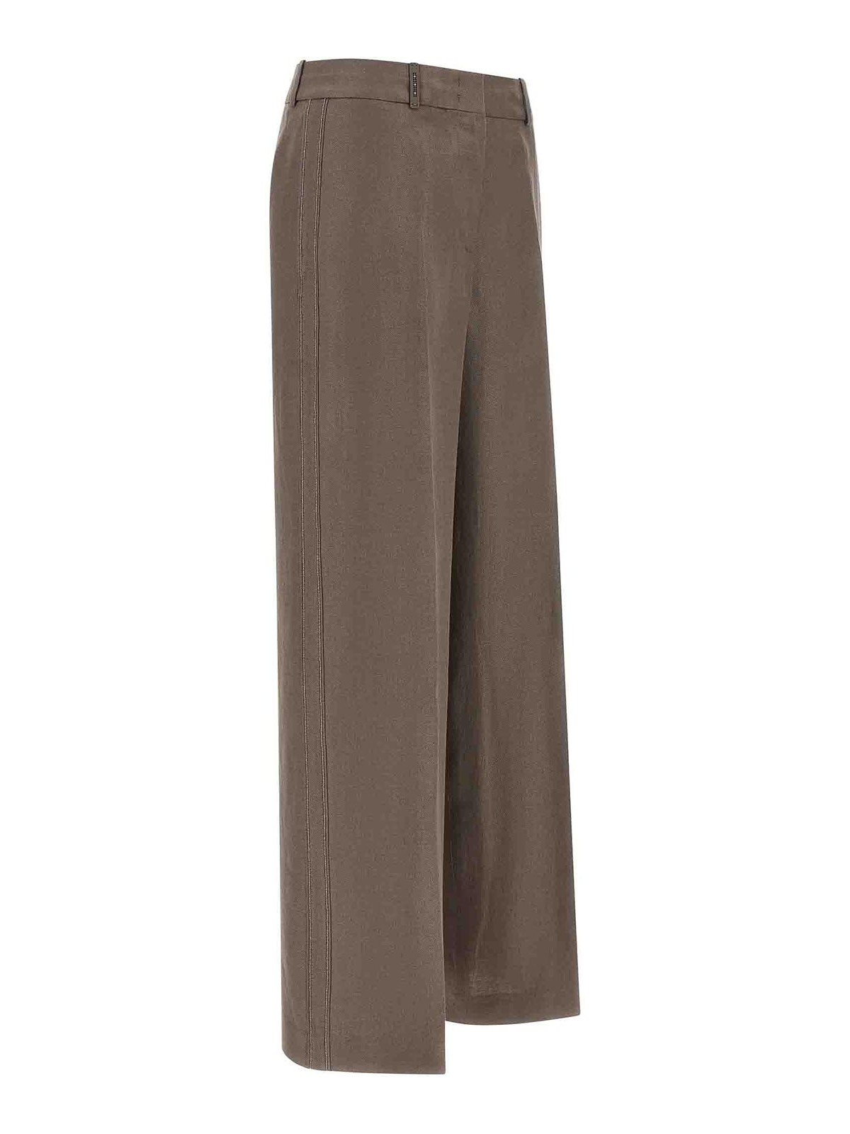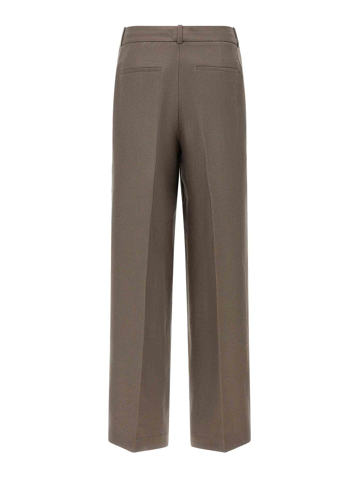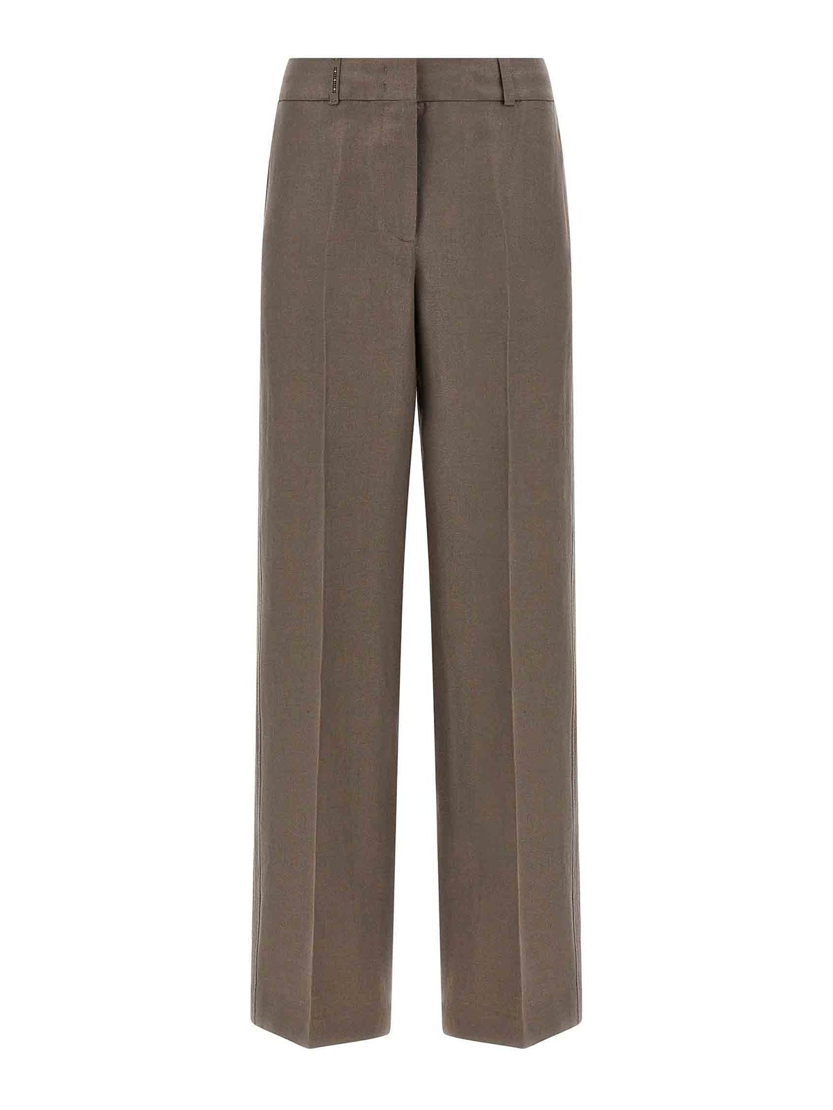 ピュアリネンのギャバジンパンツ、ワイドでストレートなレッグ、ストレッチプリーツ、メタルの「プントルース」のディテールをあしらったサイドバンド、フック、ジッパー、フロントボタン、ポケット、