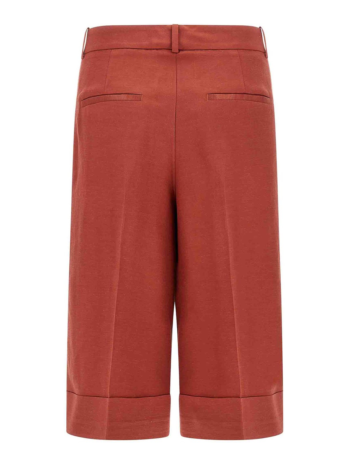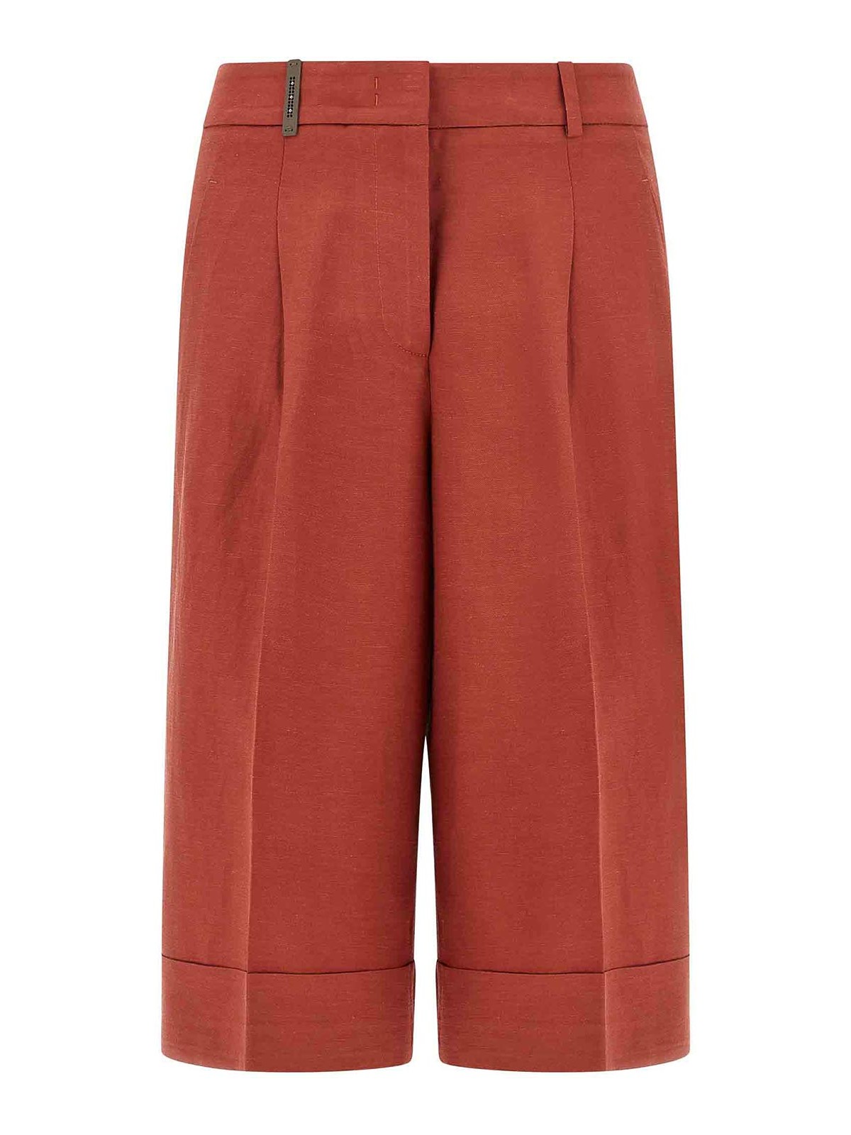 ビスコースとリネン混紡のバミューダショーツ、ピンス、ストレッチプリーツ、ワイドレッグ、ジッパーフック、フロントボタンクロージャー、ポケット、レッグボトムにメタルの「プントルース」のディテールをあしらったターンアップ。