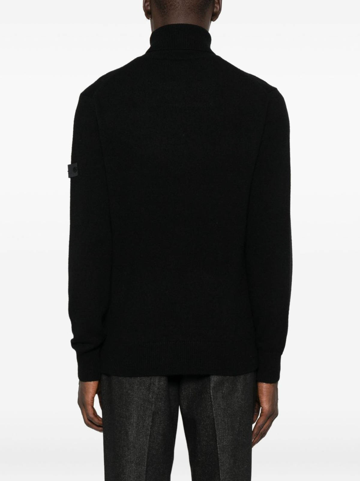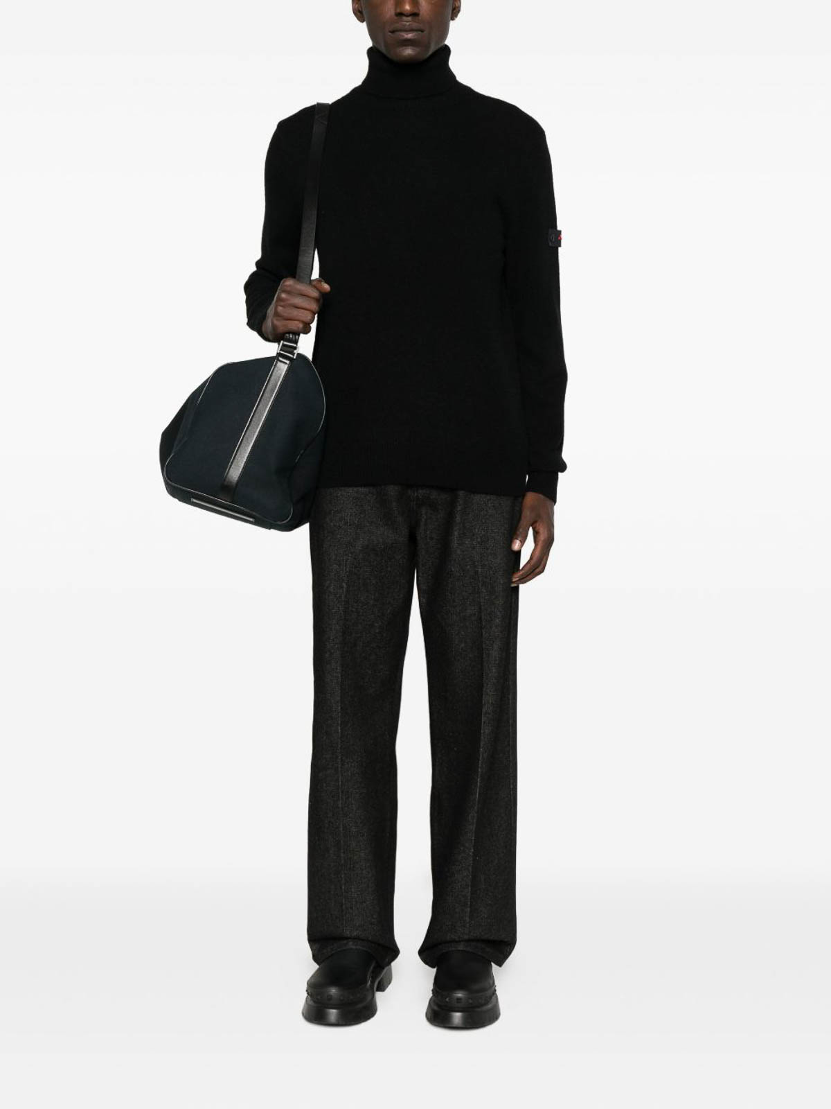 黒のタートルネック、長袖、リブ編みの袖口、リブ編みの裾、ロゴパッチが特徴