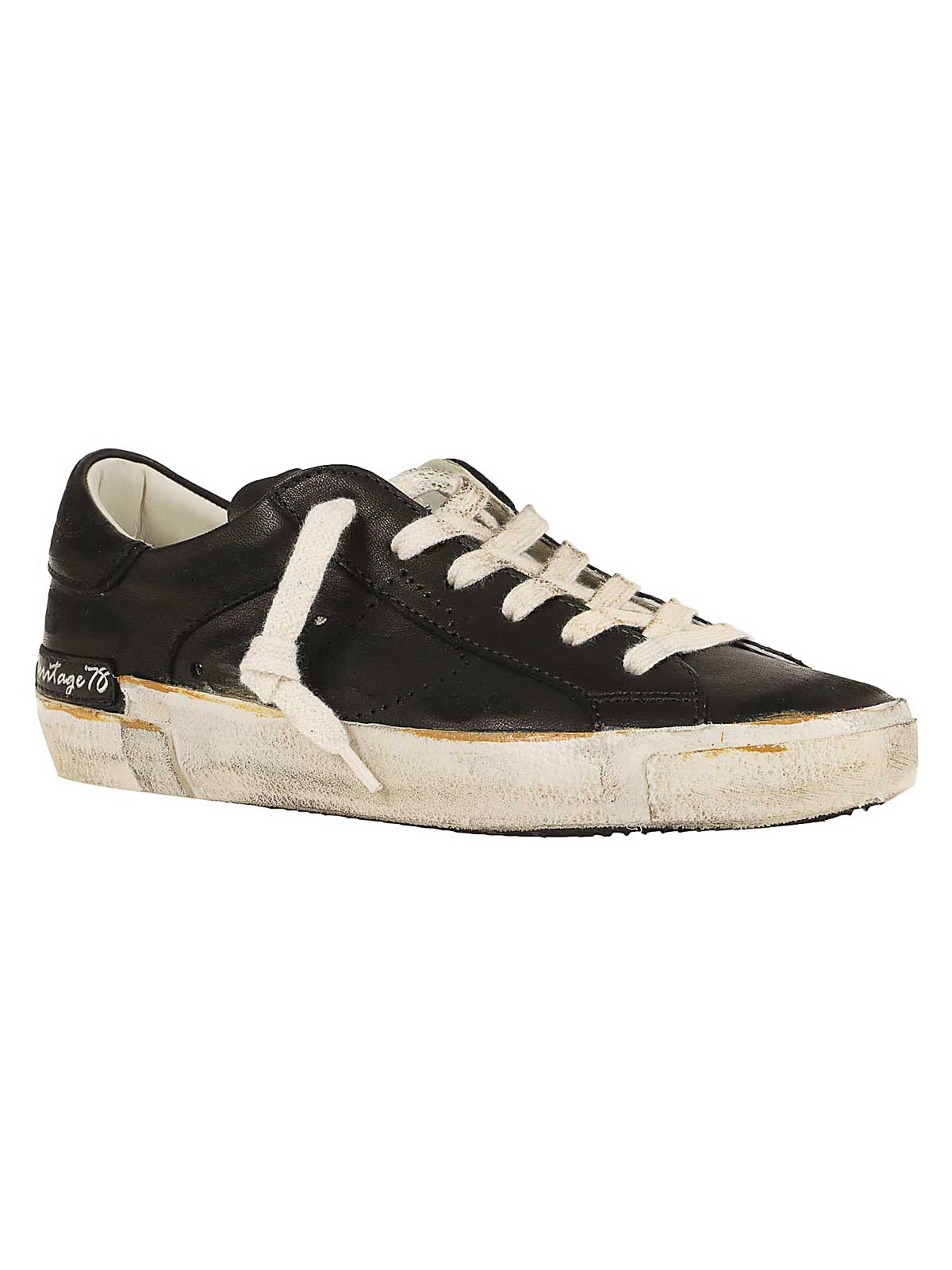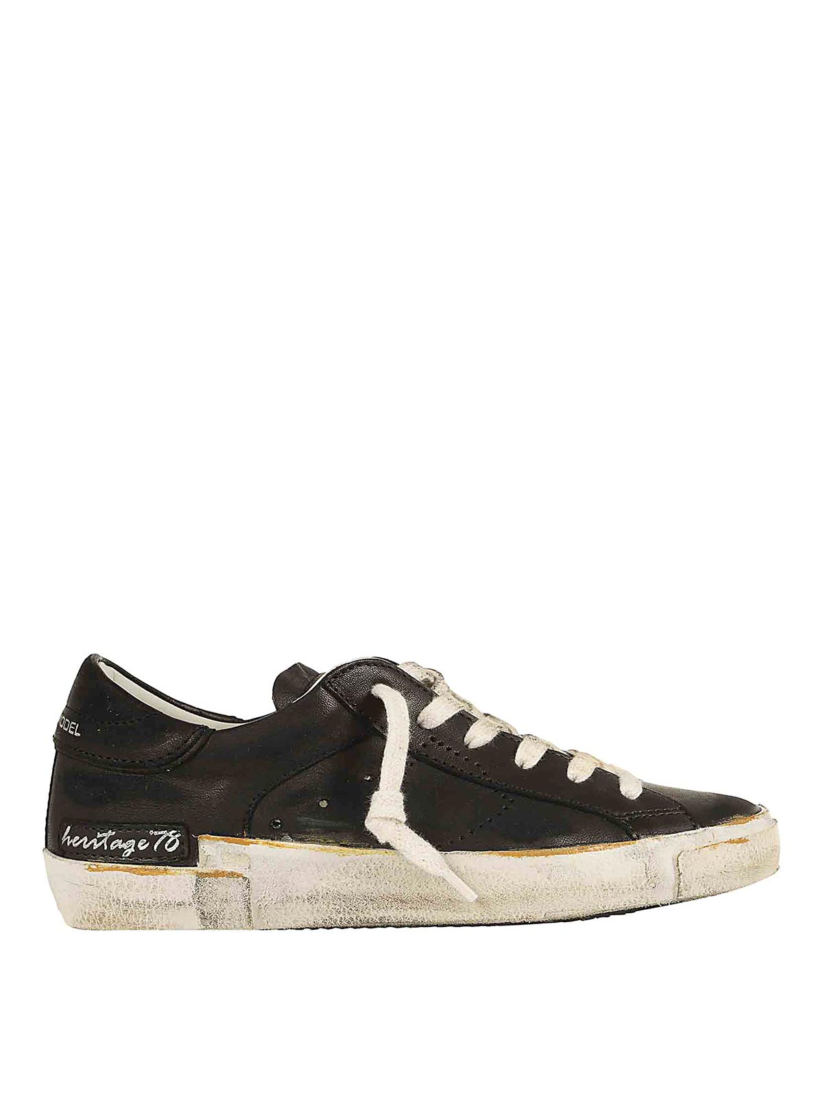 Philippe Modelの使い古した仕上げを施したカーフスキンとスエードのPrsxスニーカー。手縫いで汚れたディテールをあしらった超軽量ラバーソール、サイドシールドのディテール、背面に小さなパッチをあしらいました。