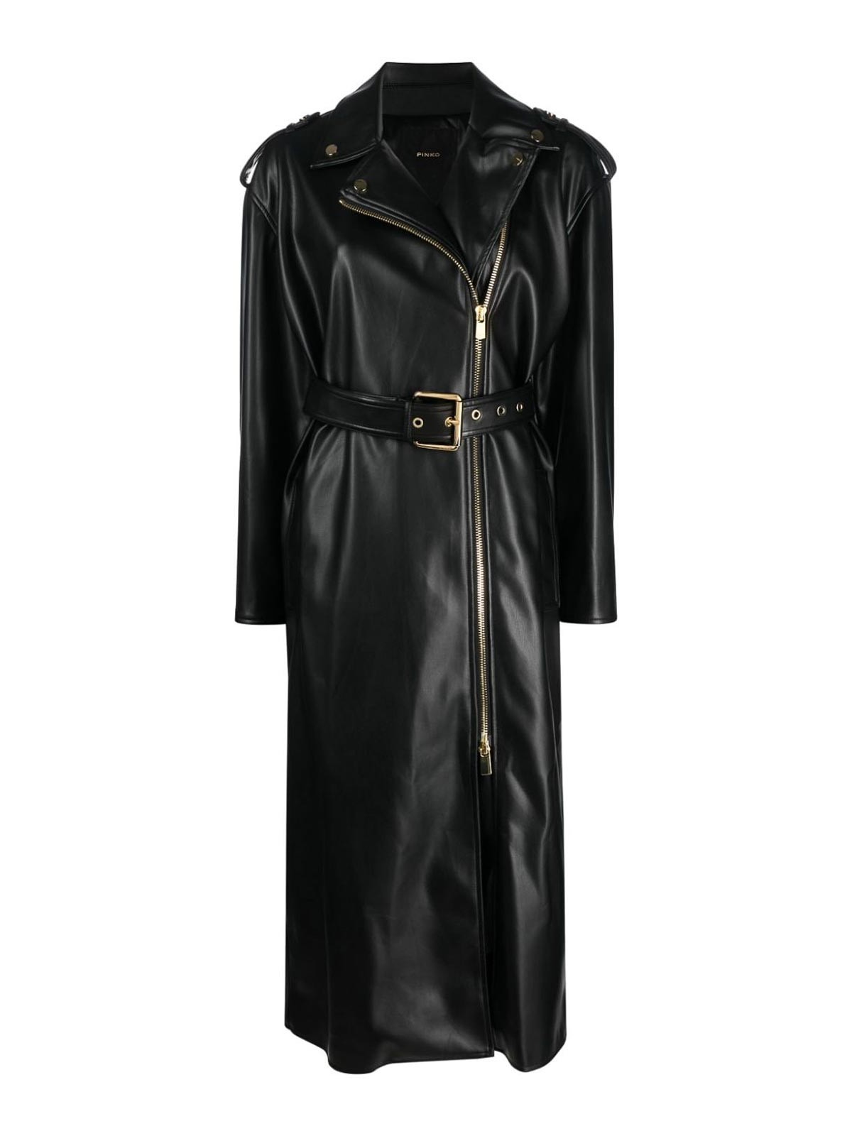 Pinkoのバイカーベルト付きトレンチコートは、黒のフェイクスムースグレインノッチドラペル、オフセンタージッパー、長袖、袖口、ジッパー、ベルト付きウエスト、2つのサイドスリットポケット、中央の背面通気口、ストレートヘム、膝下丈が特徴です。